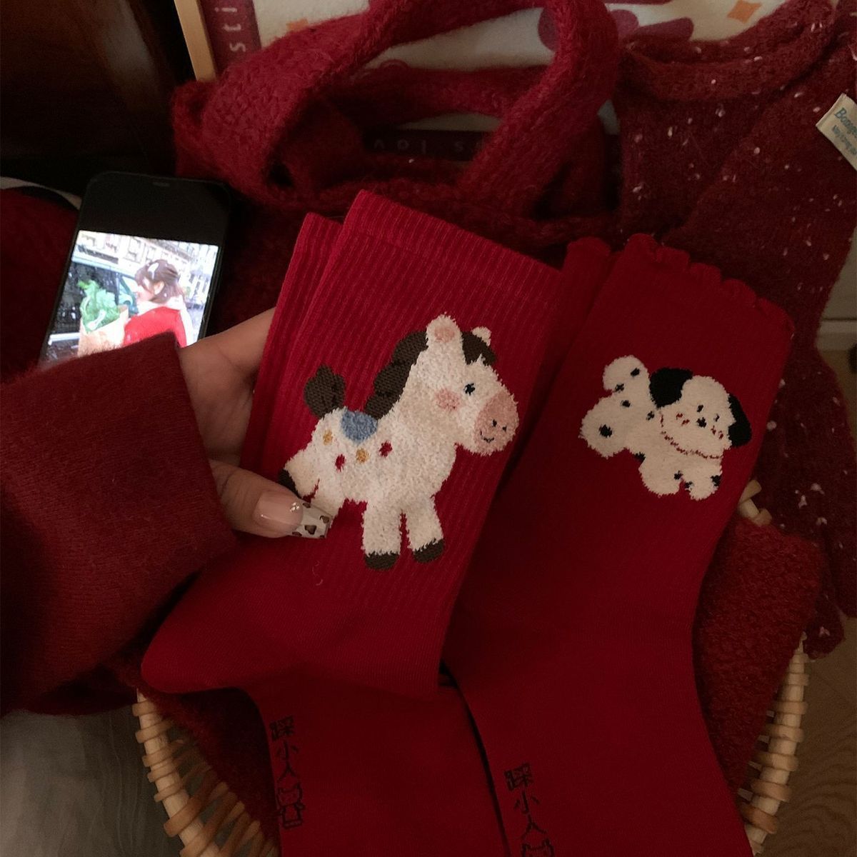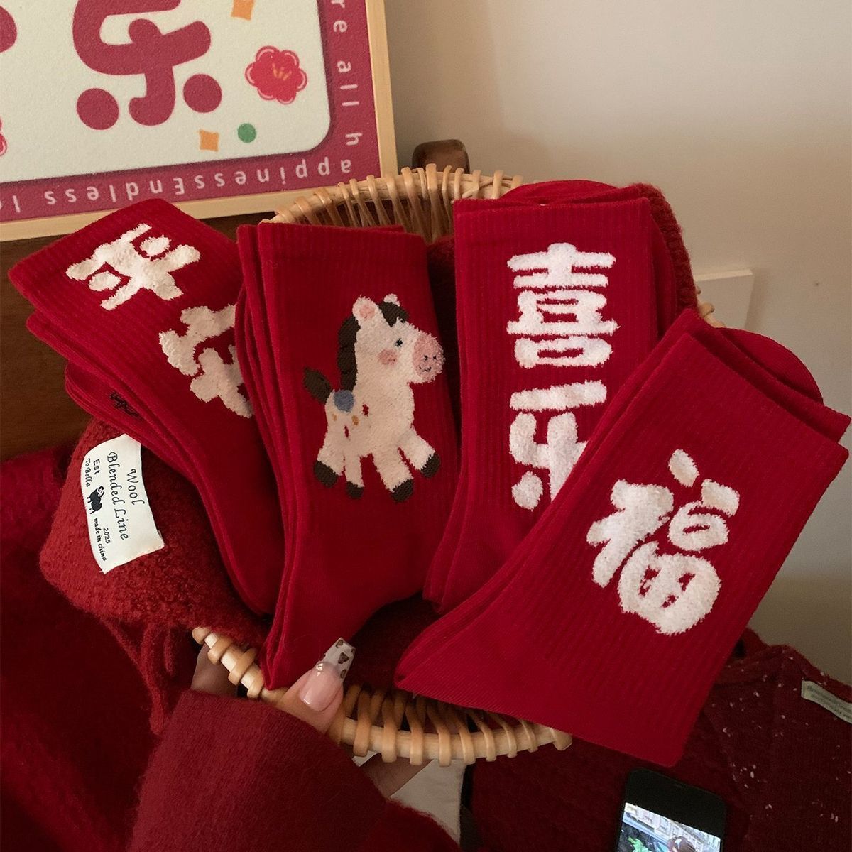 「4双装」福运本命年平安喜乐涤纶红袜子女秋冬季加厚保暖2026好运马年新年礼物配饰