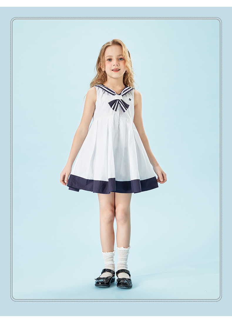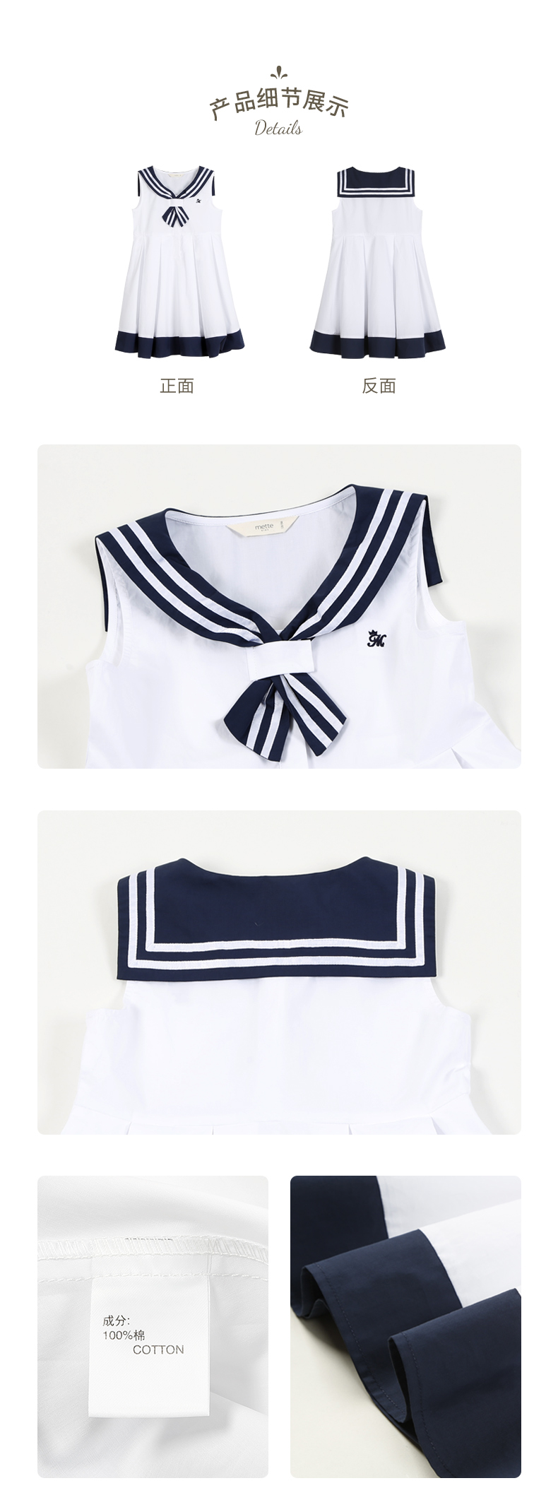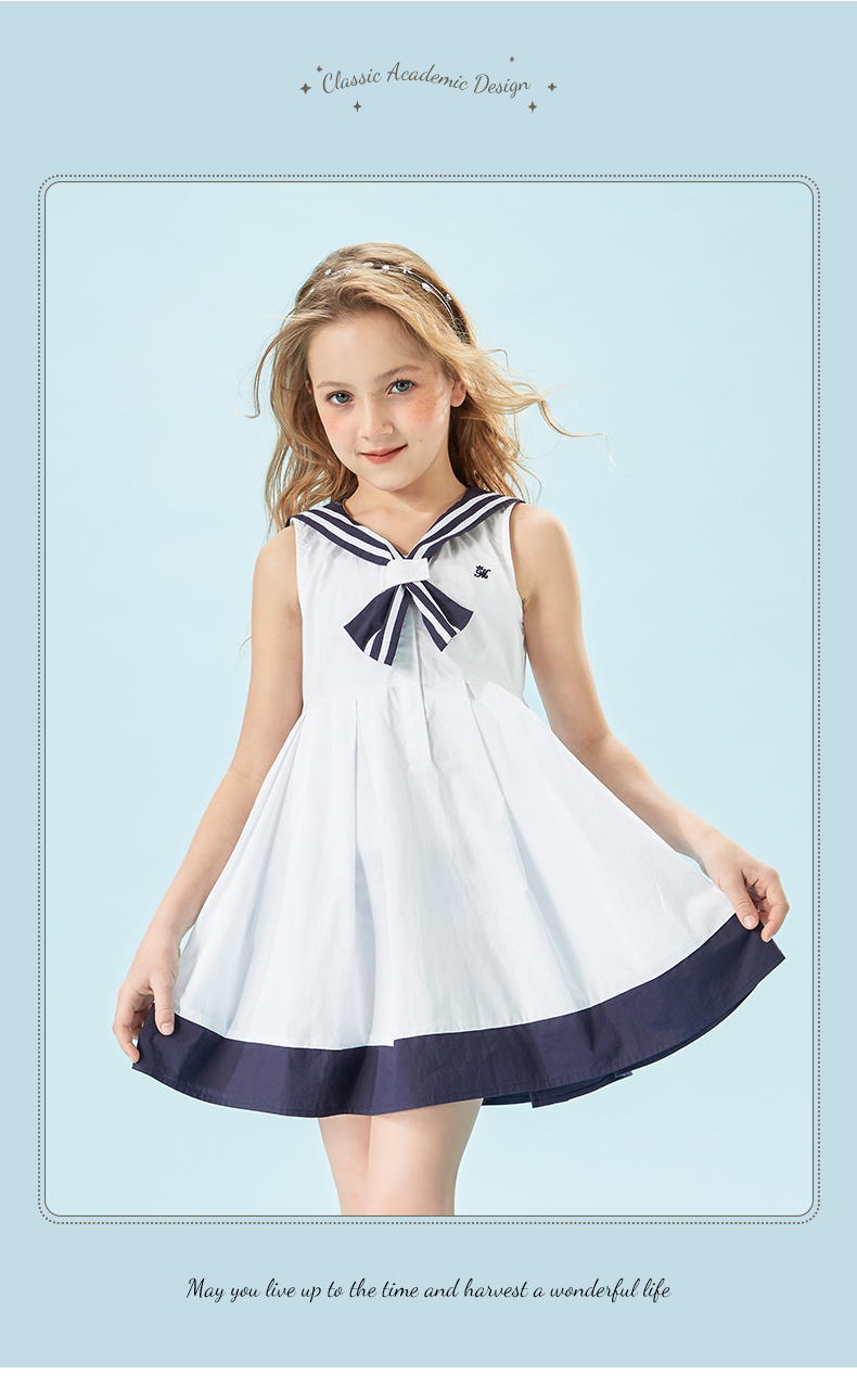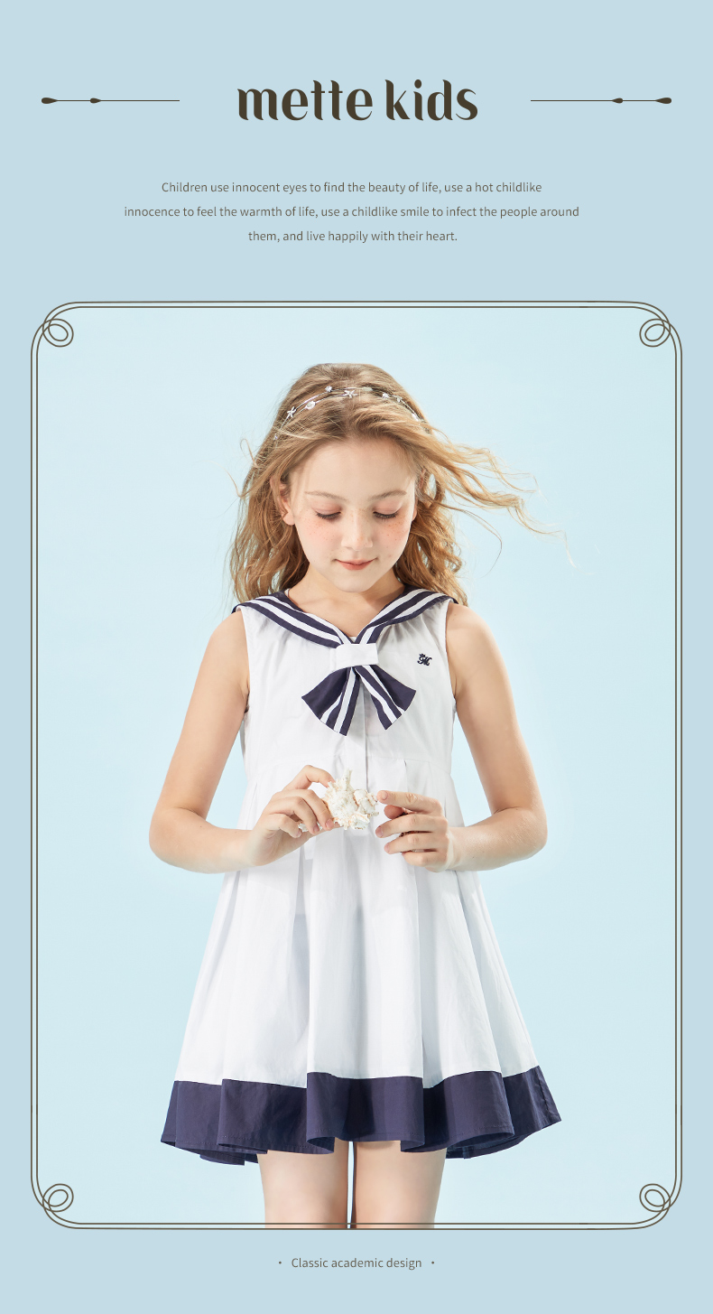 mettekids儿童裙子学院风女童时髦无袖连衣裙夏中大童纯棉长裙