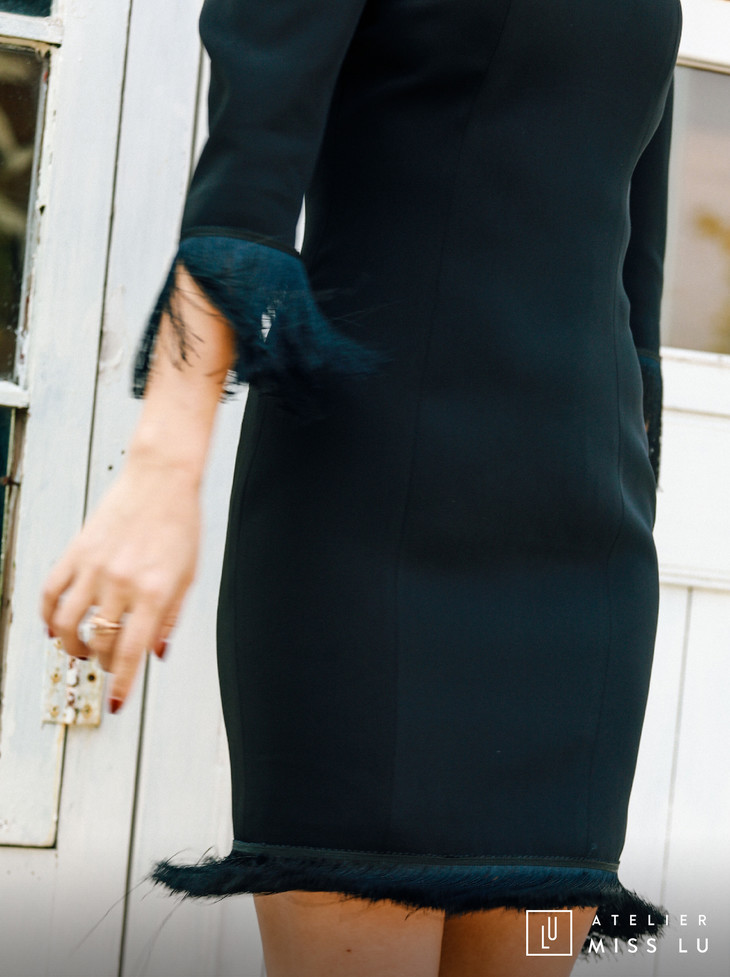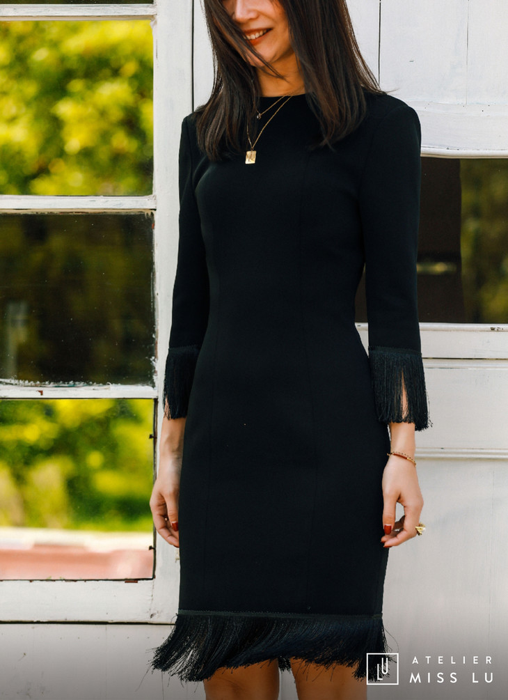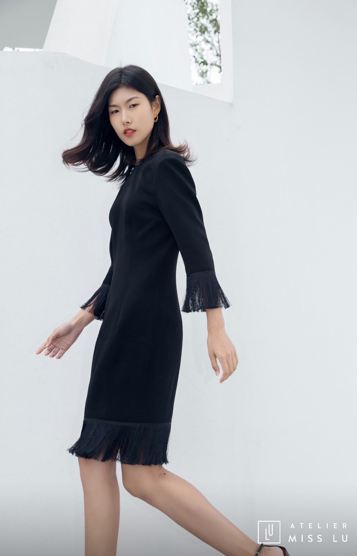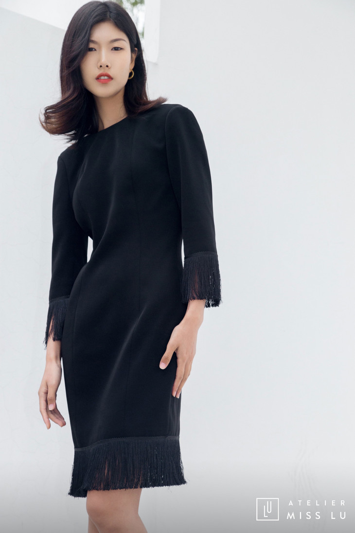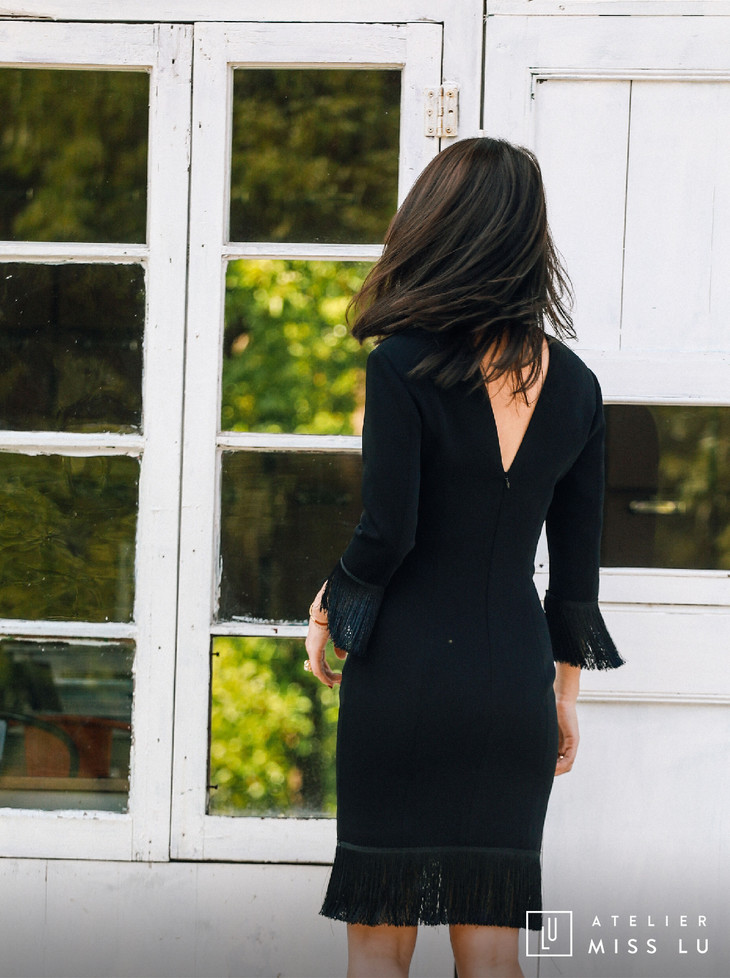 AtelierMissLu / Hera-黑色袖口下摆流苏装饰连身裙