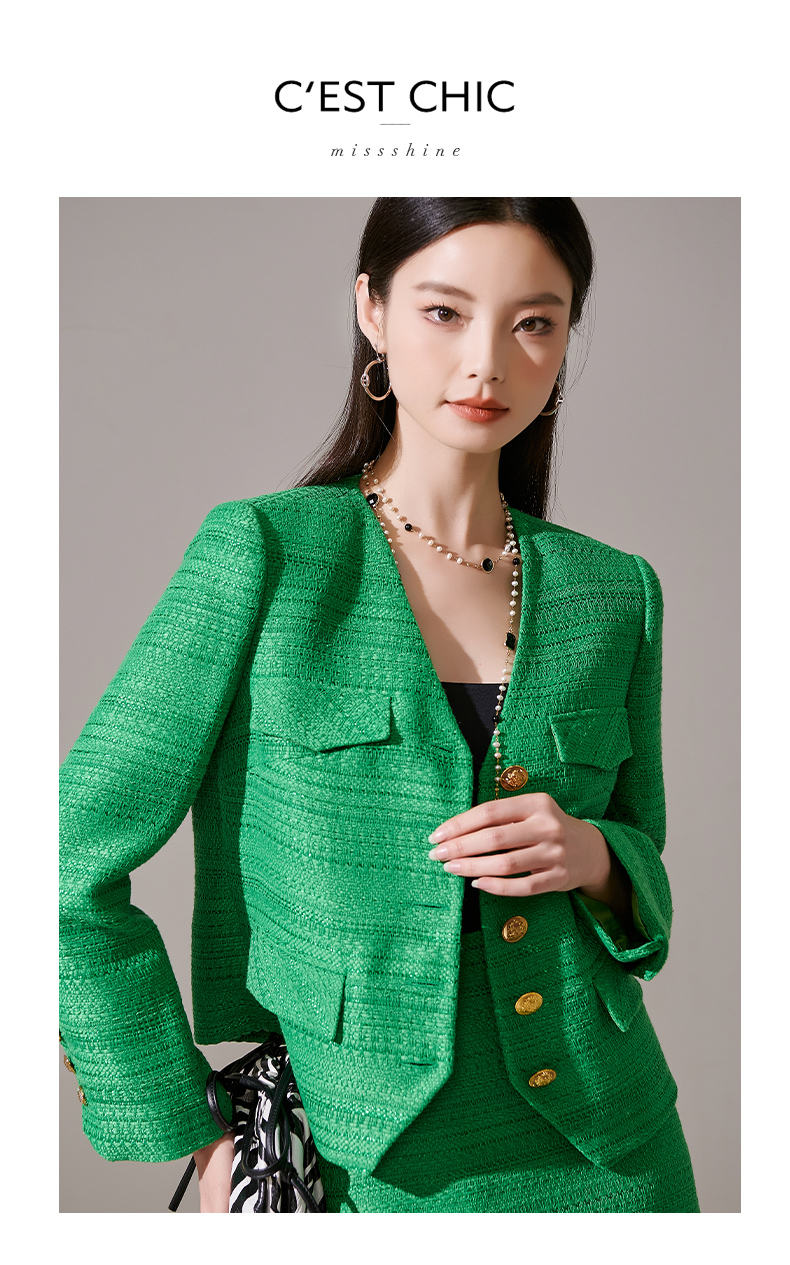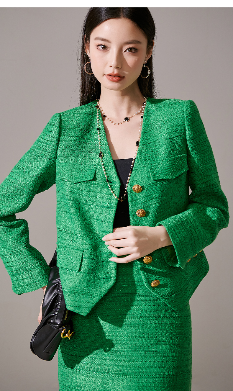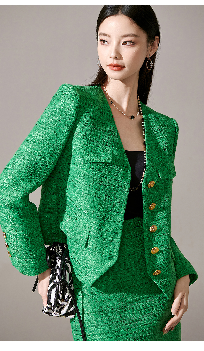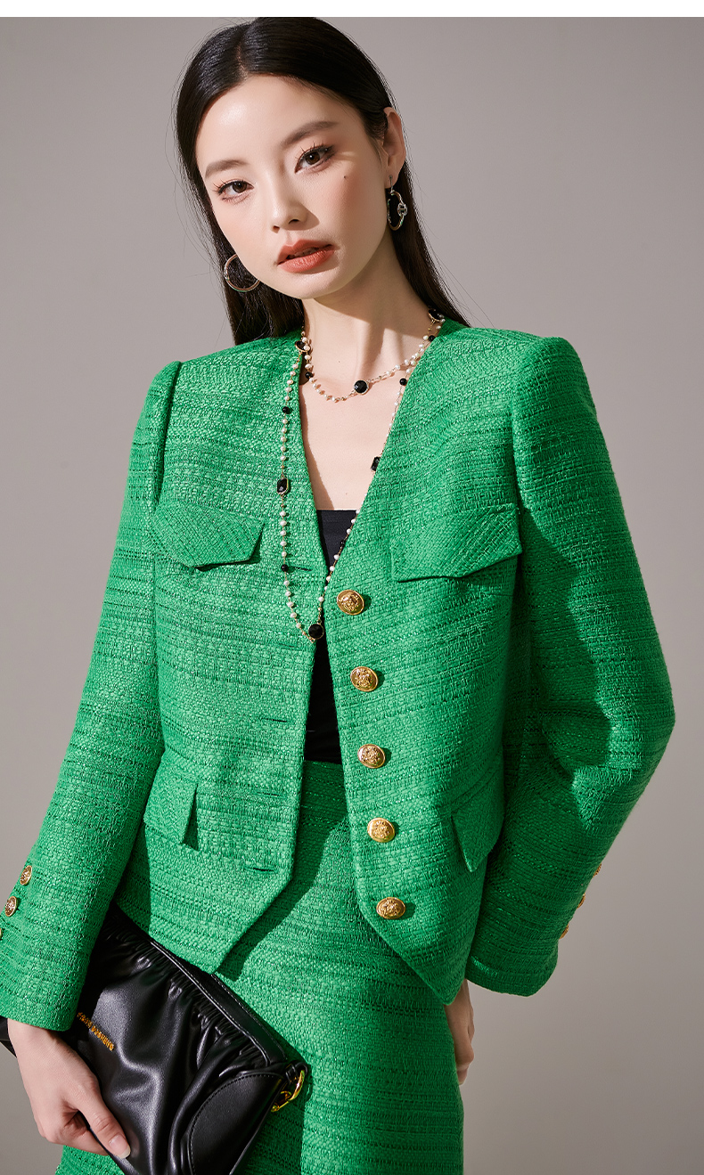 剩M 芳外优雅绿色小香风套装 单排扣短外套+流苏半裙两件套女1656