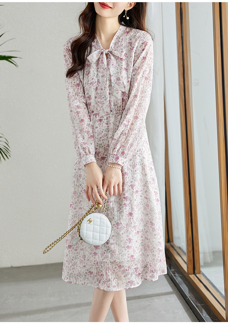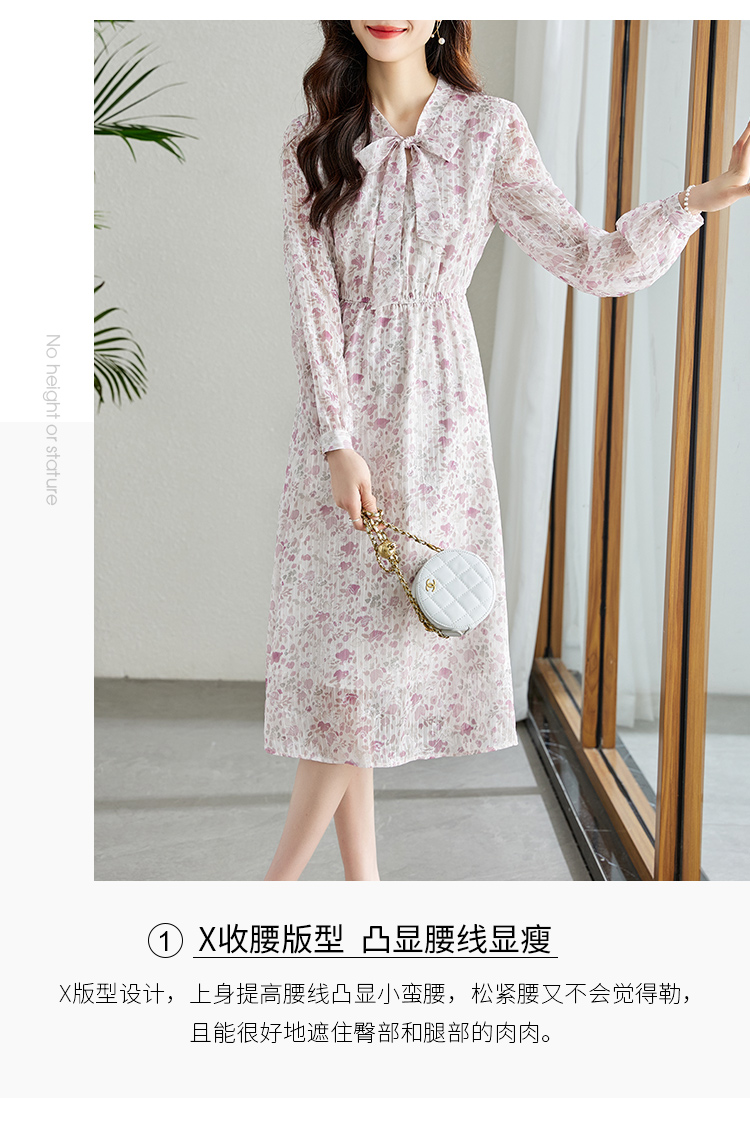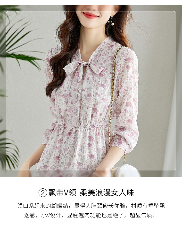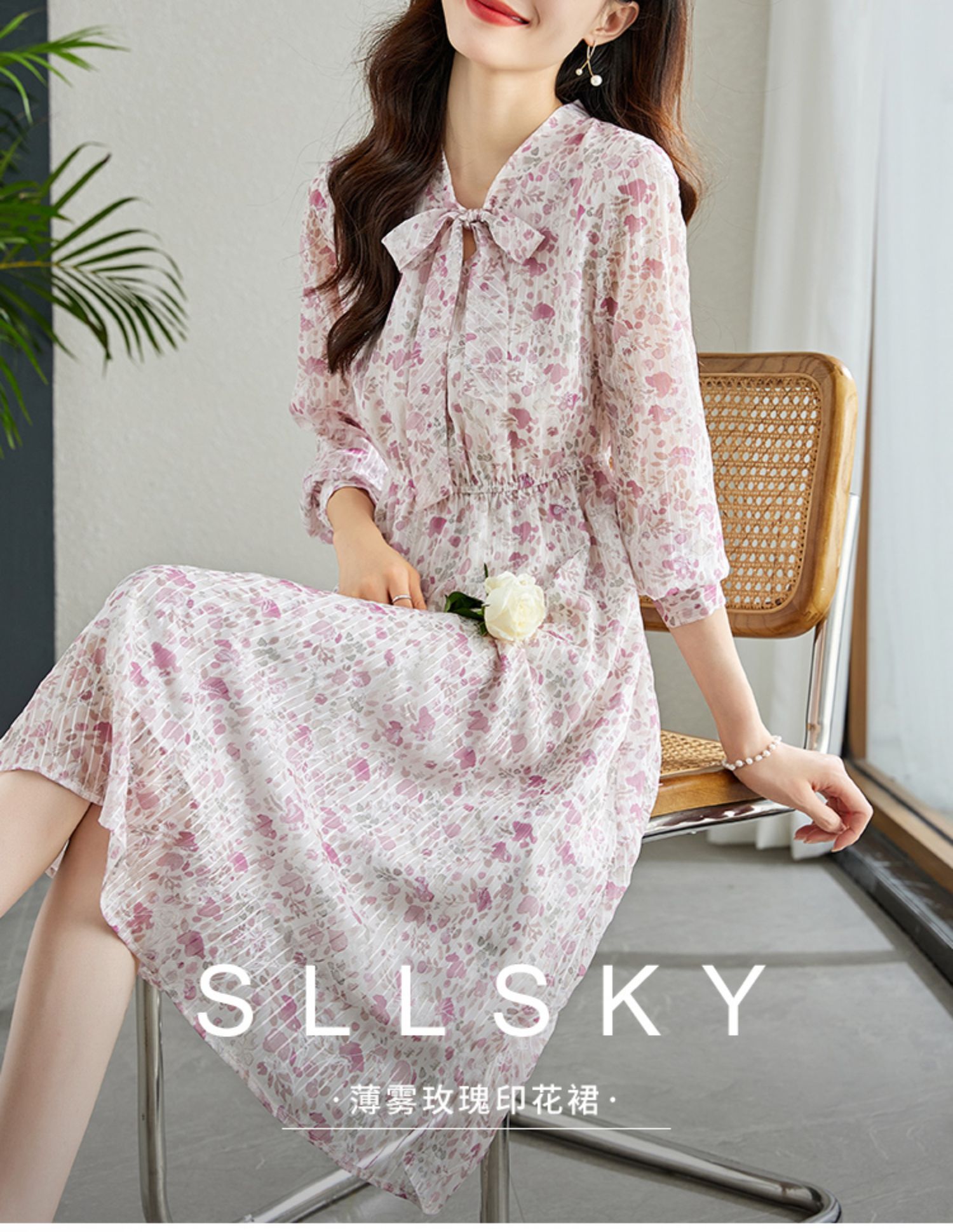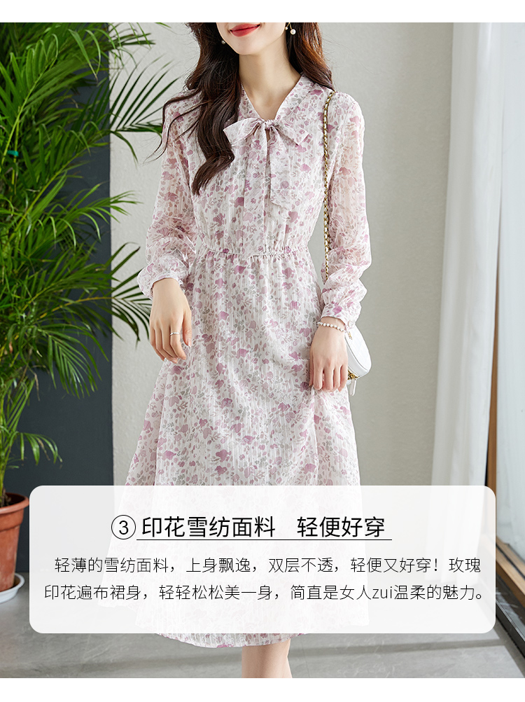 【专属特价】熙世界薄雾玫瑰碎花连衣裙女长袖秋新款浪漫飘带V领收腰雪纺裙子