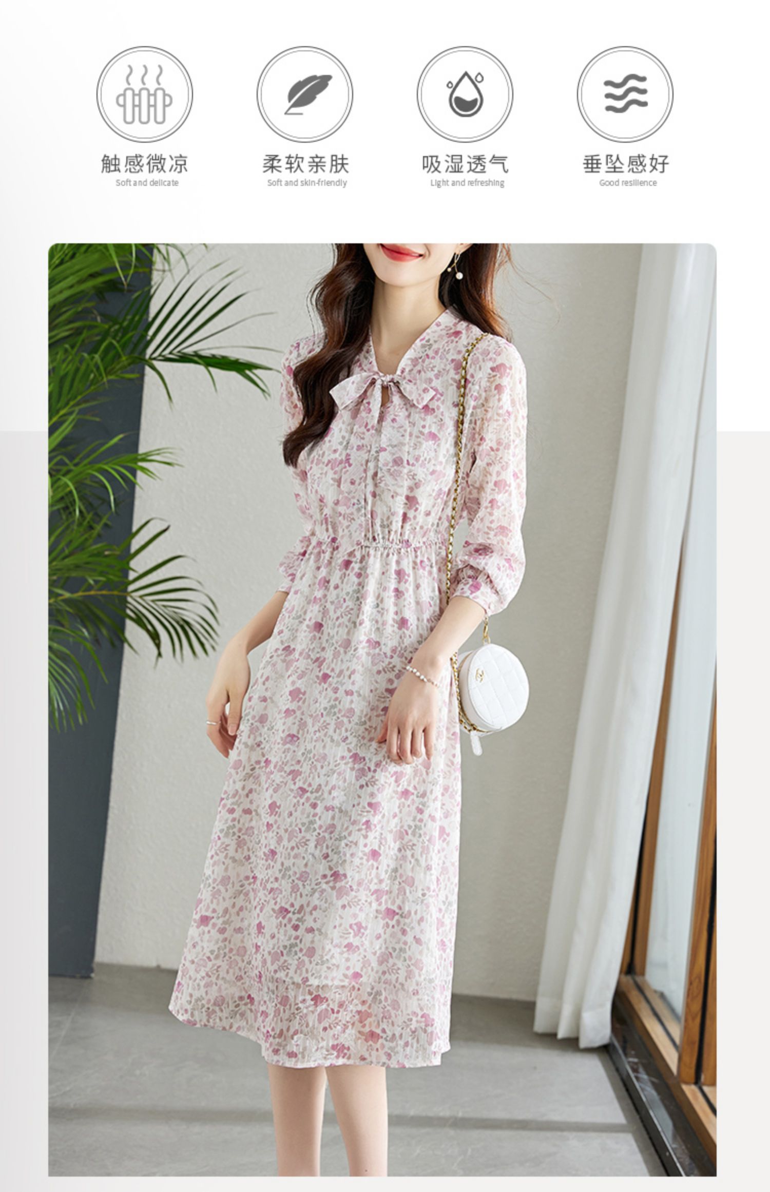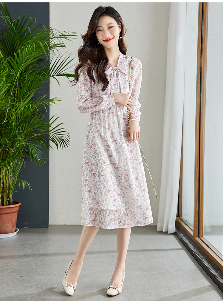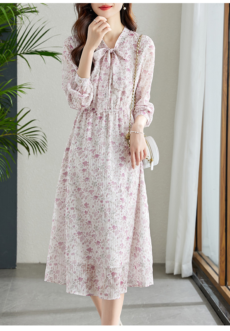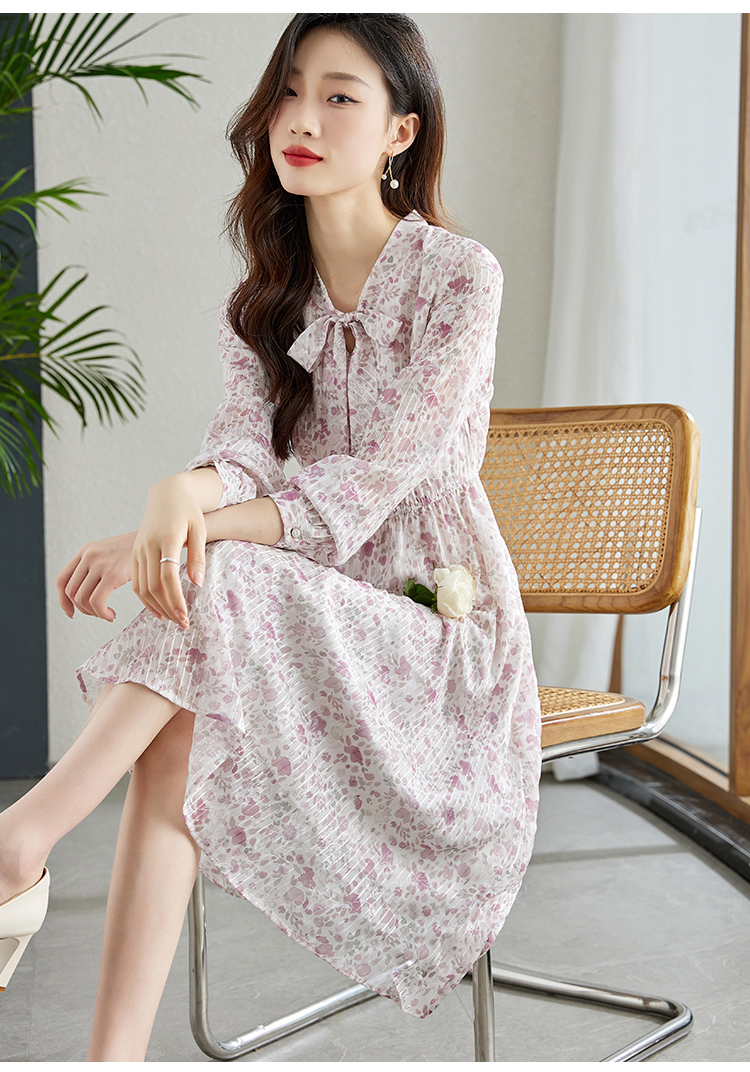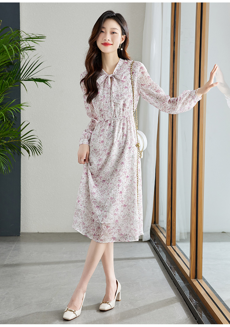 【专属特价】熙世界薄雾玫瑰碎花连衣裙女长袖秋新款浪漫飘带V领收腰雪纺裙子
