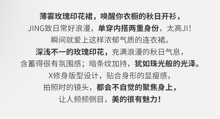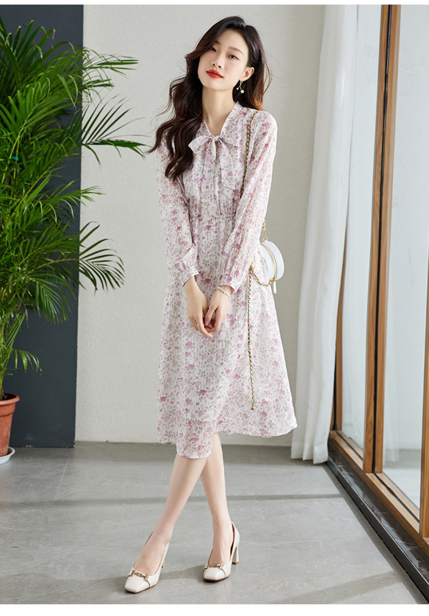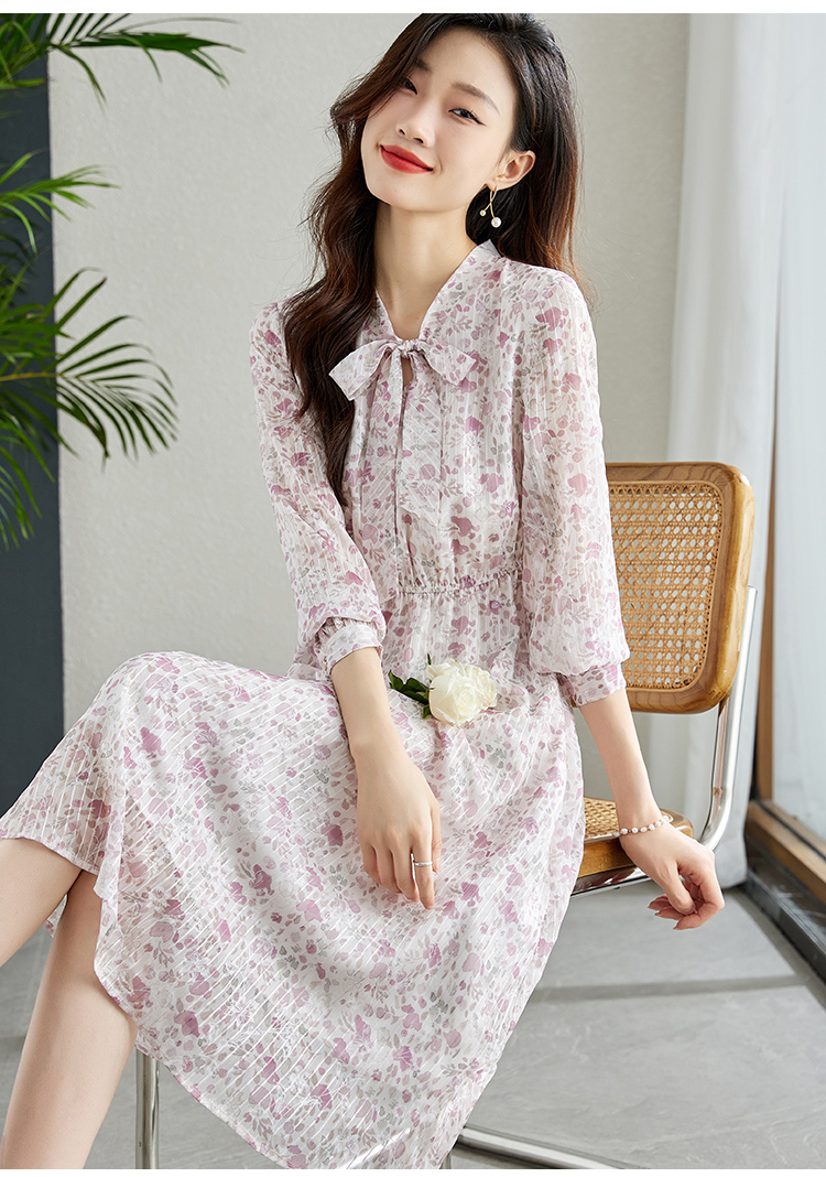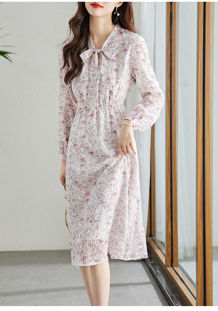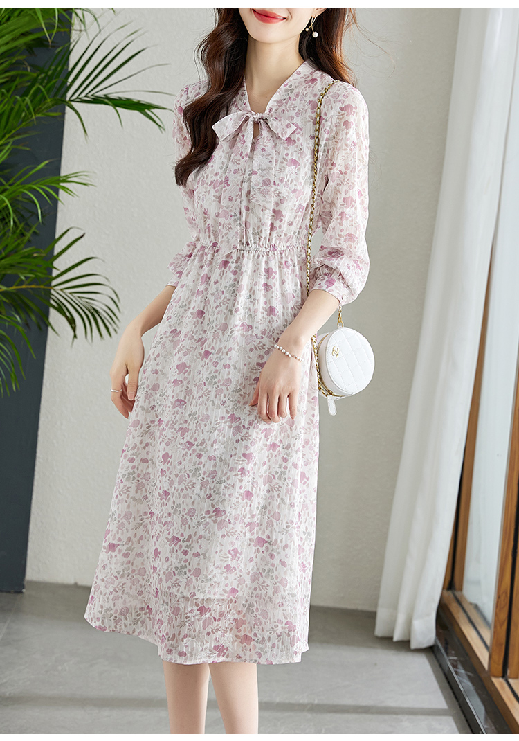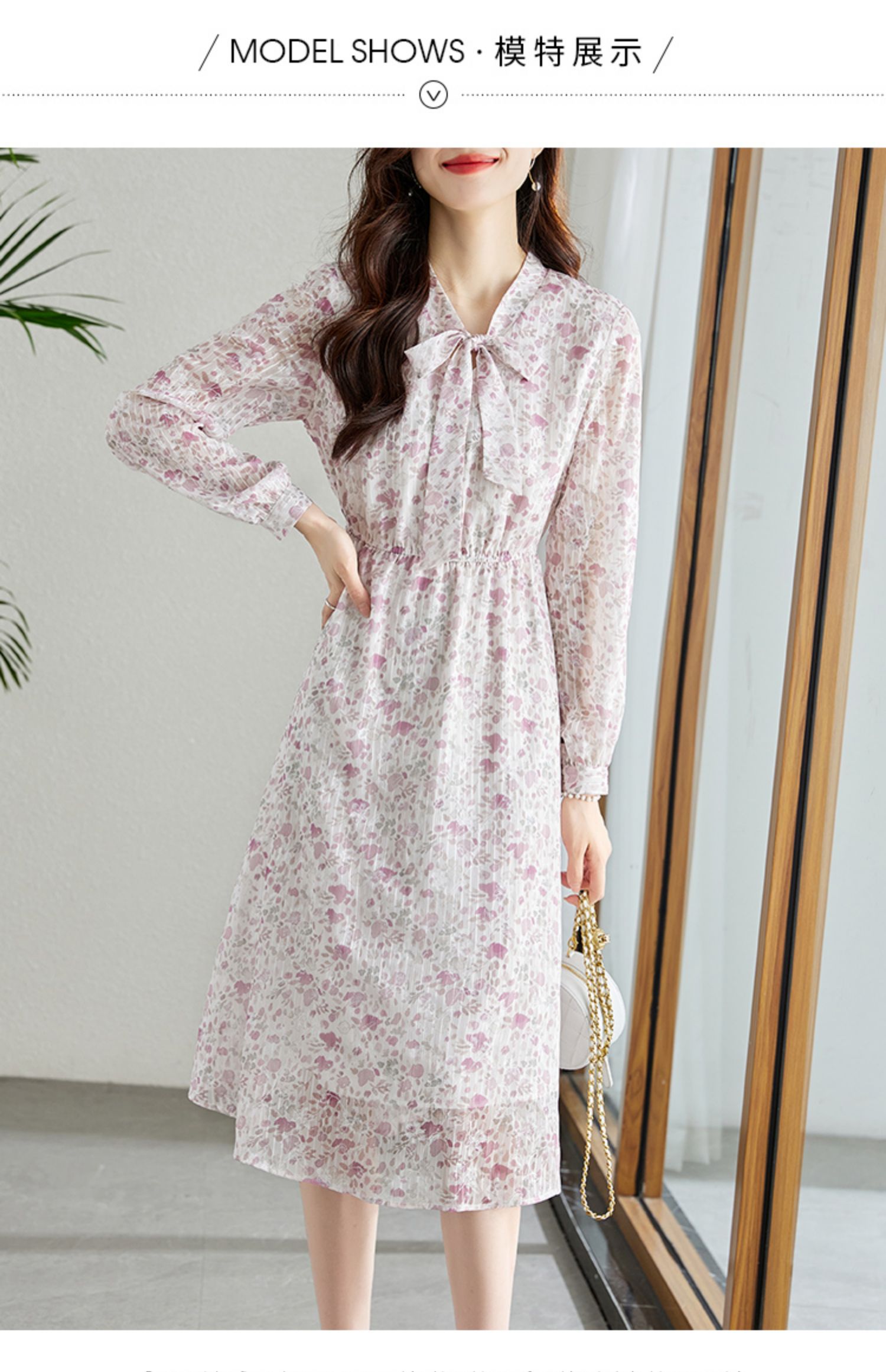 【专属特价】熙世界薄雾玫瑰碎花连衣裙女长袖秋新款浪漫飘带V领收腰雪纺裙子
