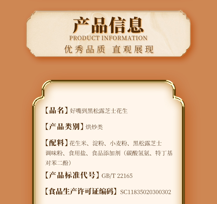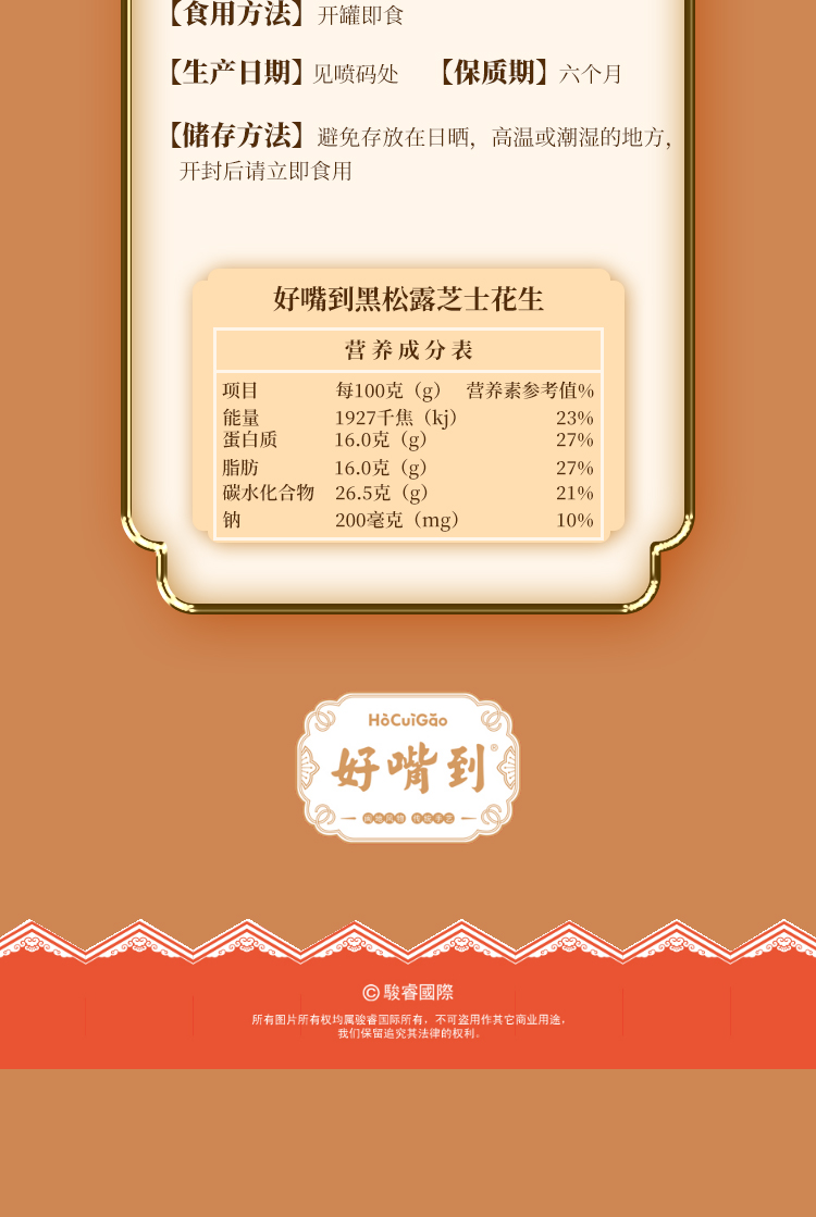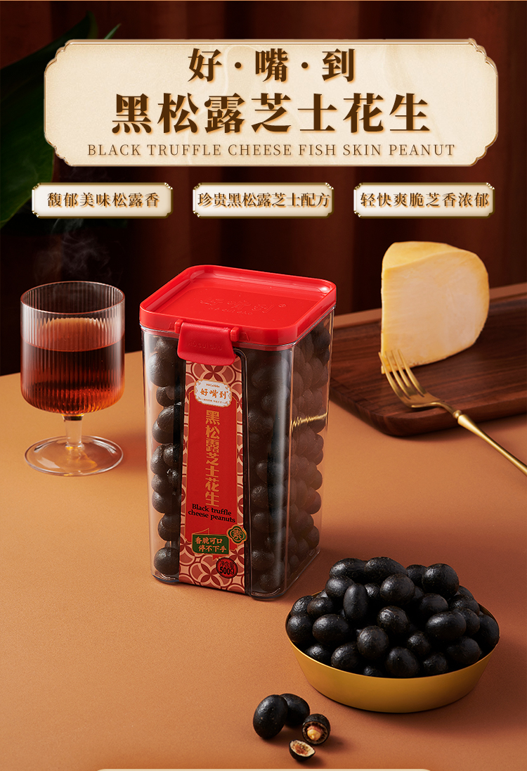 【特点】是用整颗的黑松露下去研磨粉(非市面上的合成黑松露粉),再和芝士粉裹一起,融合花生表面,小火慢烤(非油炸),醇香酥脆。快递:默认发京东快递