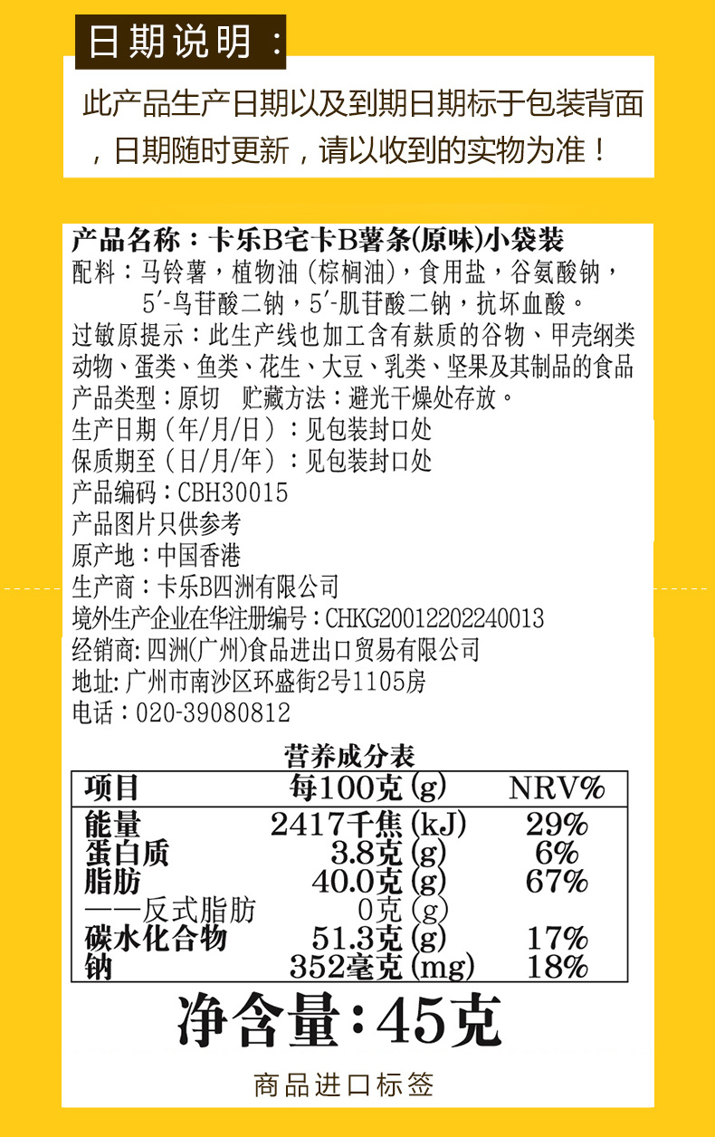 卡乐B薯条原味45克*3包