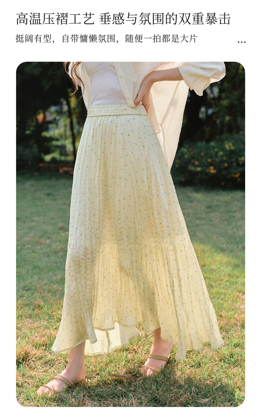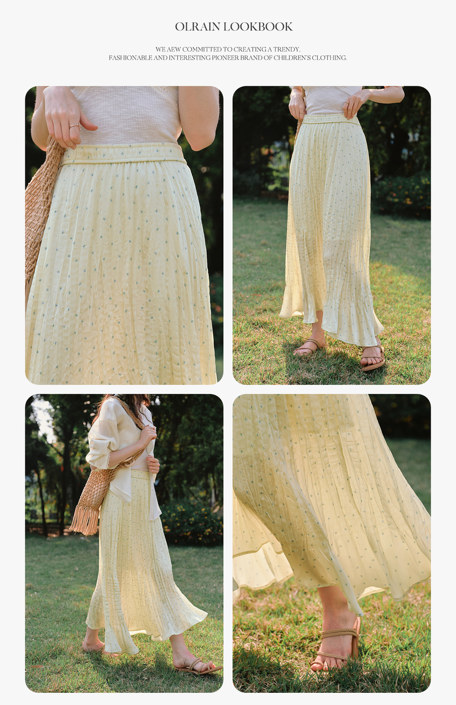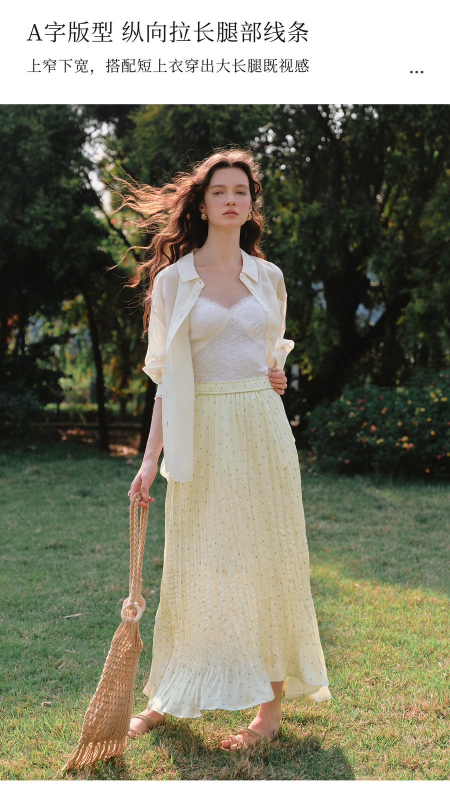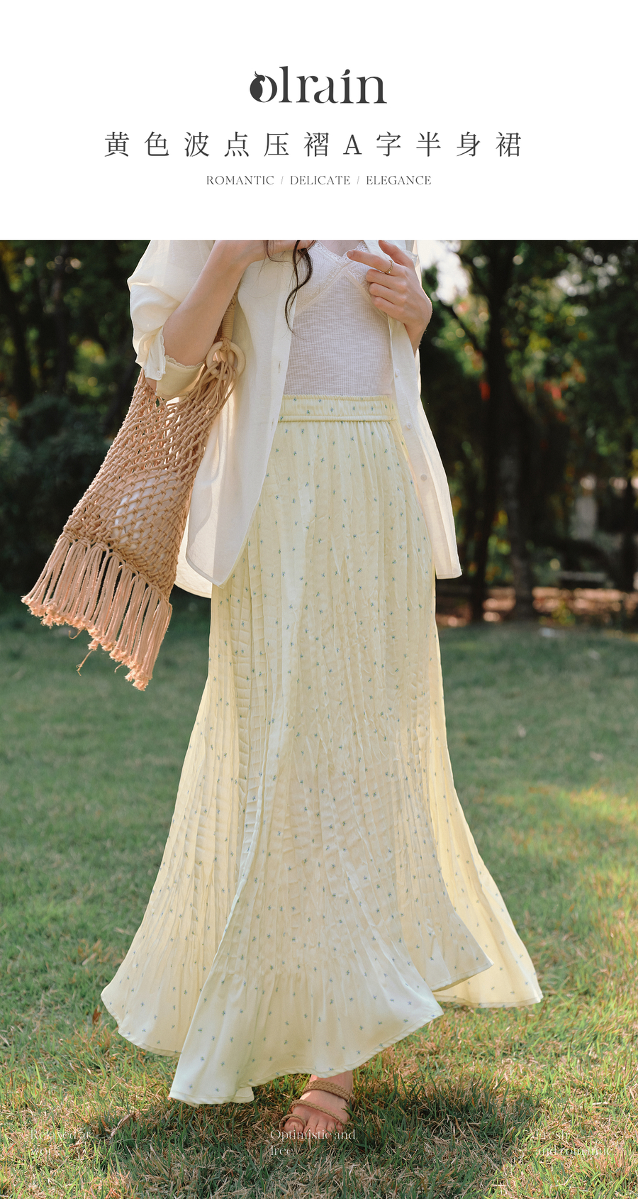 OLrain欧芮儿黄色波点压褶A字半身裙夏季2025新款高腰气质中长裙