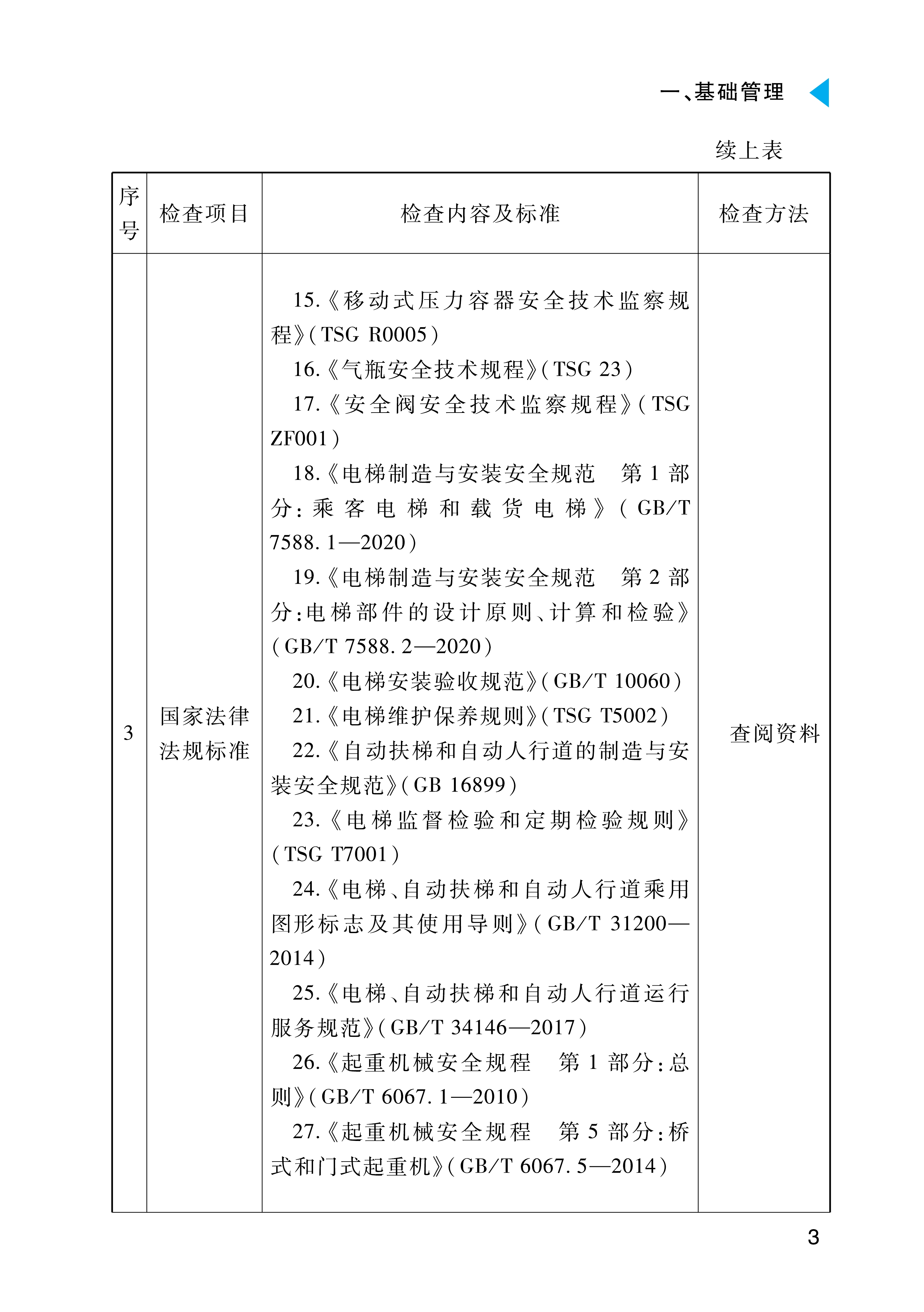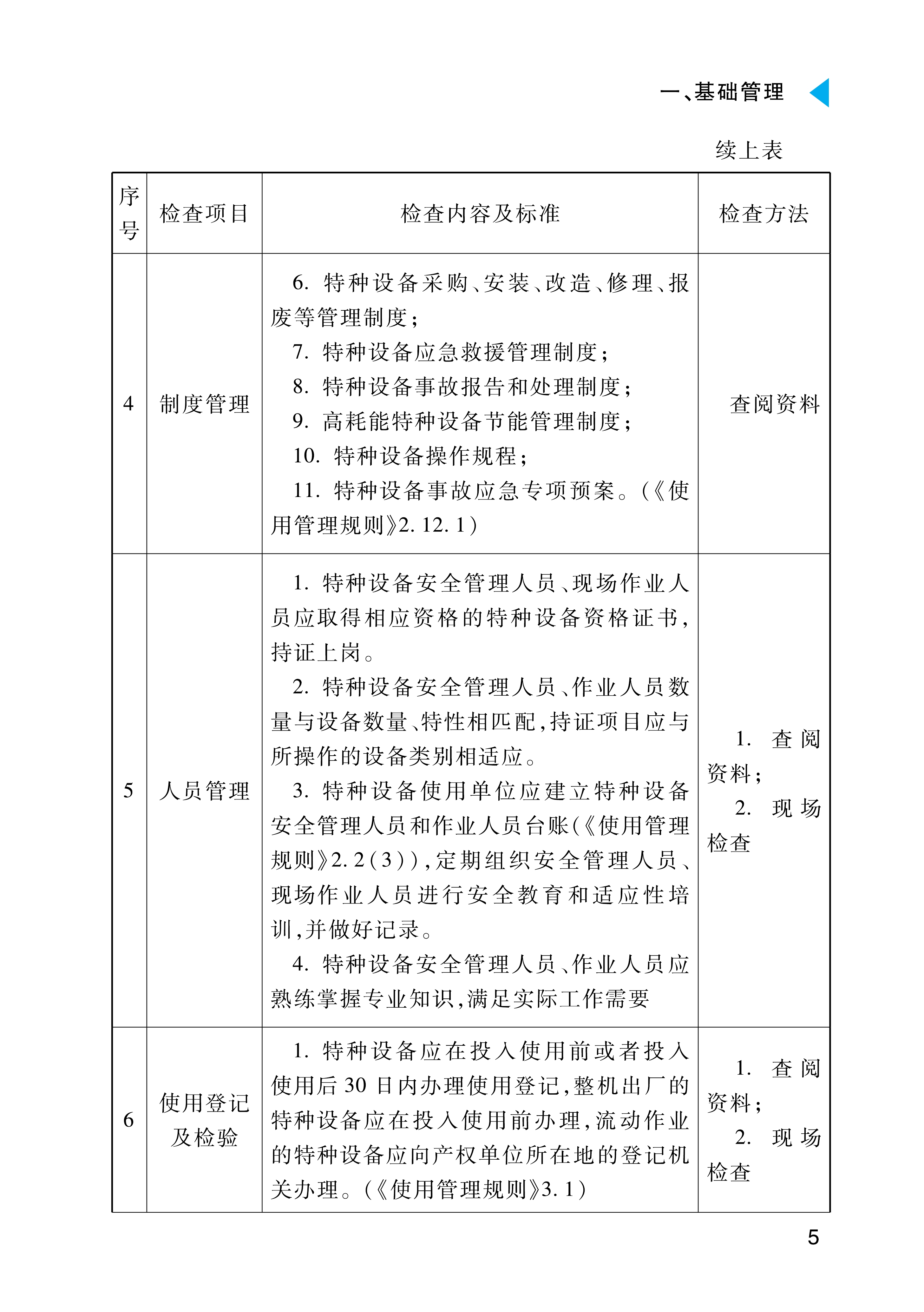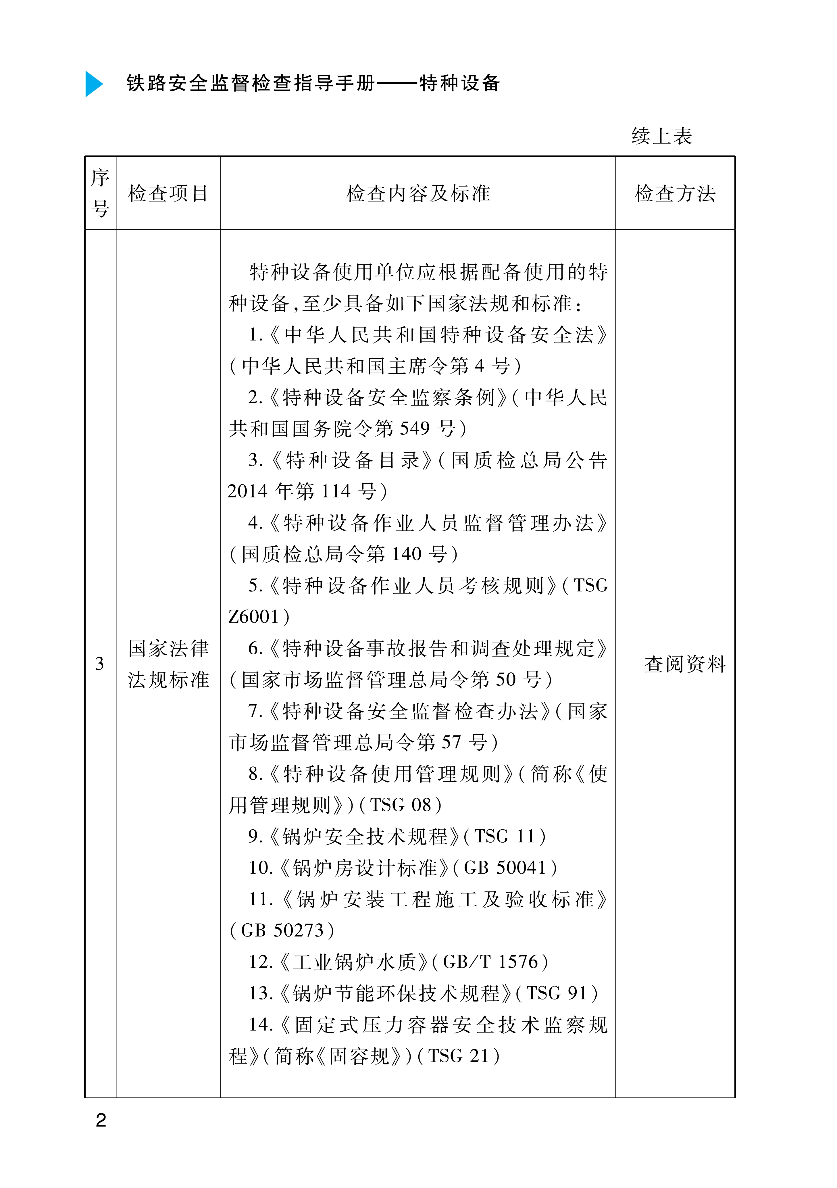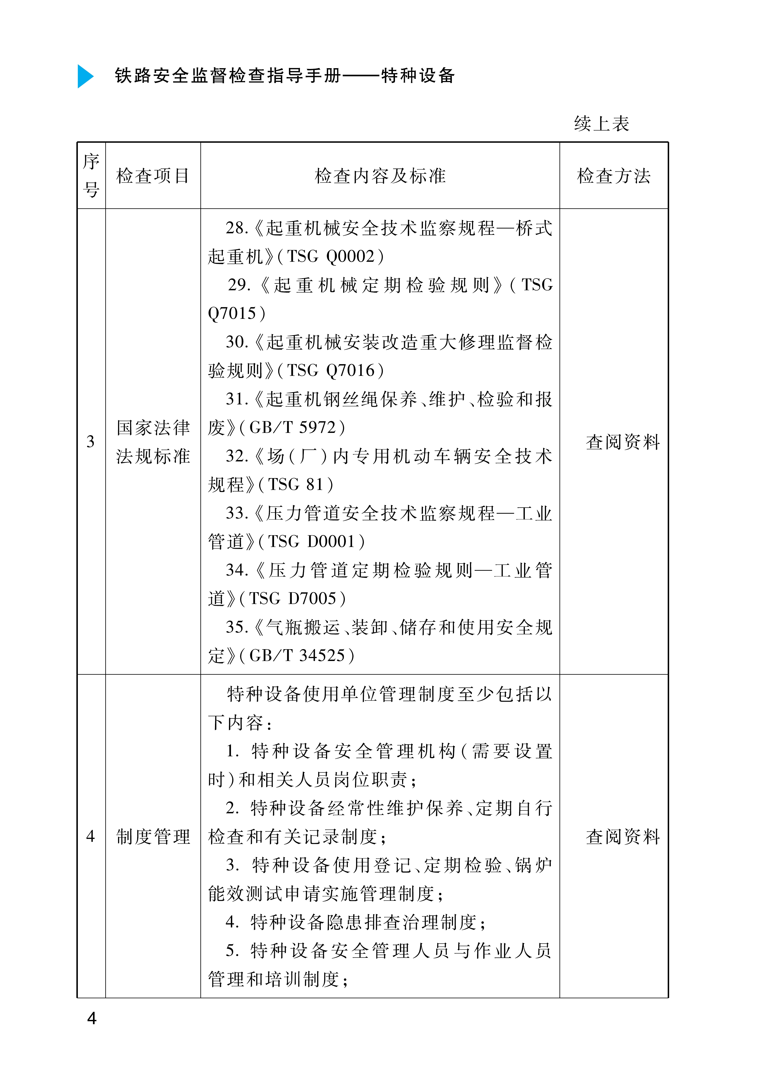 本书是铁路安全监督检查指导手册之一,本书为特种设备分册。本书规定了特种设备的检查内容、检查标准和检查方法,标准内容包括基础管理检查内容、标准,锅炉检查内容、标准,固定式压力容器检查内容、标准,移动式压力容器检查内容、标准,压力管道(工业管道)检查内容、标准,气瓶检查内容、标准,电梯检查内容、标准,自动扶梯和自动人行道检查内容、标准,起重机械检查内容、标准,厂内专用机动车辆检查内容、标准,共10部分。