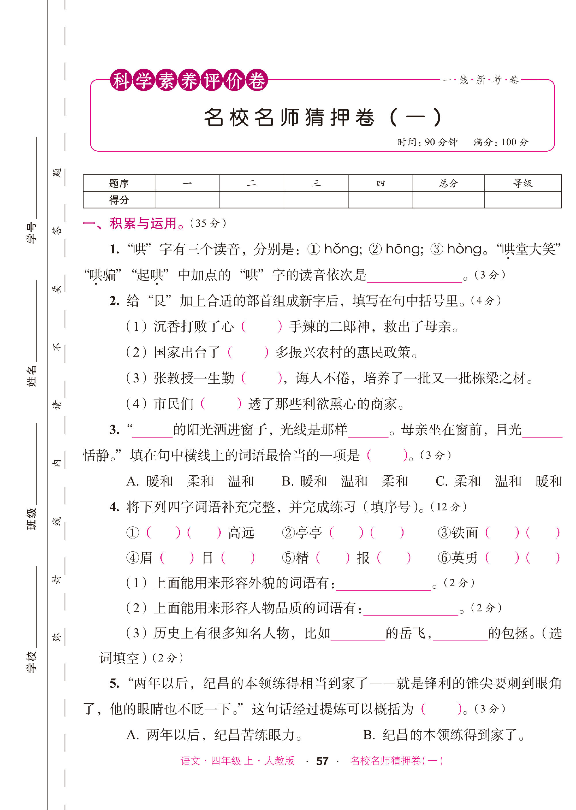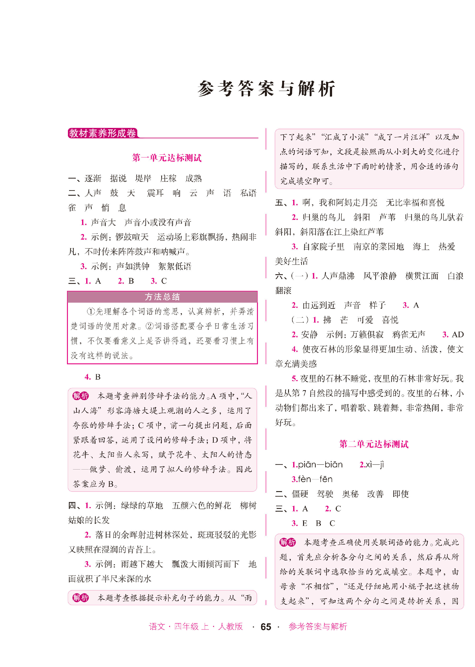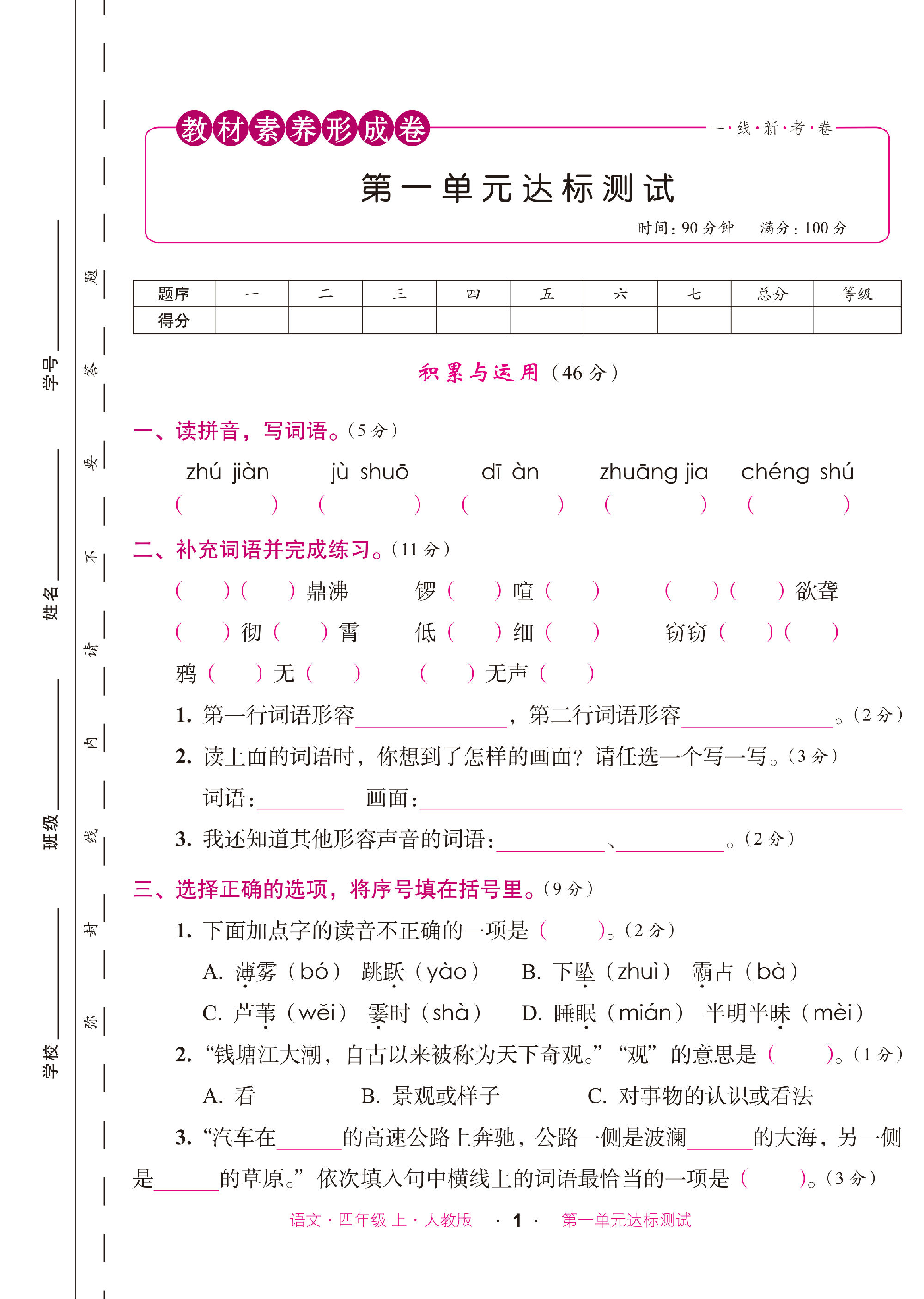 《小学语文素养新考卷(4上人教版)》与人教版四年级上册课本相配套,紧扣“素养”二字,将全书分为“教材素养形成”“关键能力提升”“学科素养评价”和“参考答案与解析”四个部分。第一部分为单元测试,共8套,每单元一套试卷,每套试卷按“积累与运用”“阅读理解”“习作表达”三个板块编排。“积累与运用”主要考查本单元的拼音、字、词、句等基础知识与涉及的文学常识、综合性学习等相关知识。“阅读理解”包含两部分内容“课内语段、课外阅读”;“习作表达”除主要写作外,还可以考查口语交际方面的内容;第二部分有有四套试卷,分别为“字词与句子”“积累运用与课文内容”“阅读理解”“口语交际、综合性学习与习作表达”;第三部分为期末试卷,分别为两套“期末质量检测与验收卷”和两套“名校名师猜押卷”;第四部分是参考答案与解析,除给出详细答案外,还将部分易错或重难点题进行了解析。并在本部分并穿插了“方法总结”“答题格式”“知识拓展”三个模块。