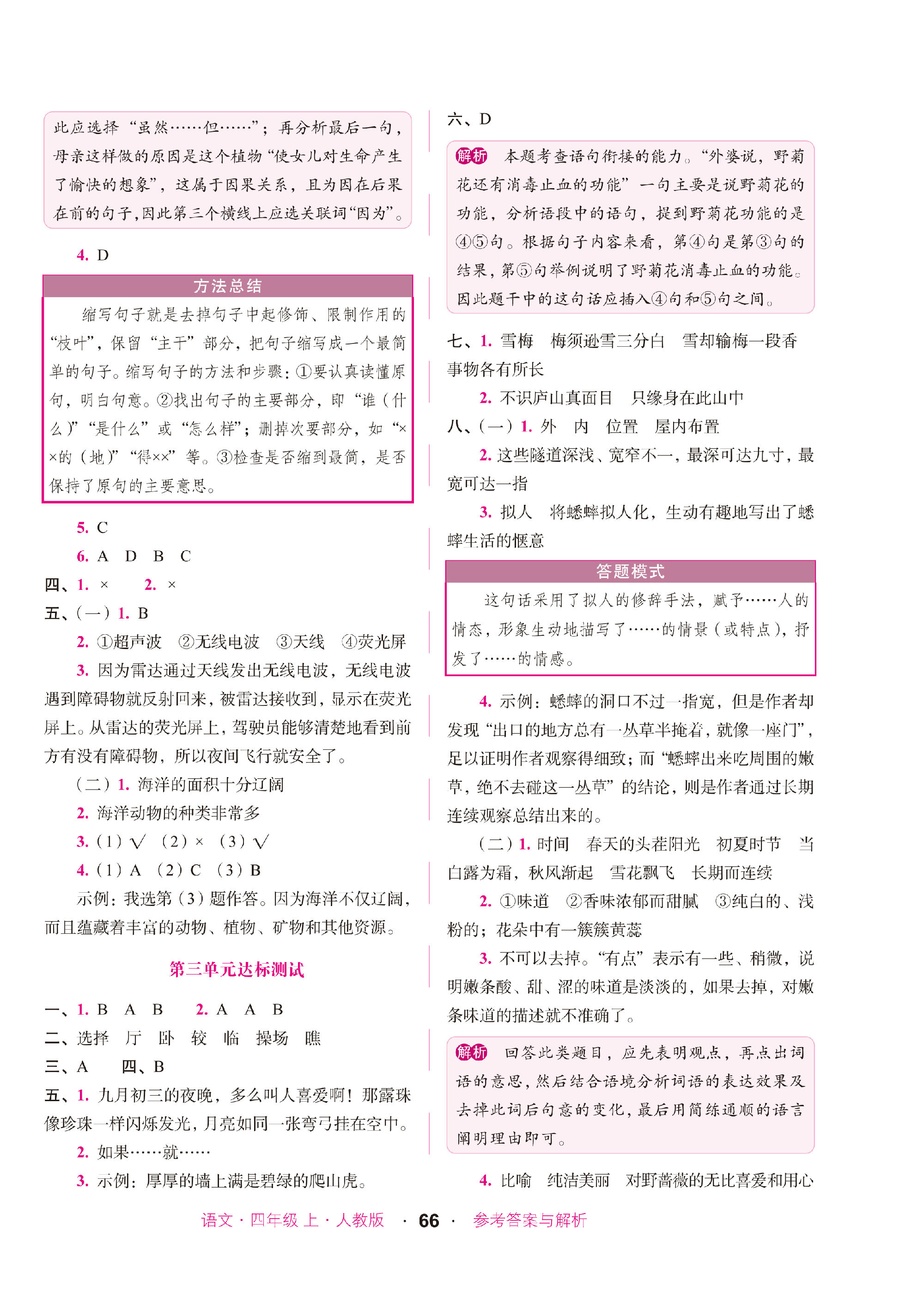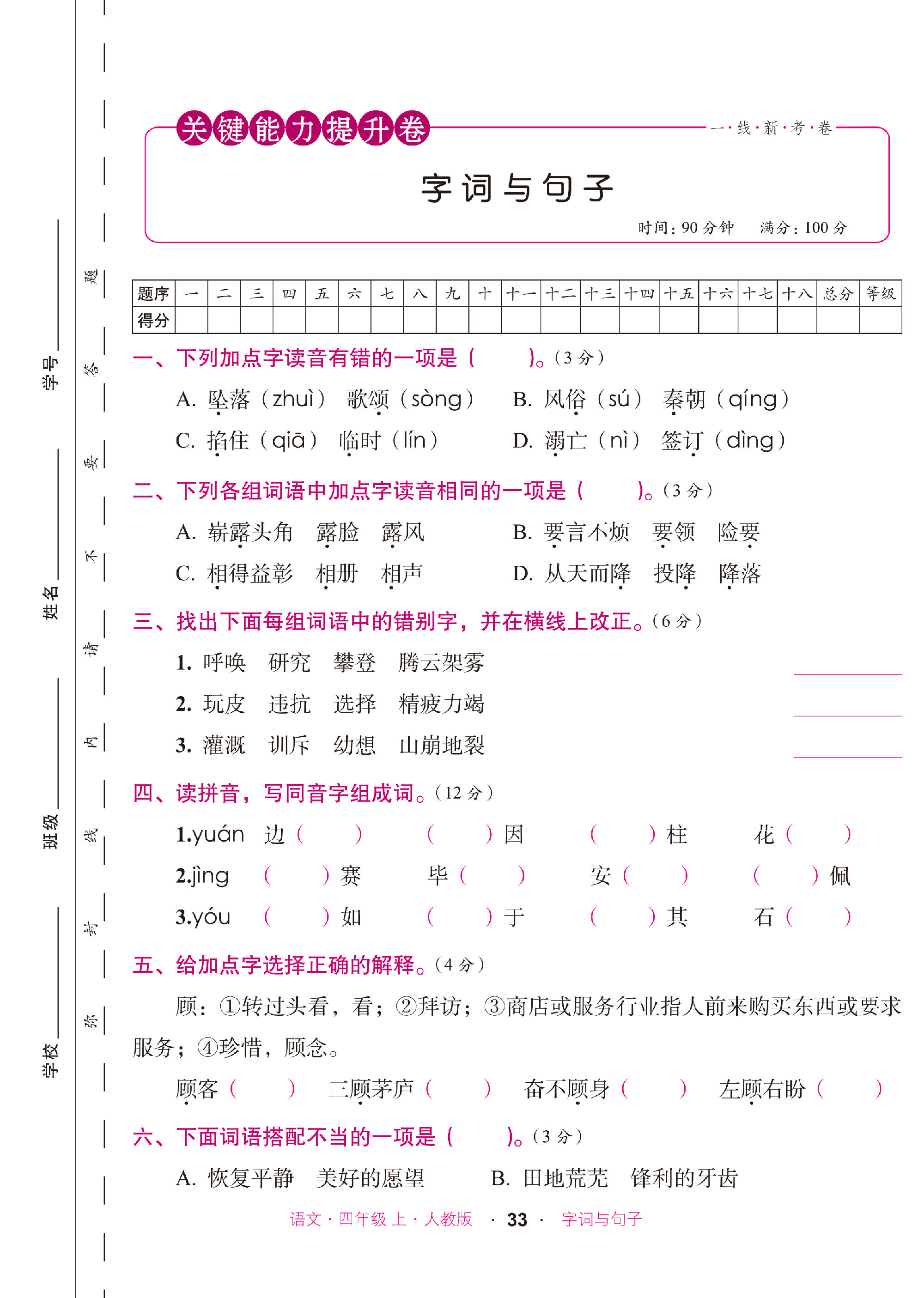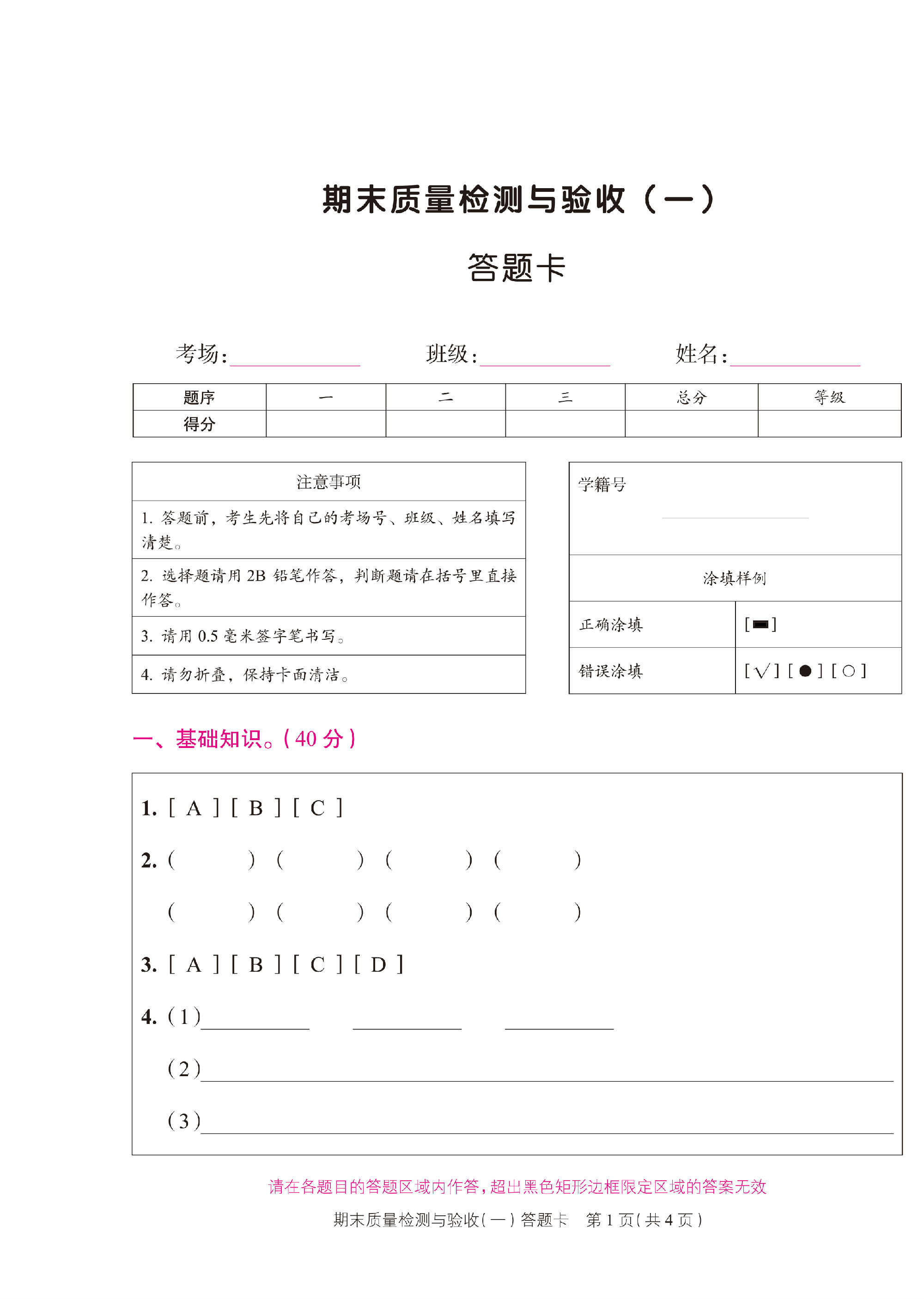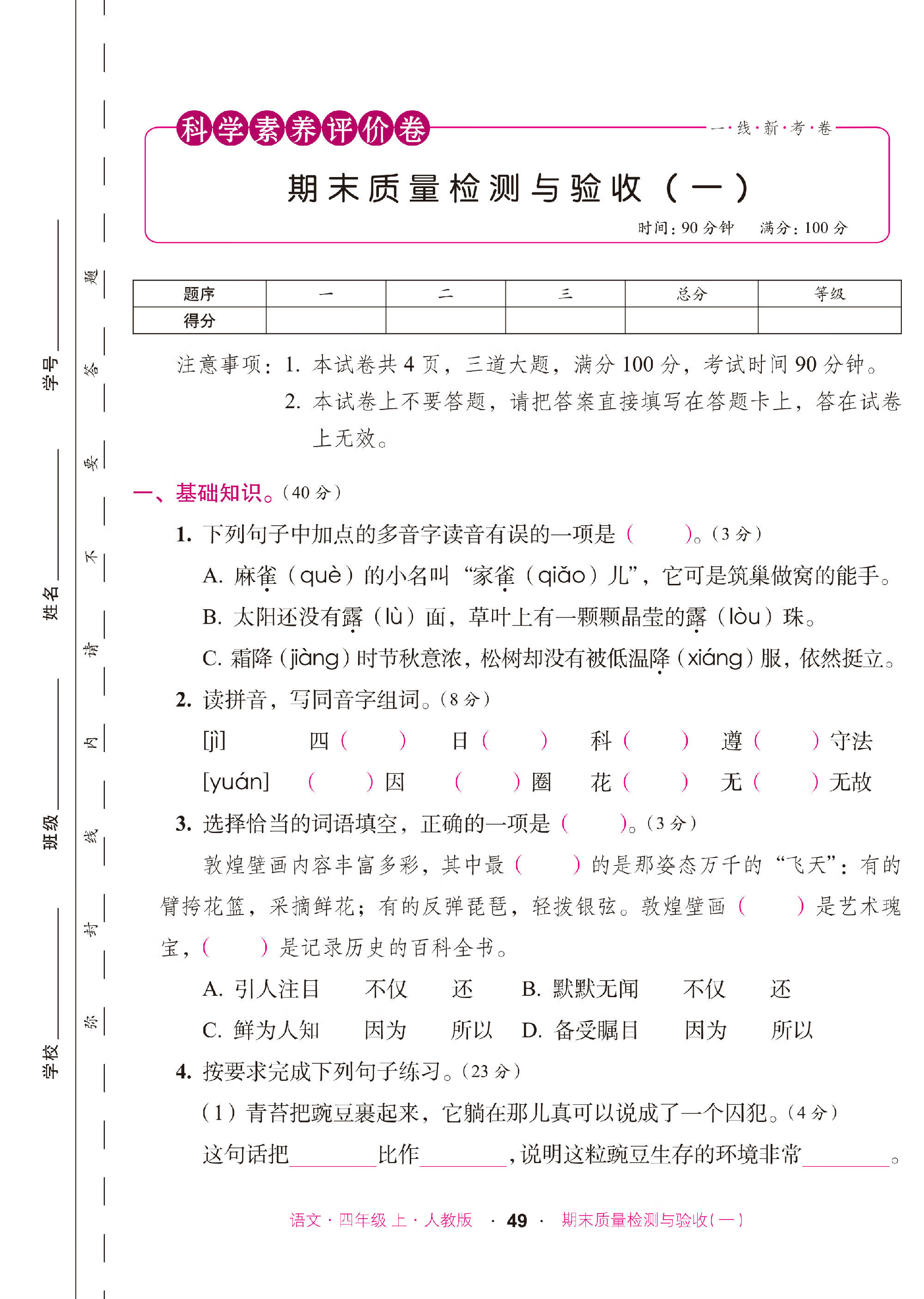 《小学语文素养新考卷(4上人教版)》与人教版四年级上册课本相配套,紧扣“素养”二字,将全书分为“教材素养形成”“关键能力提升”“学科素养评价”和“参考答案与解析”四个部分。第一部分为单元测试,共8套,每单元一套试卷,每套试卷按“积累与运用”“阅读理解”“习作表达”三个板块编排。“积累与运用”主要考查本单元的拼音、字、词、句等基础知识与涉及的文学常识、综合性学习等相关知识。“阅读理解”包含两部分内容“课内语段、课外阅读”;“习作表达”除主要写作外,还可以考查口语交际方面的内容;第二部分有有四套试卷,分别为“字词与句子”“积累运用与课文内容”“阅读理解”“口语交际、综合性学习与习作表达”;第三部分为期末试卷,分别为两套“期末质量检测与验收卷”和两套“名校名师猜押卷”;第四部分是参考答案与解析,除给出详细答案外,还将部分易错或重难点题进行了解析。并在本部分并穿插了“方法总结”“答题格式”“知识拓展”三个模块。