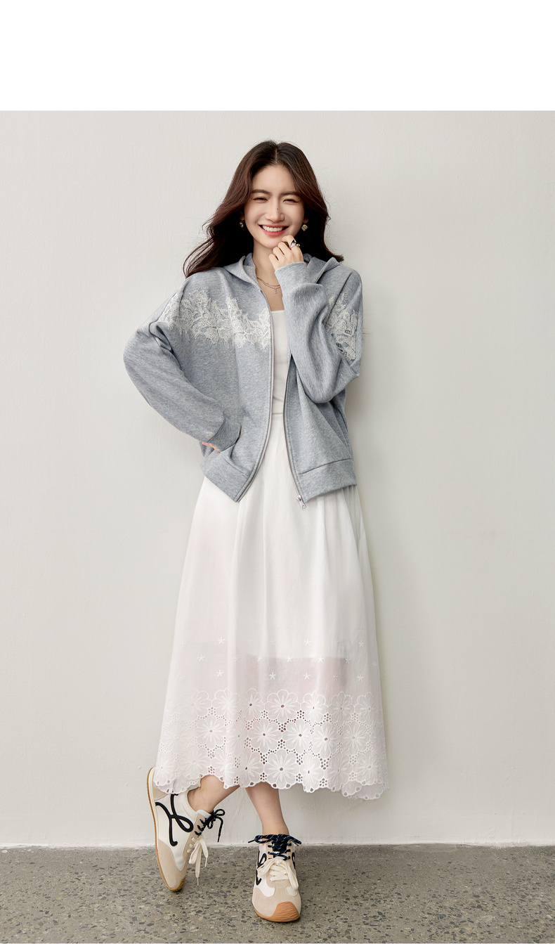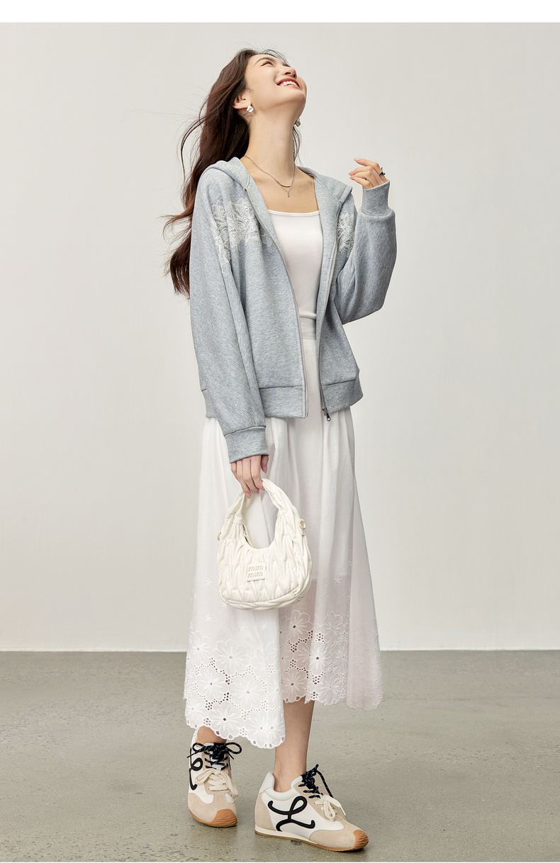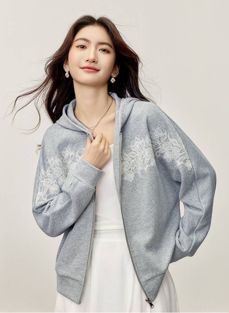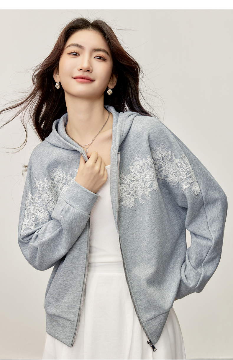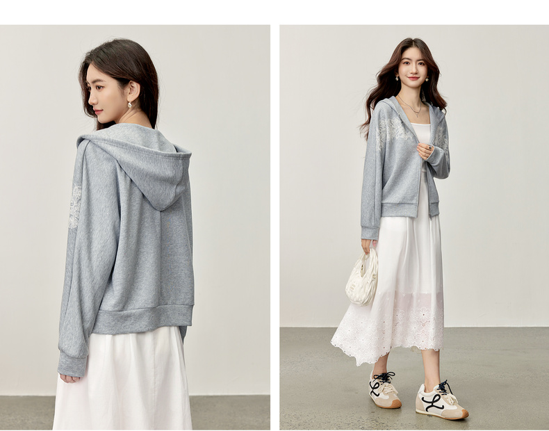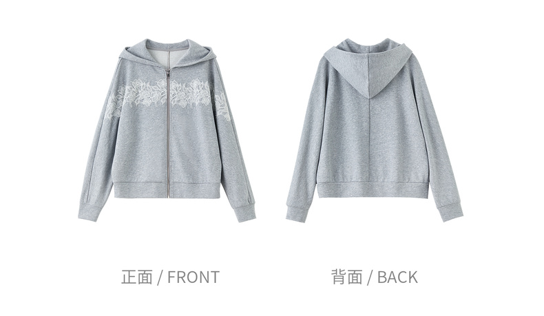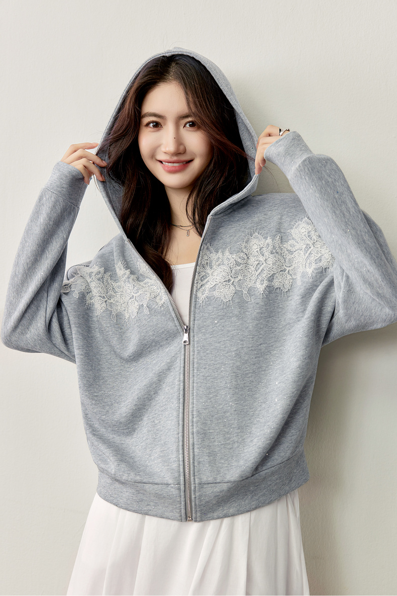 【内购】【浪漫蕾丝】简约休闲连帽撞色拼接插肩长袖宽松亮片针织卫衣外套-153WG2301
