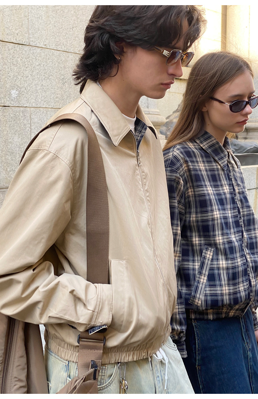 美式复古格纹双面穿外套 秋冬新款宽松小众休闲夹克上衣
