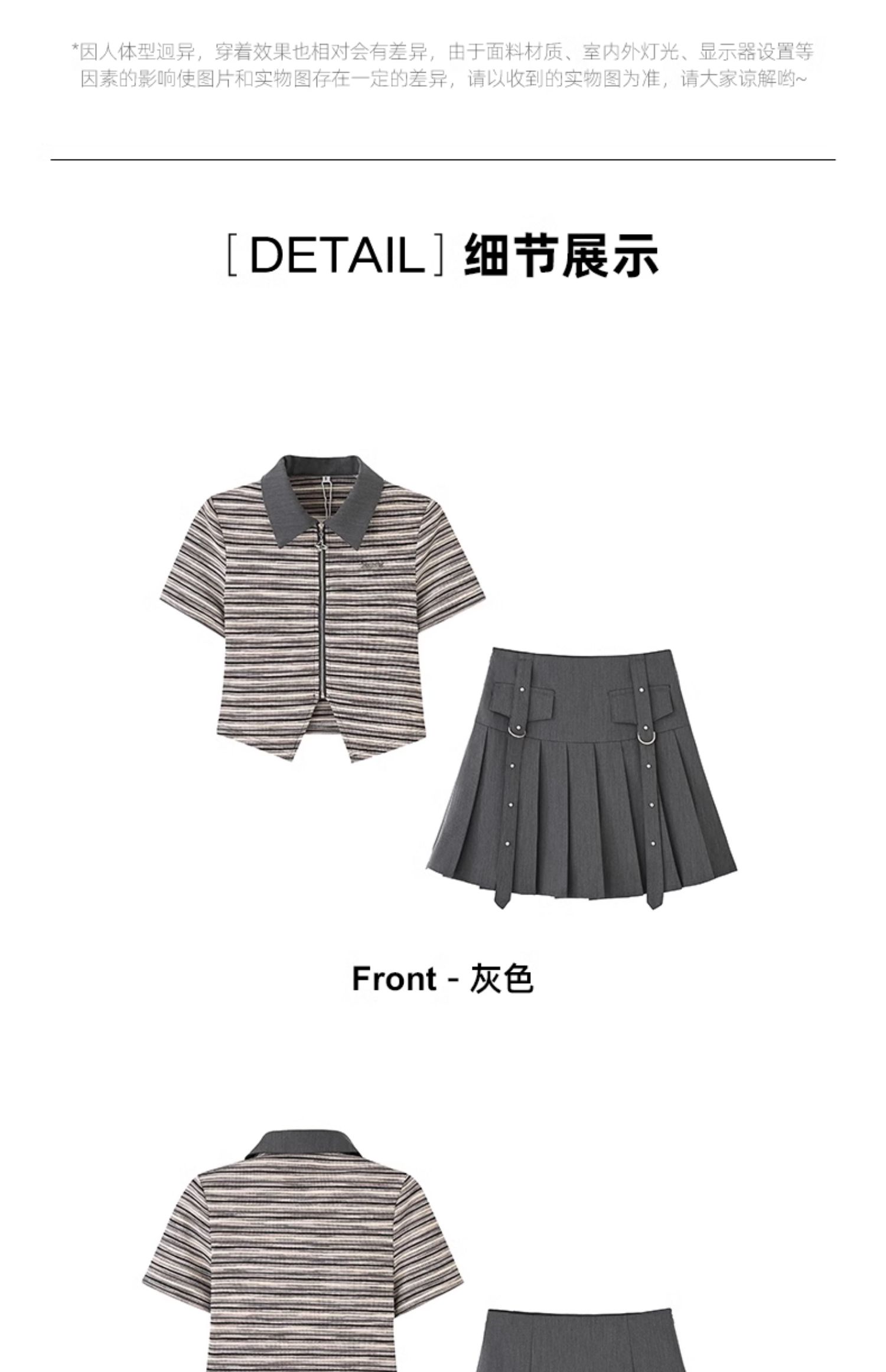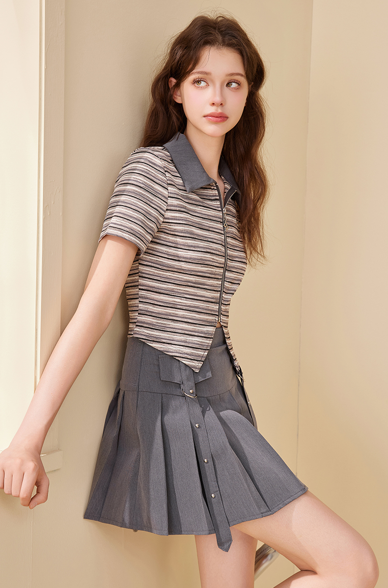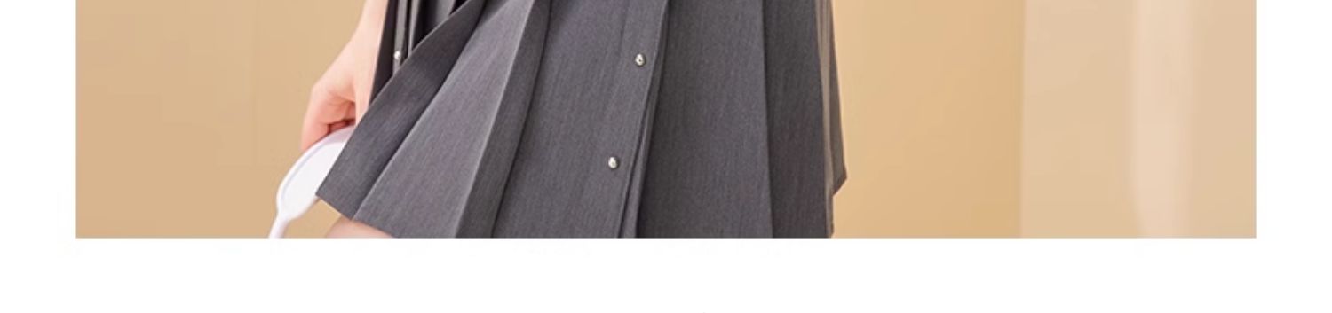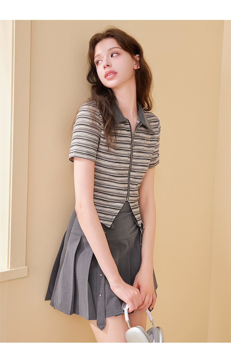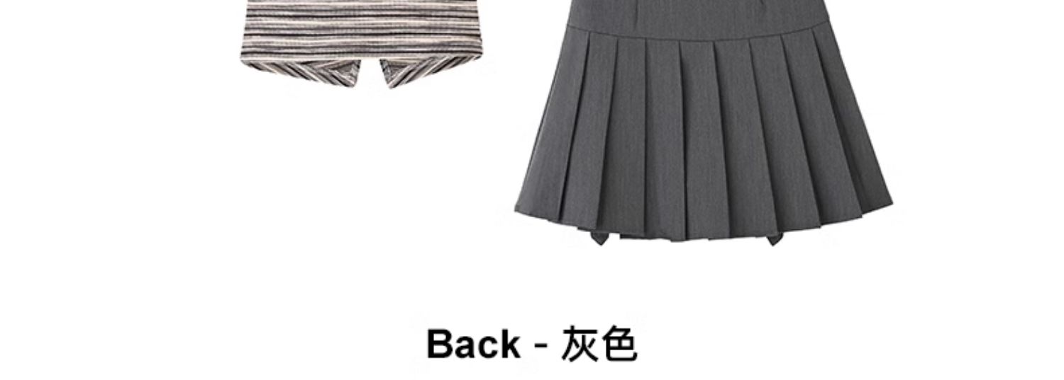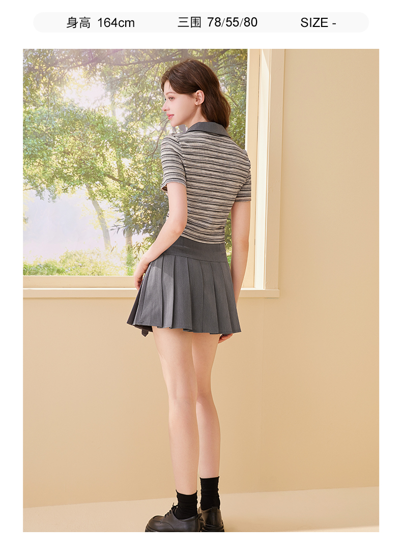 mc2翻领条纹配飘带百褶裙灰色两件套女2024夏季新款元气甜辣风