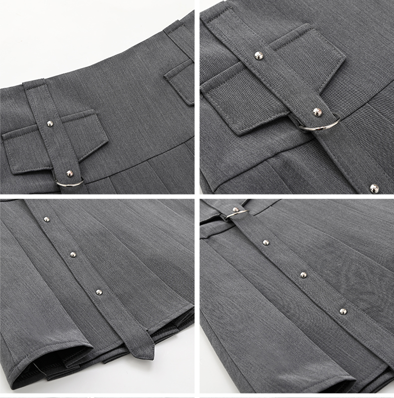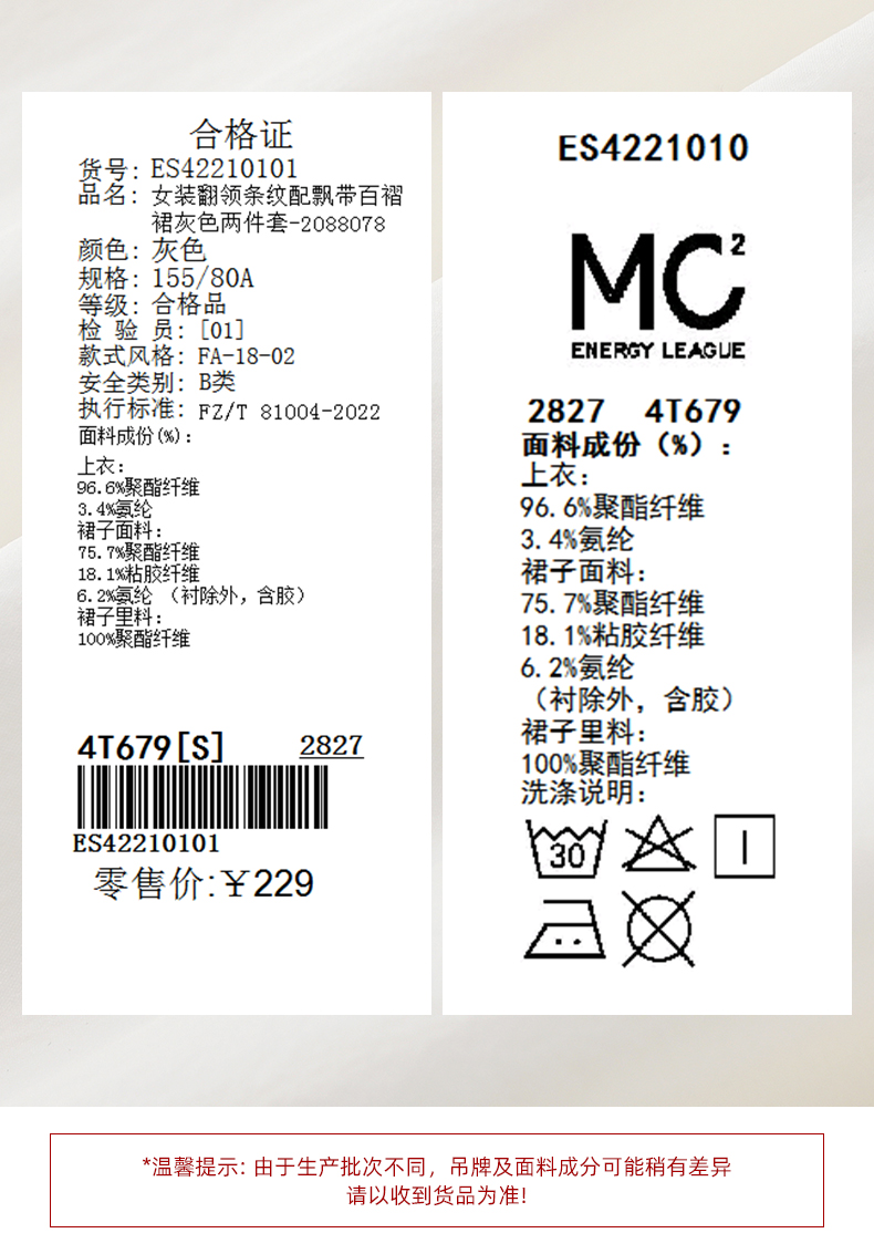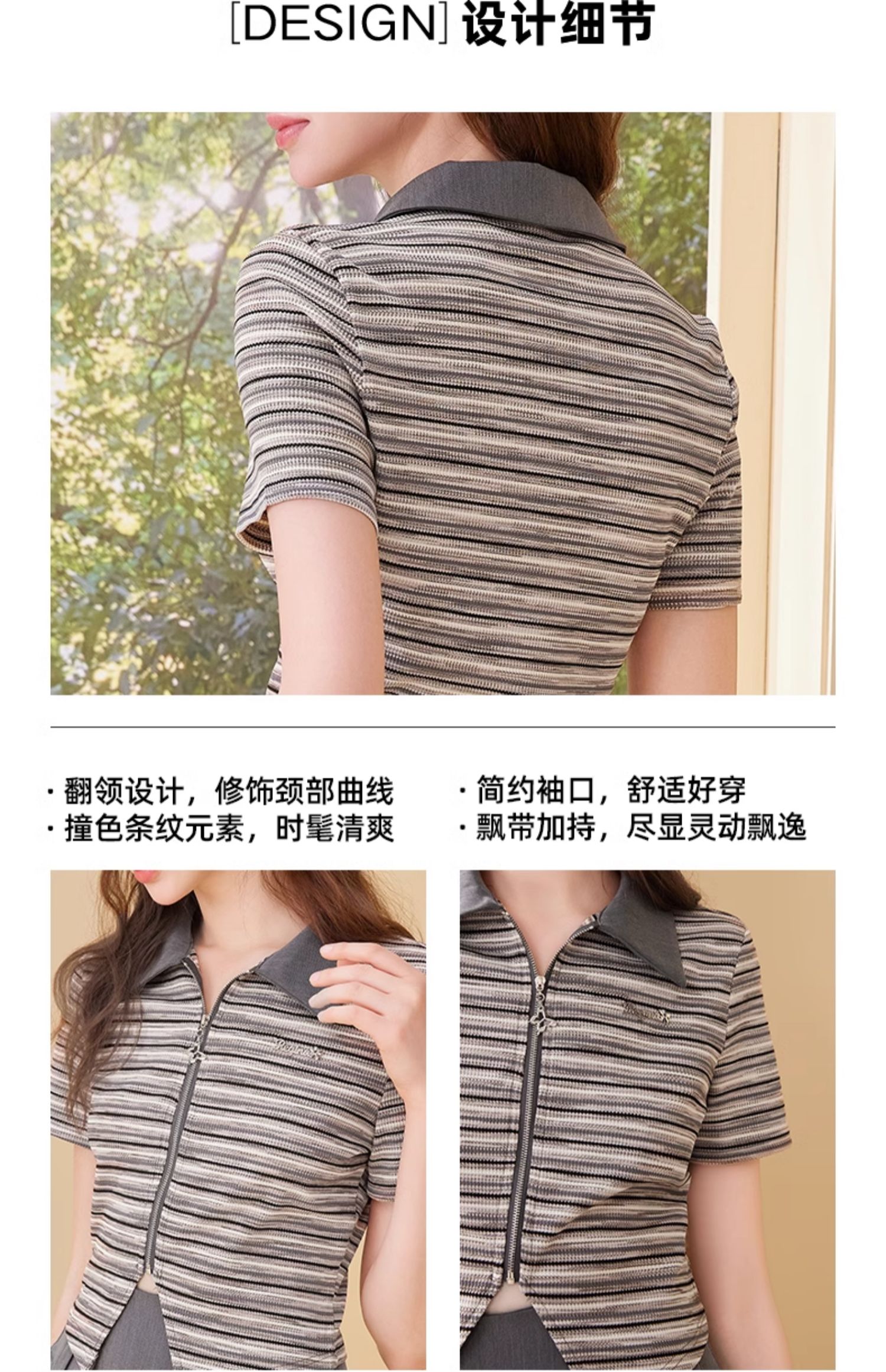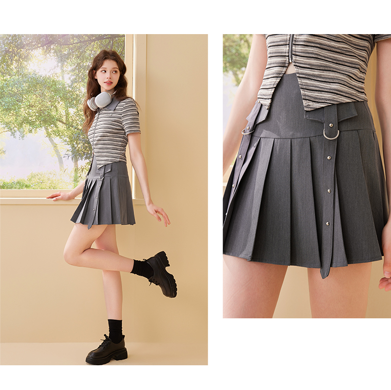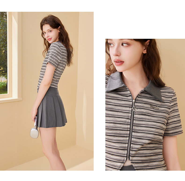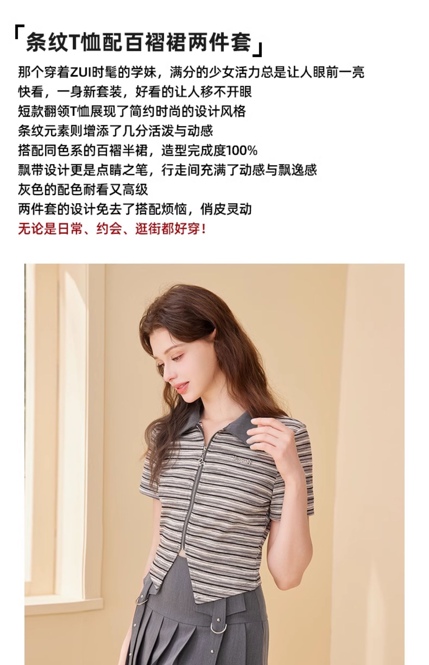 mc2翻领条纹配飘带百褶裙灰色两件套女2024夏季新款元气甜辣风