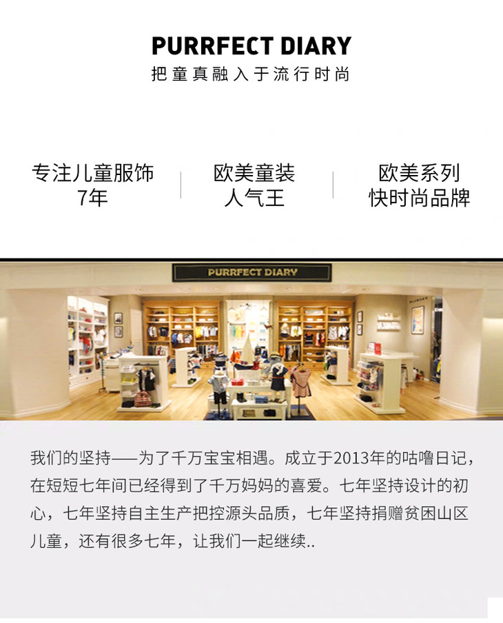 - Purrfect-Diary专注于贴近自然随性的穿着概念,轻奢平价的童装文化传播,在产品设计上更加注重婴童穿着的舒适性、安全性、更出众的国际化品牌,将欧美的育婴文化在中国进行深入的传播与推广。