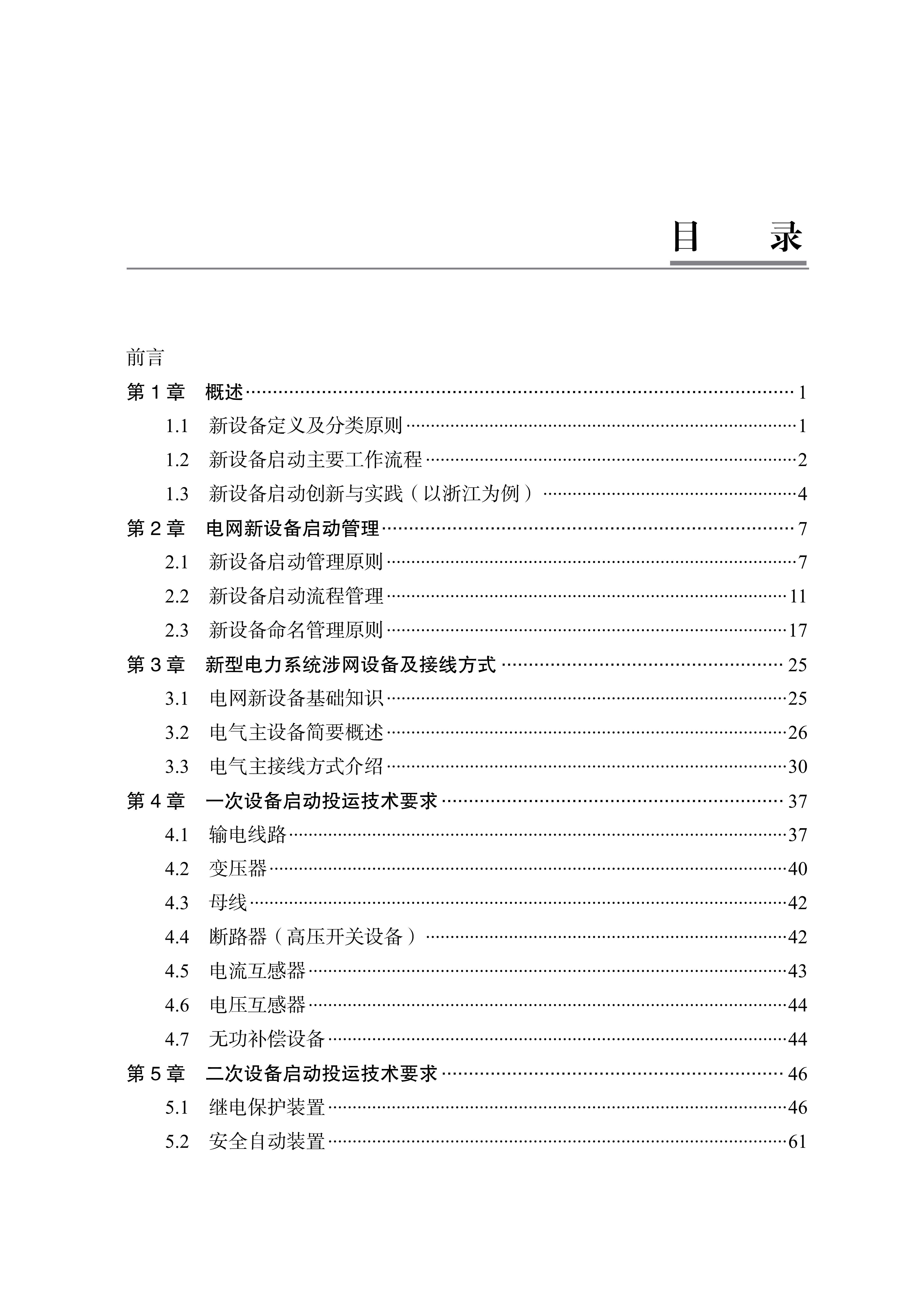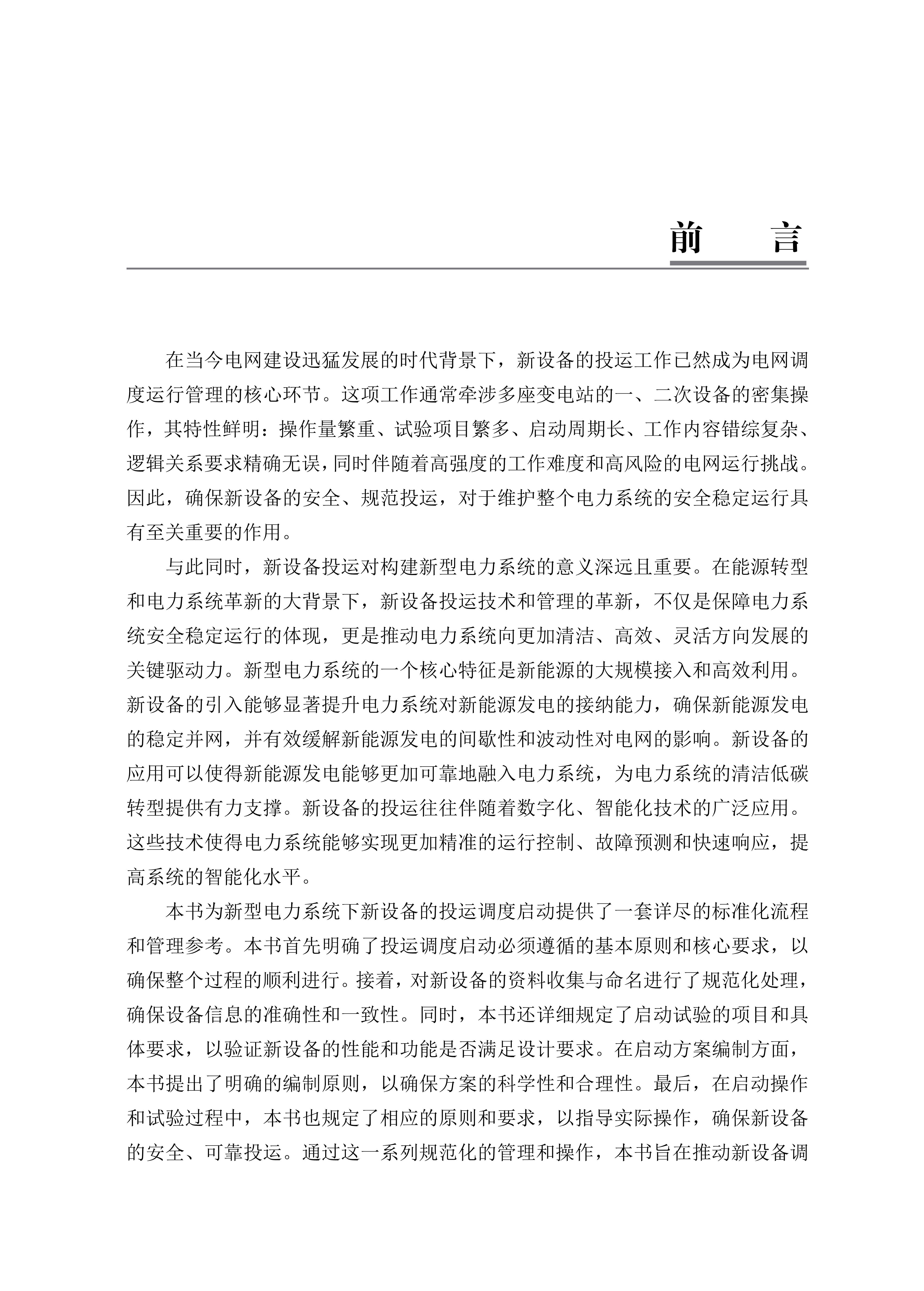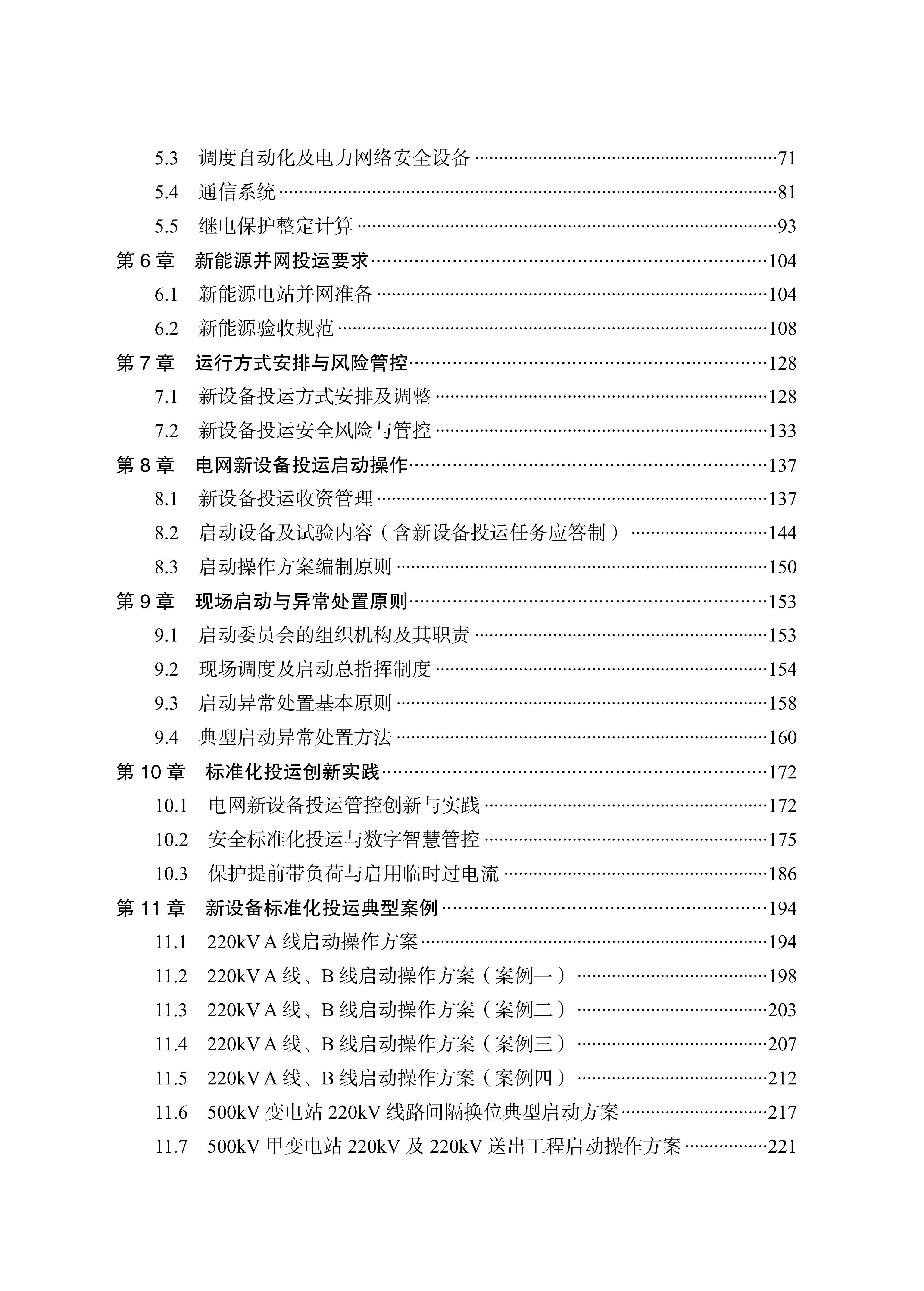 本书旨在为电网新设备投运提供全面、系统的指导,以应对电网建设快速发展背景下新设备投运的复杂性和高风险性。全书共分 11 章,内容涵盖电网新设备启动管理、新型电力系统涉网设备及接线方式、一次与二次设备启动投运技术要求、新能源并网投运要求、运行方式安排与风险管控、电网新设备投运启动操作、现场启动与异常处置原则、标准化投运创新实践、新设备标准化投运典型案例等方面。书中详细阐述了新设备投运的标准化流程、技术要求及创新实践,结合大量典型案例,为从业人员提供实用参考。