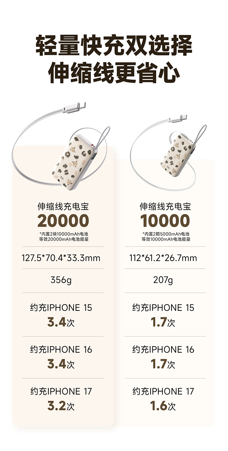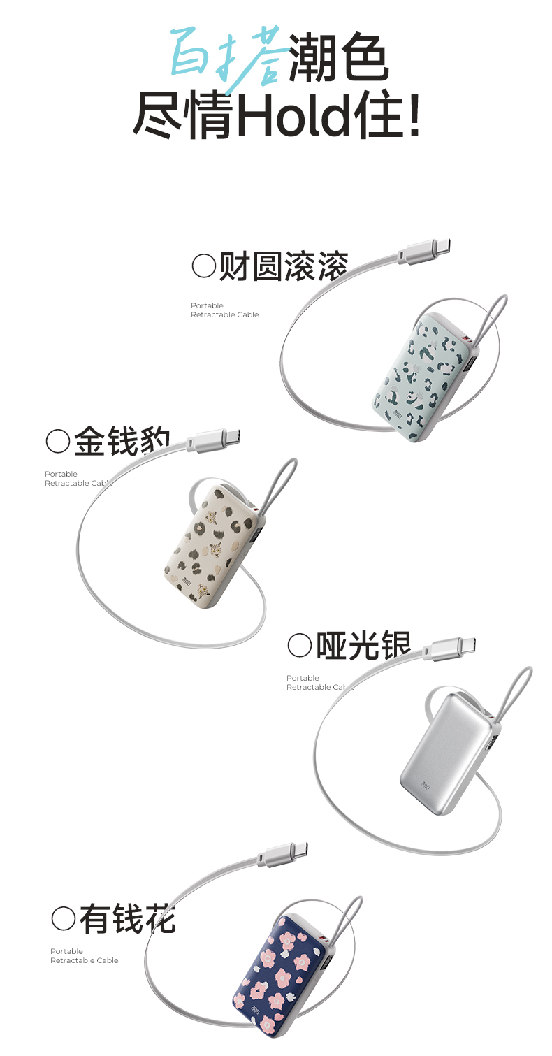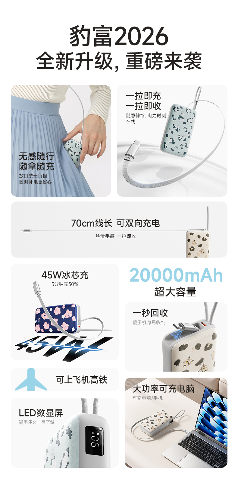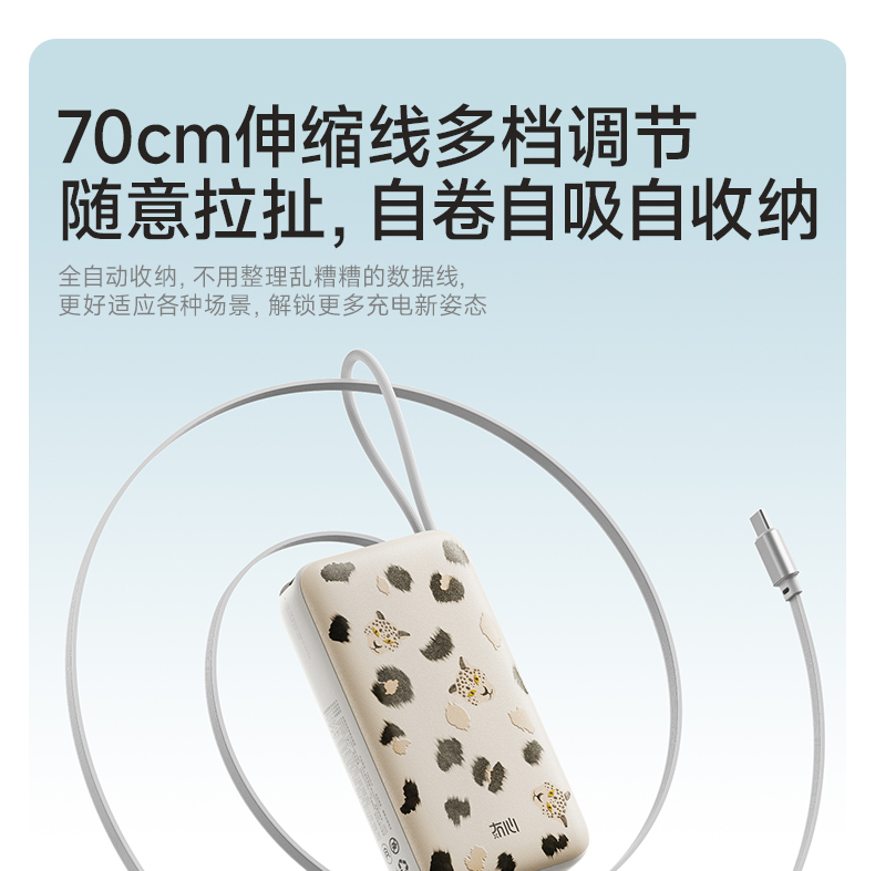 【一拉即充即收】冇心豹富系列伸缩线充电宝T201ALP/T202ALP 可上飞机/高铁 自带70cm伸缩线 LED数显屏 双向闪充 45W可充电脑