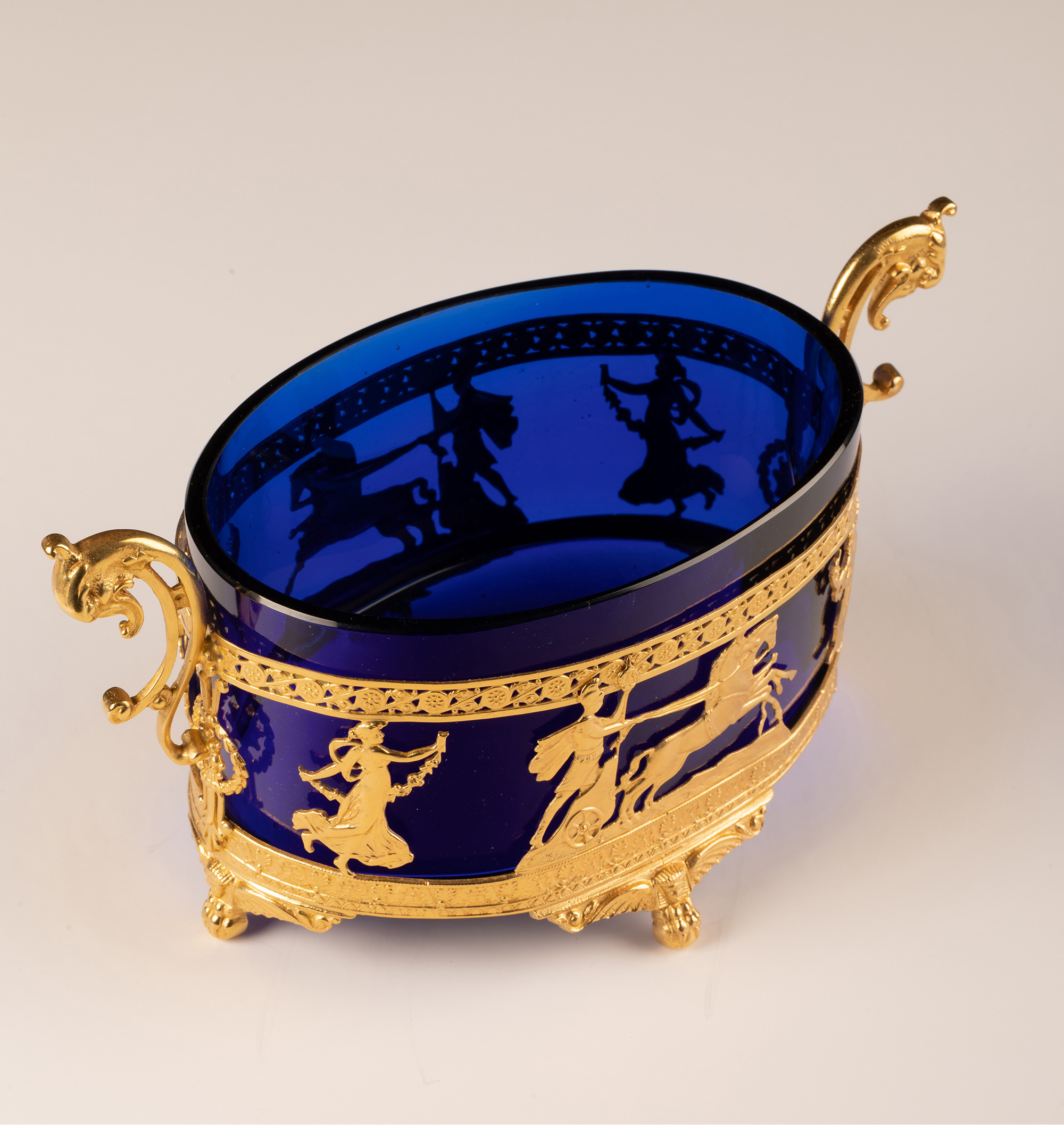 独角鹿西洋古董法国帝政风格古典人物主题铜鎏金装饰蓝色水晶盆