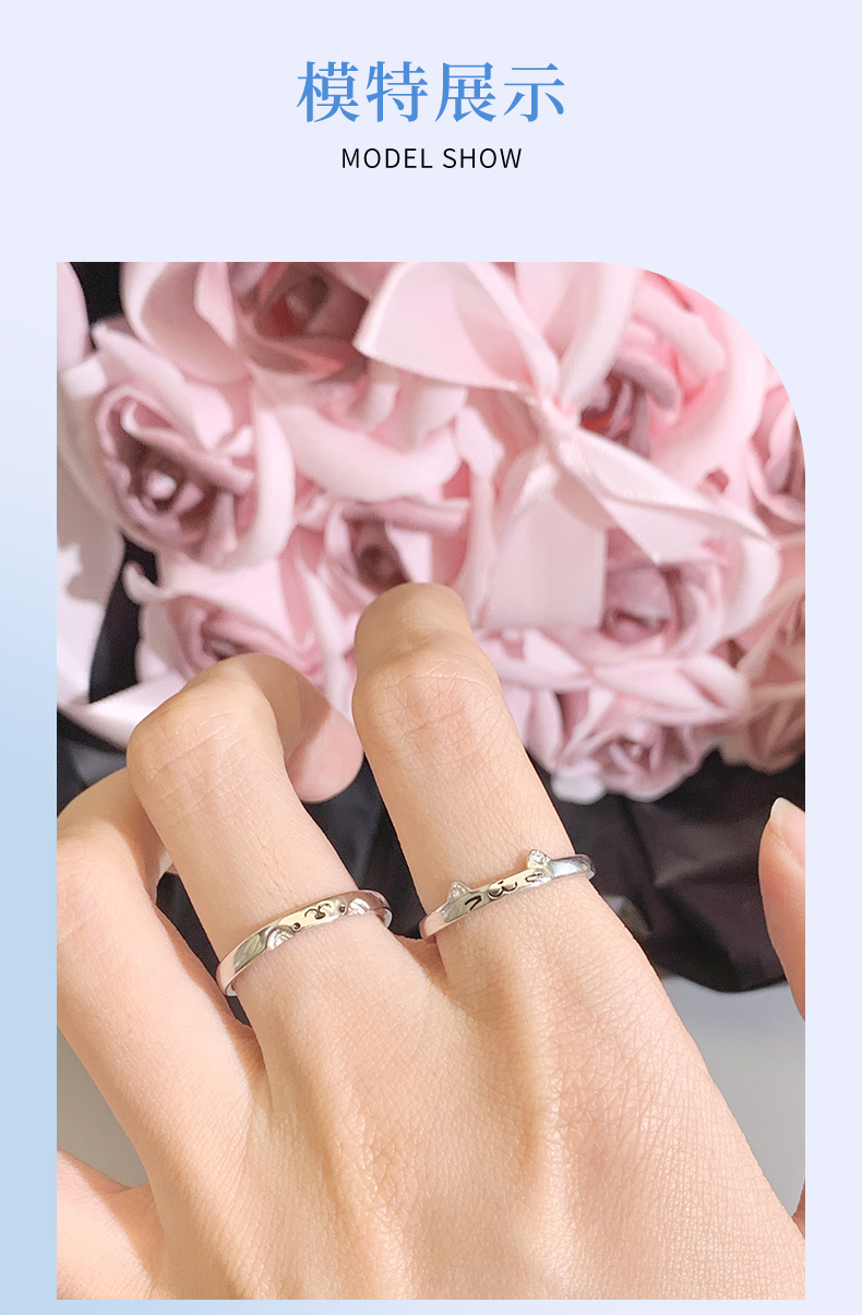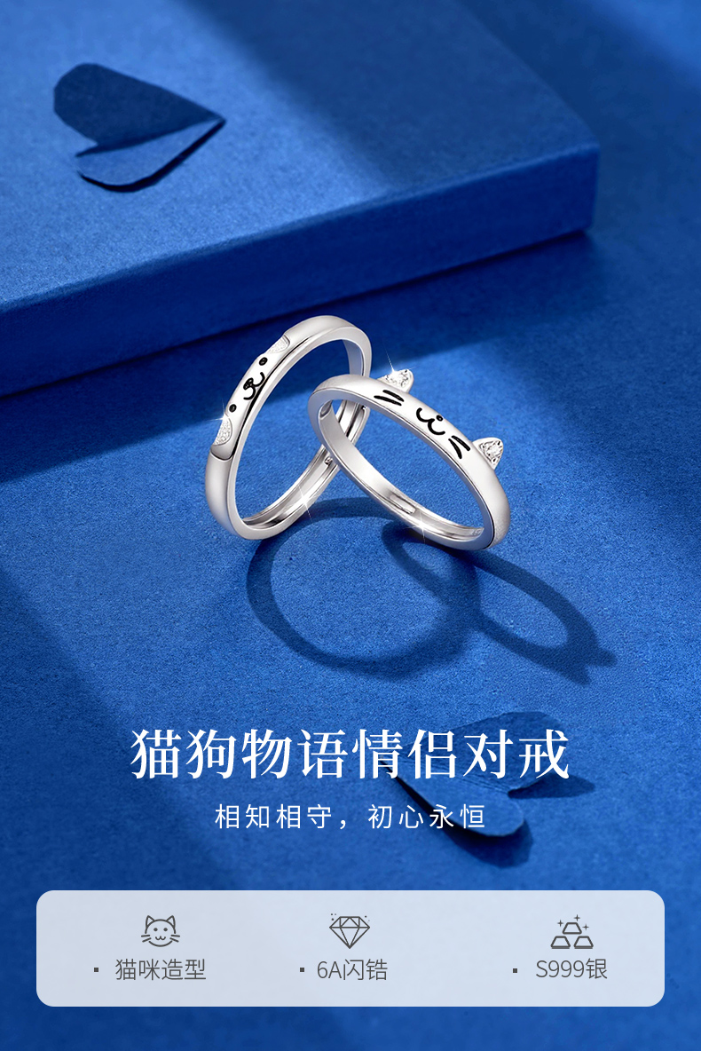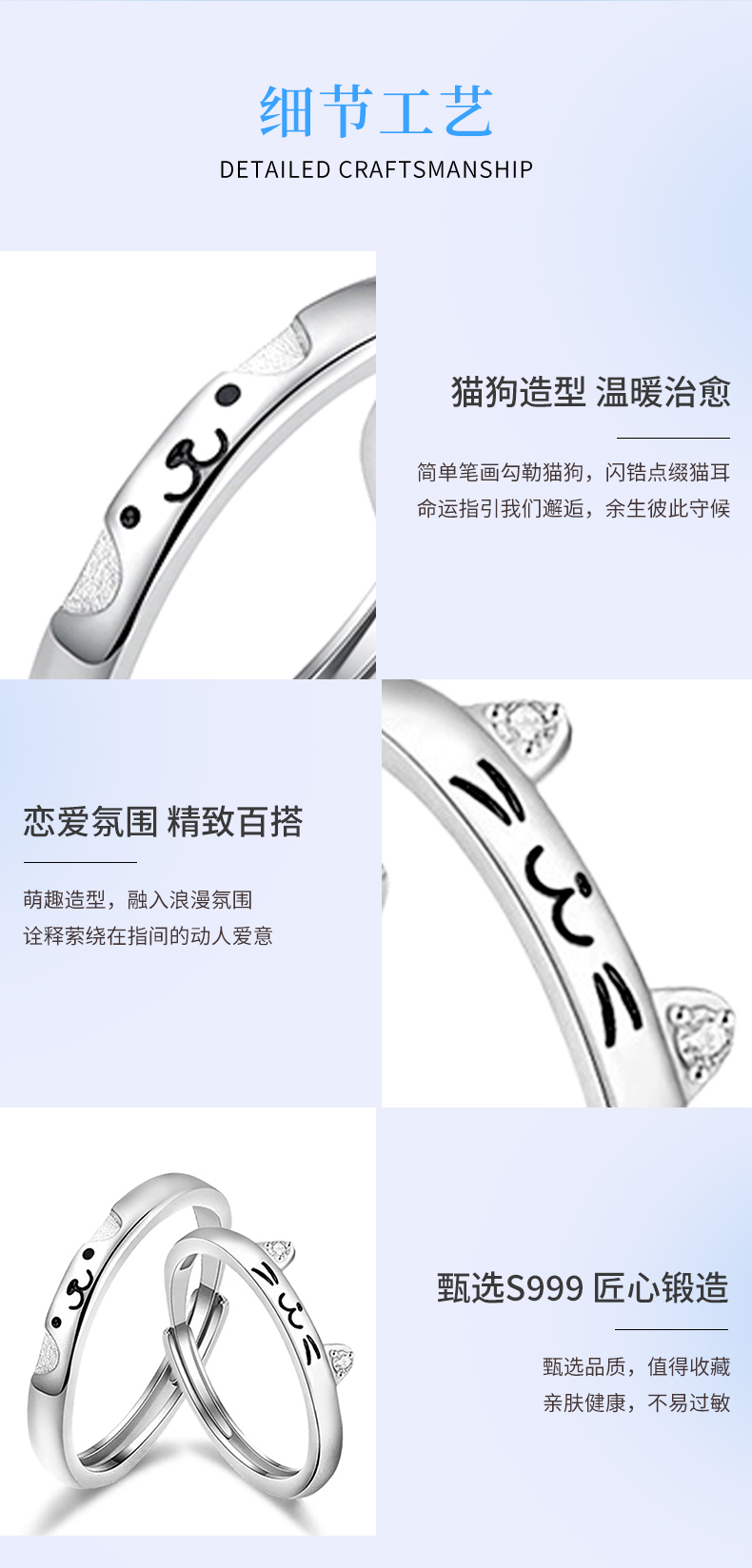 【999足银】 卡蒂罗KADER 萌趣猫狗贴贴 可爱猫耳闪锆生动立体软萌俏皮设计素圈开口可调节一对 可爱万岁恋爱频率 戒指 男女同款情侣款