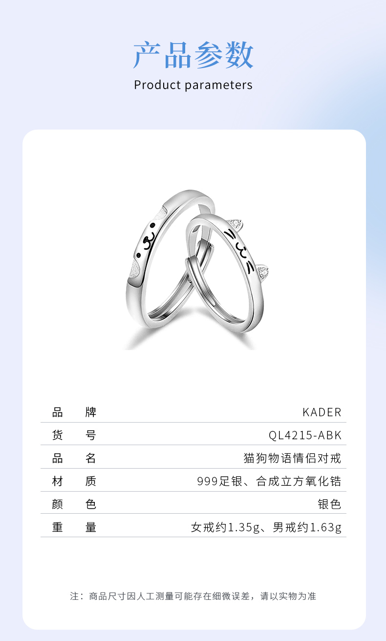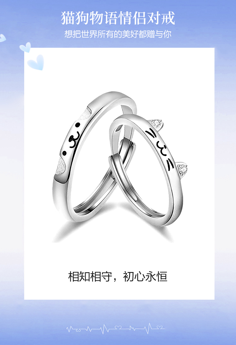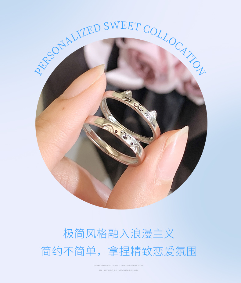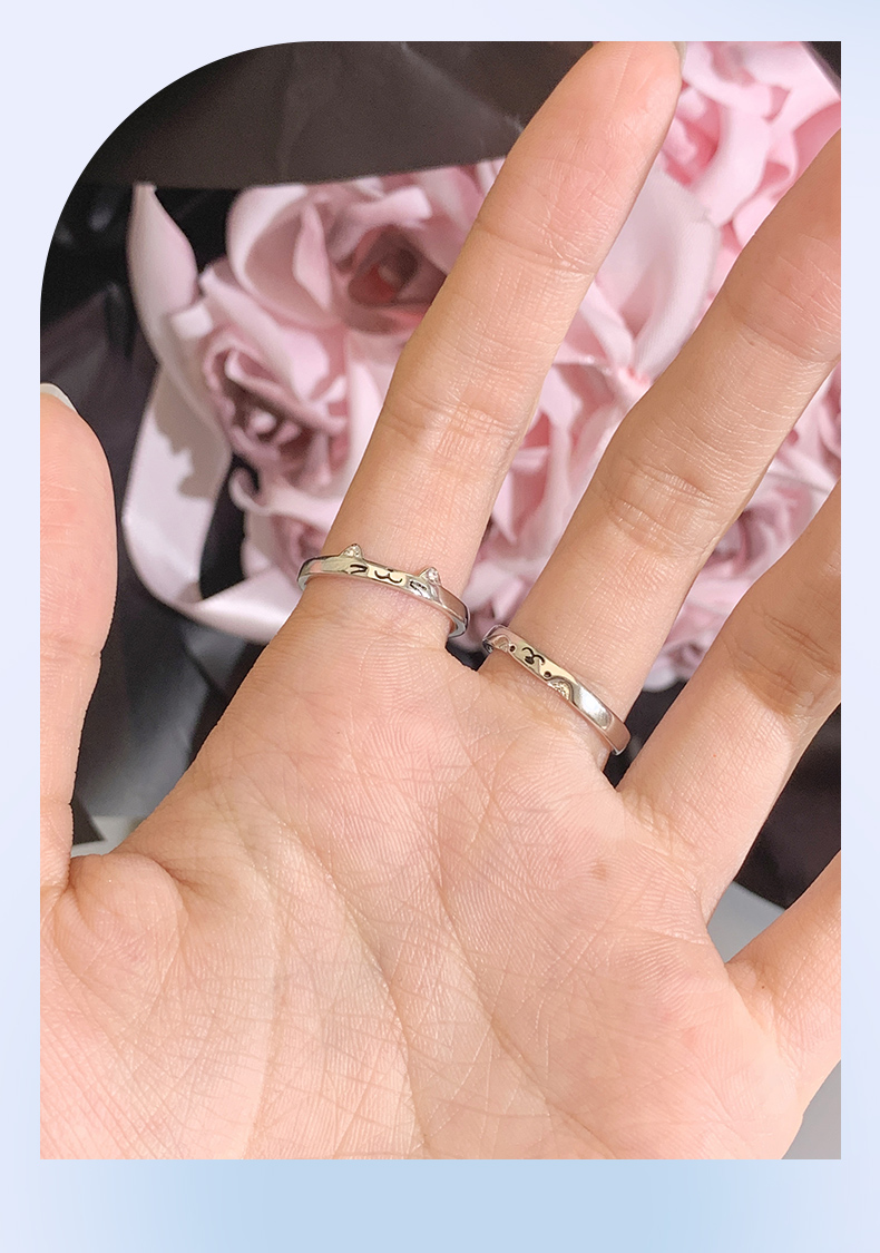 【999足银】 卡蒂罗KADER 萌趣猫狗贴贴 可爱猫耳闪锆生动立体软萌俏皮设计素圈开口可调节一对 可爱万岁恋爱频率 戒指 男女同款情侣款