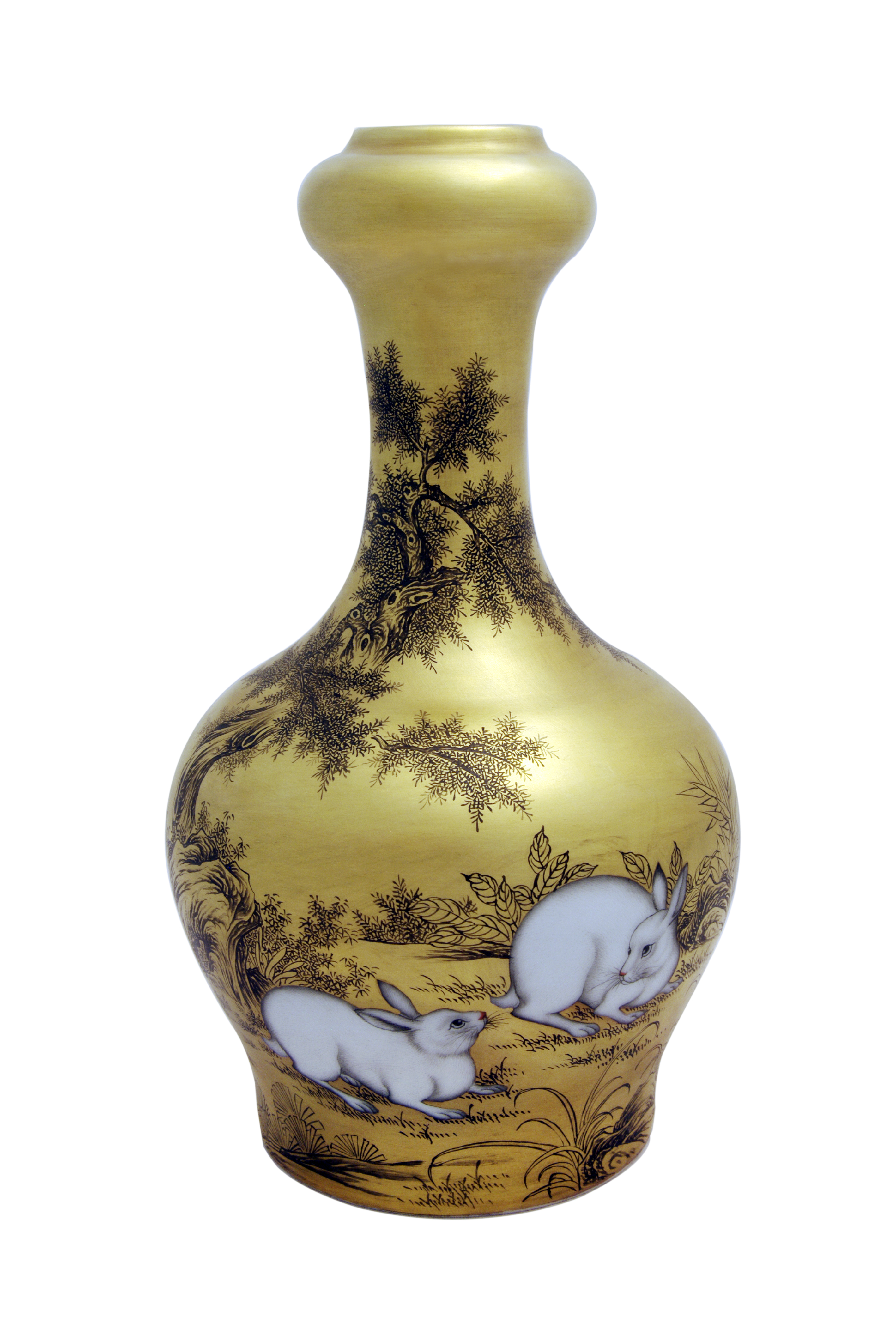 此瓶为故宫藏瓷精品,系当年御用画师郎世宁在宫廷中,为乾隆帝所绘。所以画风具有浓郁的西洋色彩,但总体仍系中国工笔画风格。草木栩栩如生,动物简练传神。通体瓶身施以本金,彰显此器物的宫廷“身价”。画中一对玉兔两两相望,俏皮可爱,惟妙惟肖。