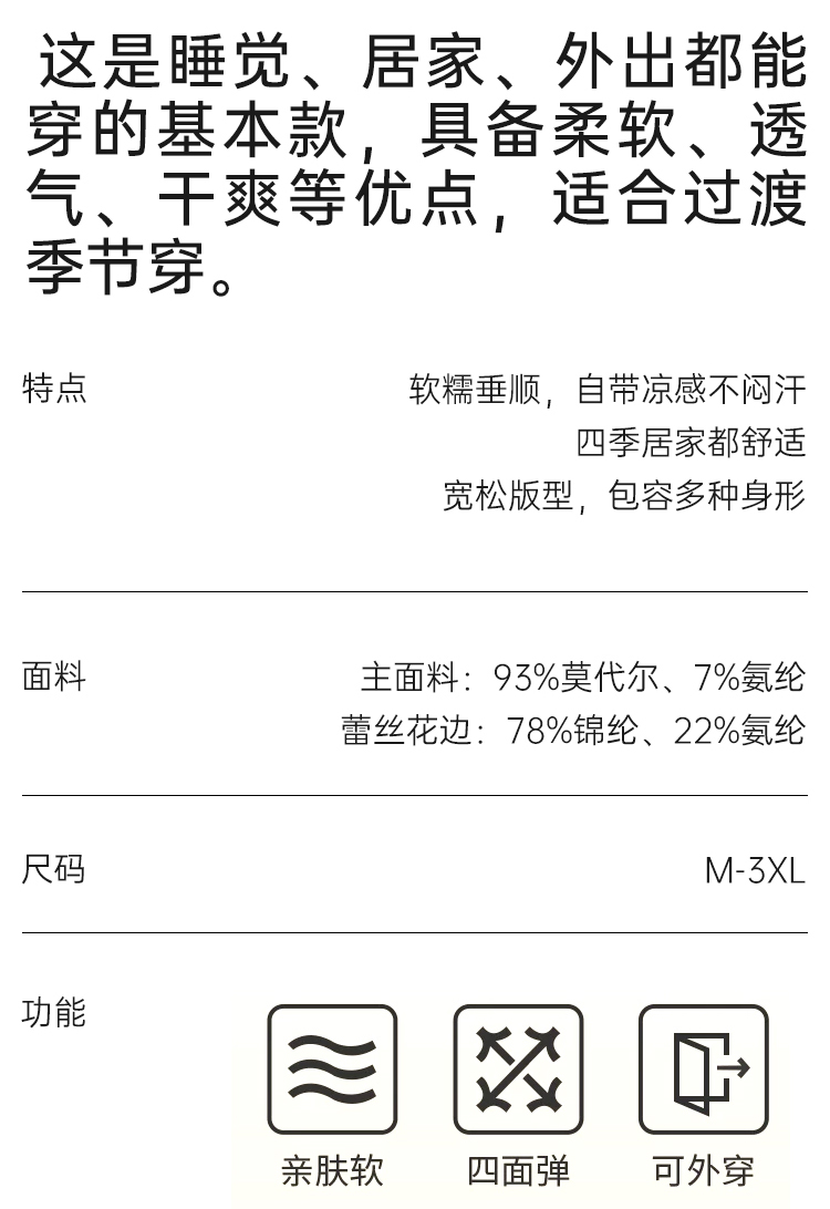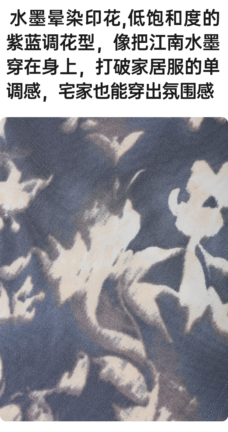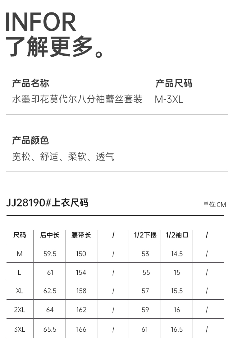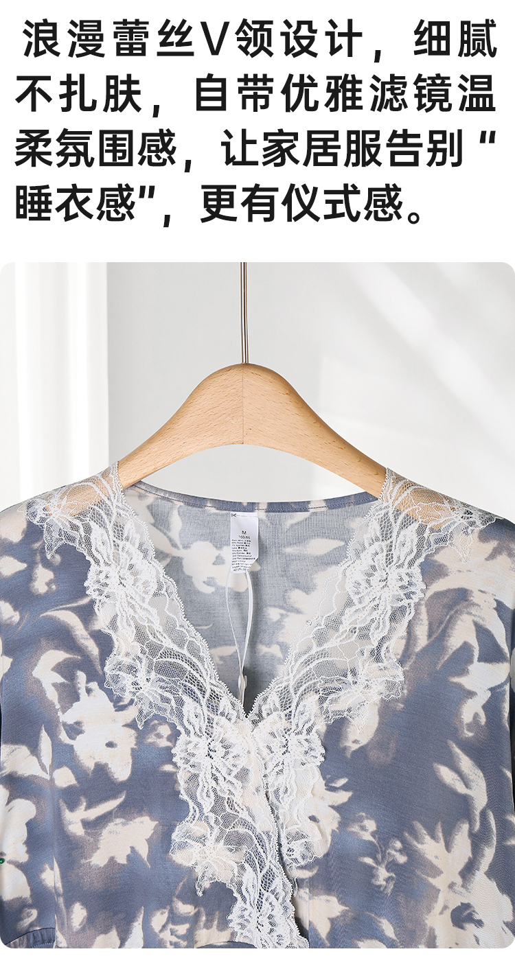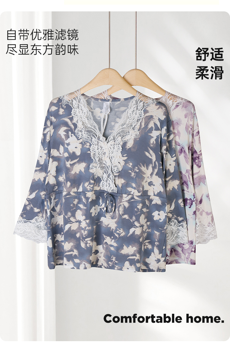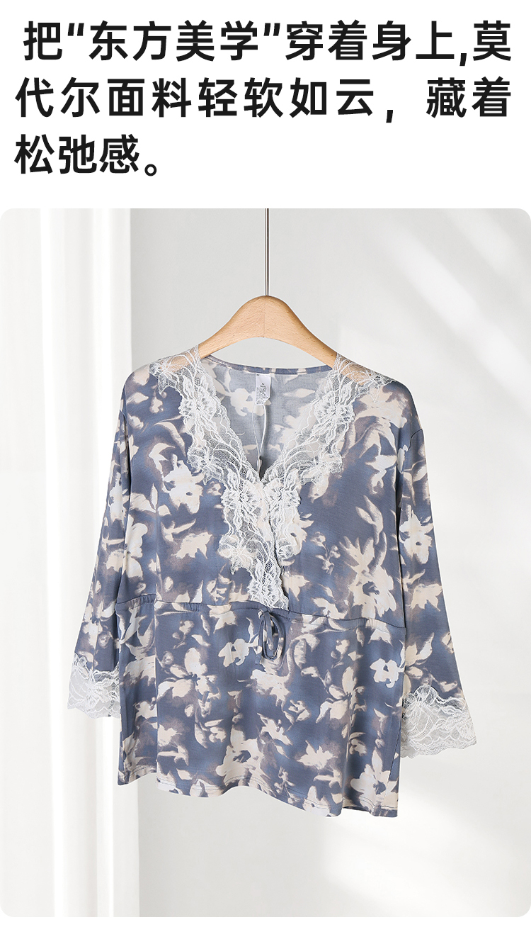 美奈川莫代尔薄款碎花睡衣女家居服柔软舒适睡眠衣服上衣裤子套装 水墨印花莫代尔八分袖蕾丝套装JJ28190