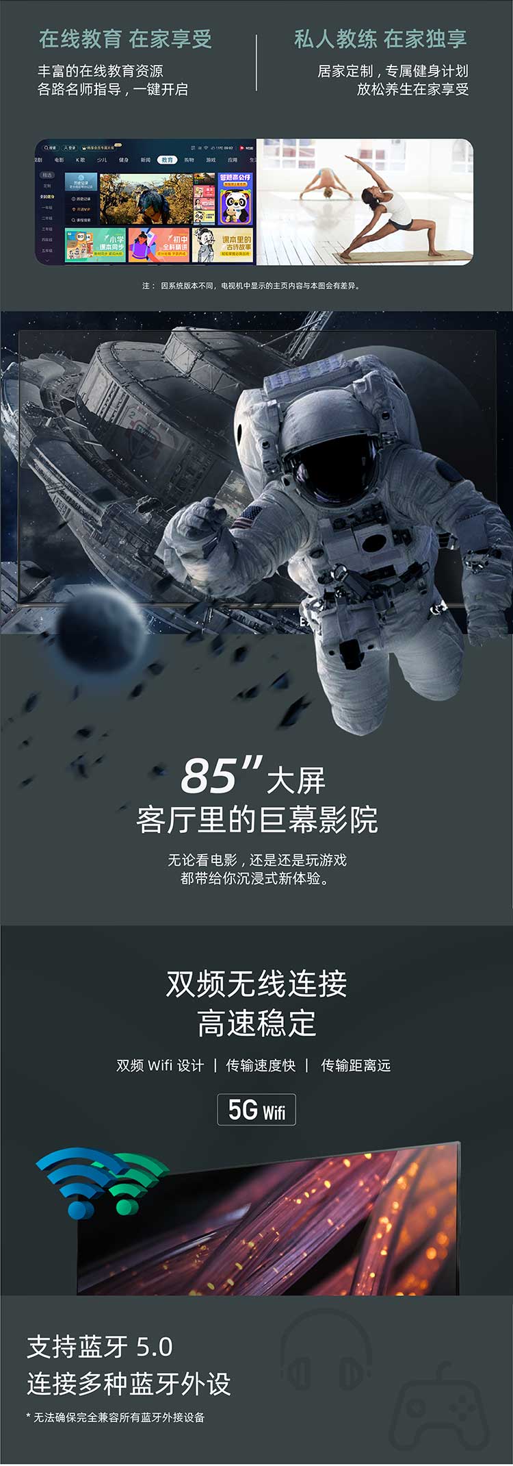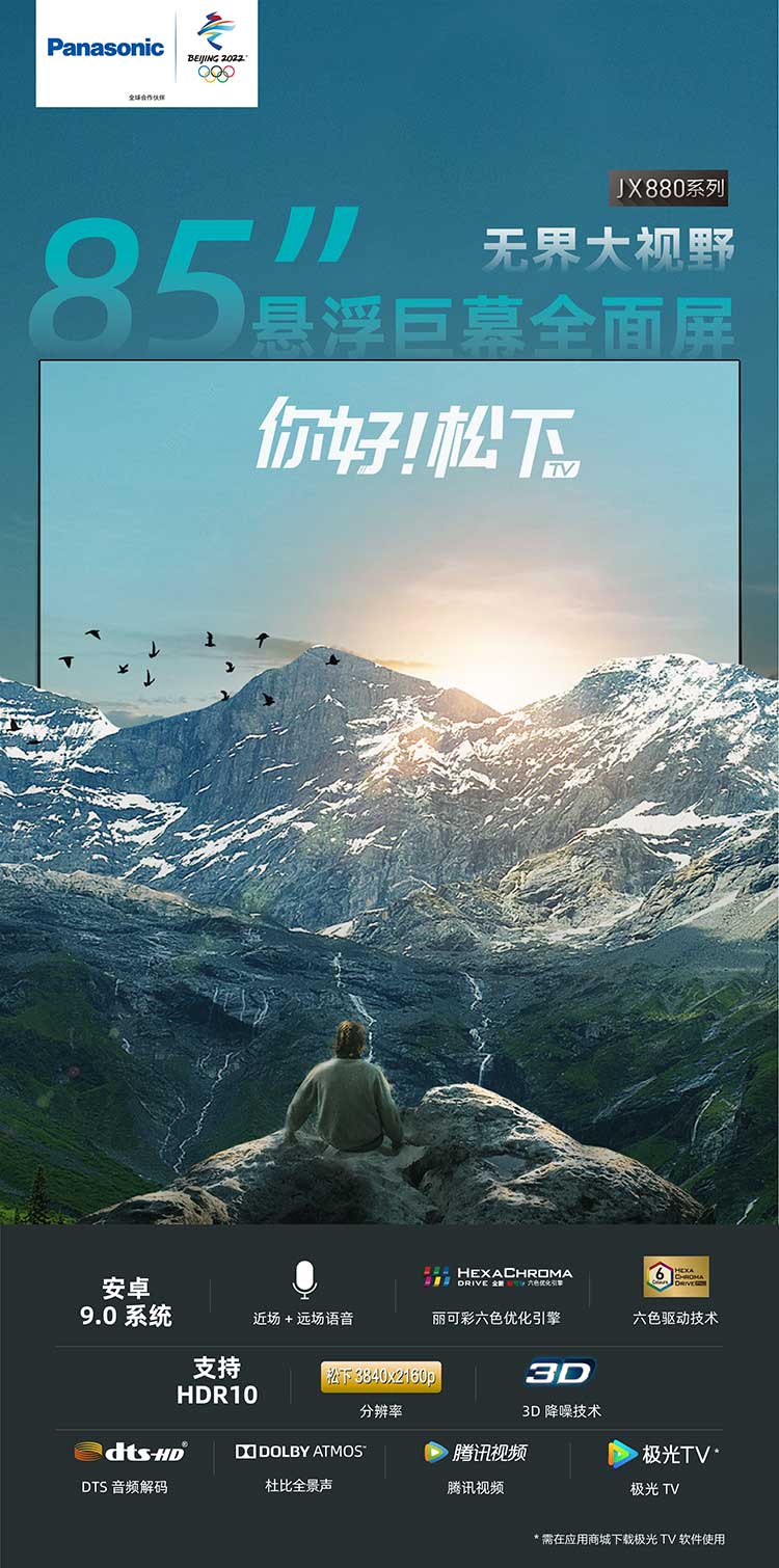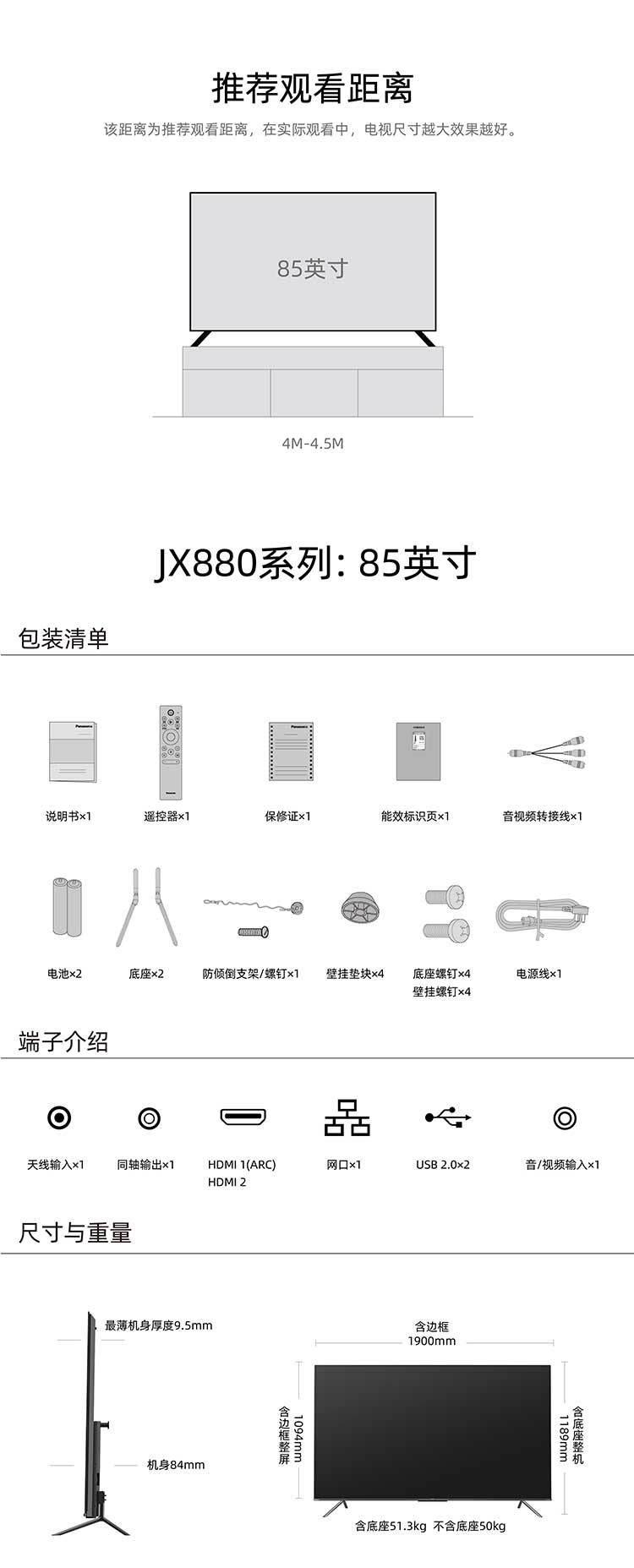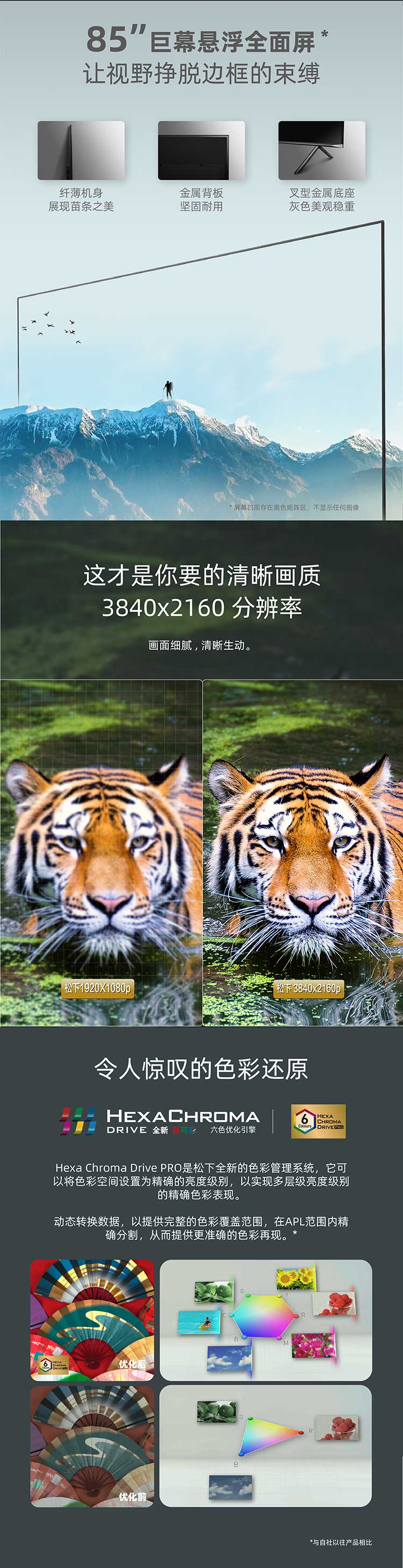 松下(Panasonic) TH-85JX880C 85英寸 悬浮全面屏 4K超清 3+32G双AI人工智能 开无广告教育电视