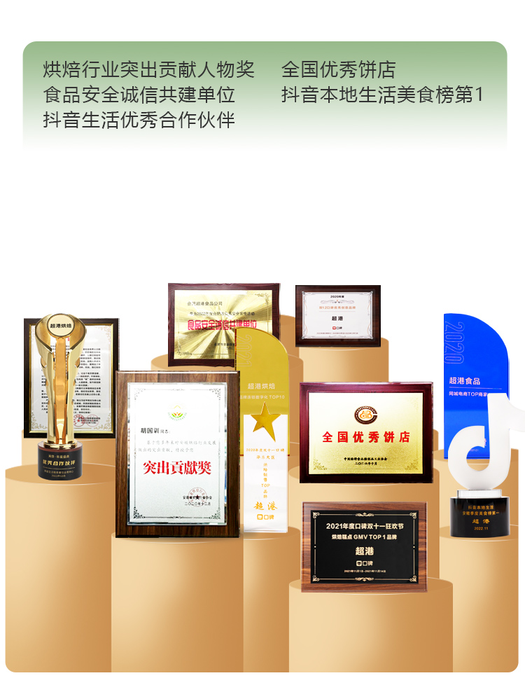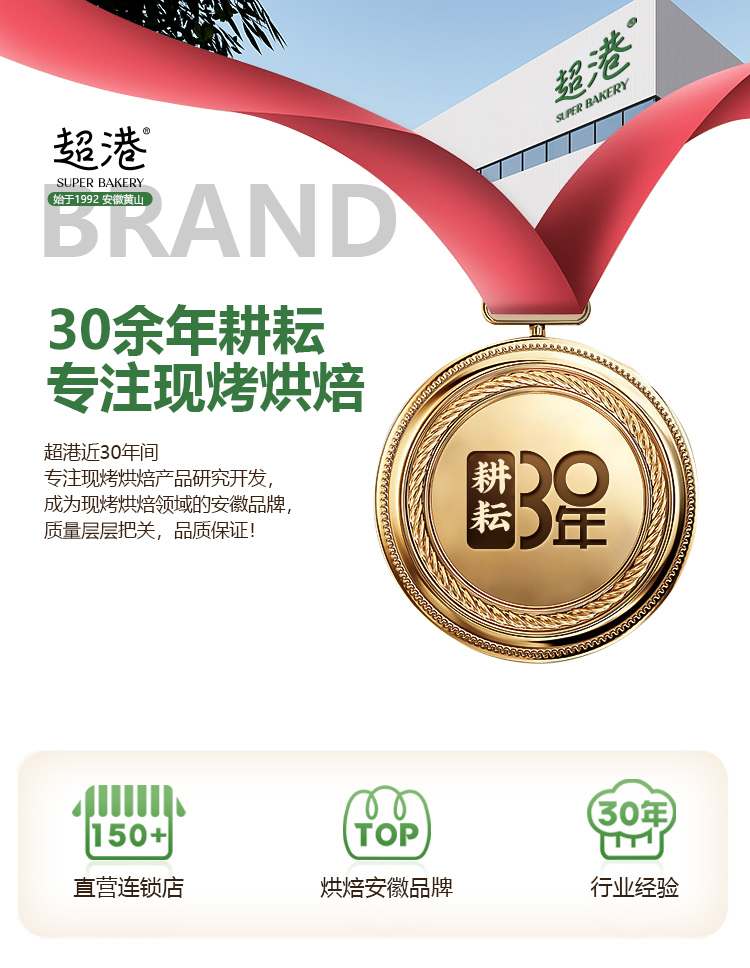 超港创立于1992年,是一家集生产销售面包、蛋糕、传统糕点、中西点于一体的全国性连锁烘焙企业,拥有百余家直营门店。超港以“玩味烘焙、文创美学”为经营理念。