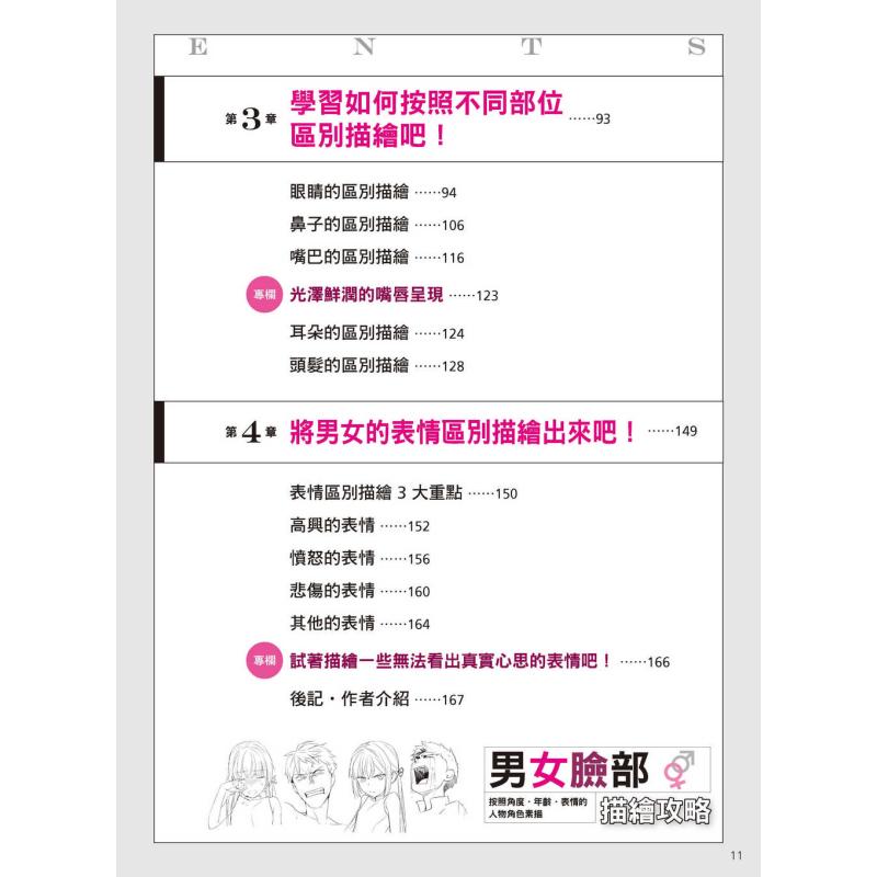 因此,本書是專注在登場於漫畫‧插畫當中的男女角色,其「臉部」的區別描繪。內文將會針對如何將男性角色與女性角色的表情描繪得栩栩如生的技巧,徹底進行解說。