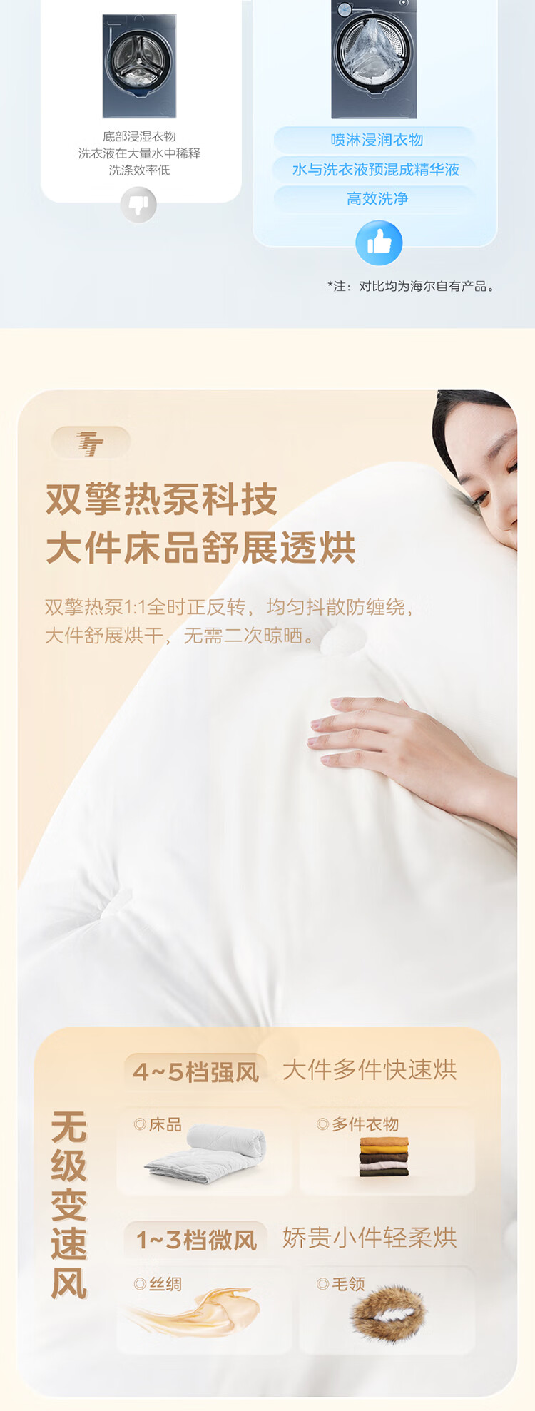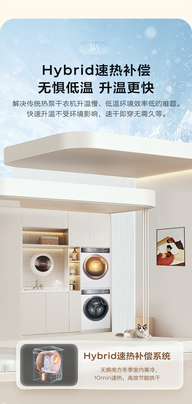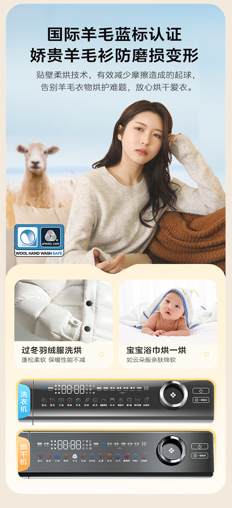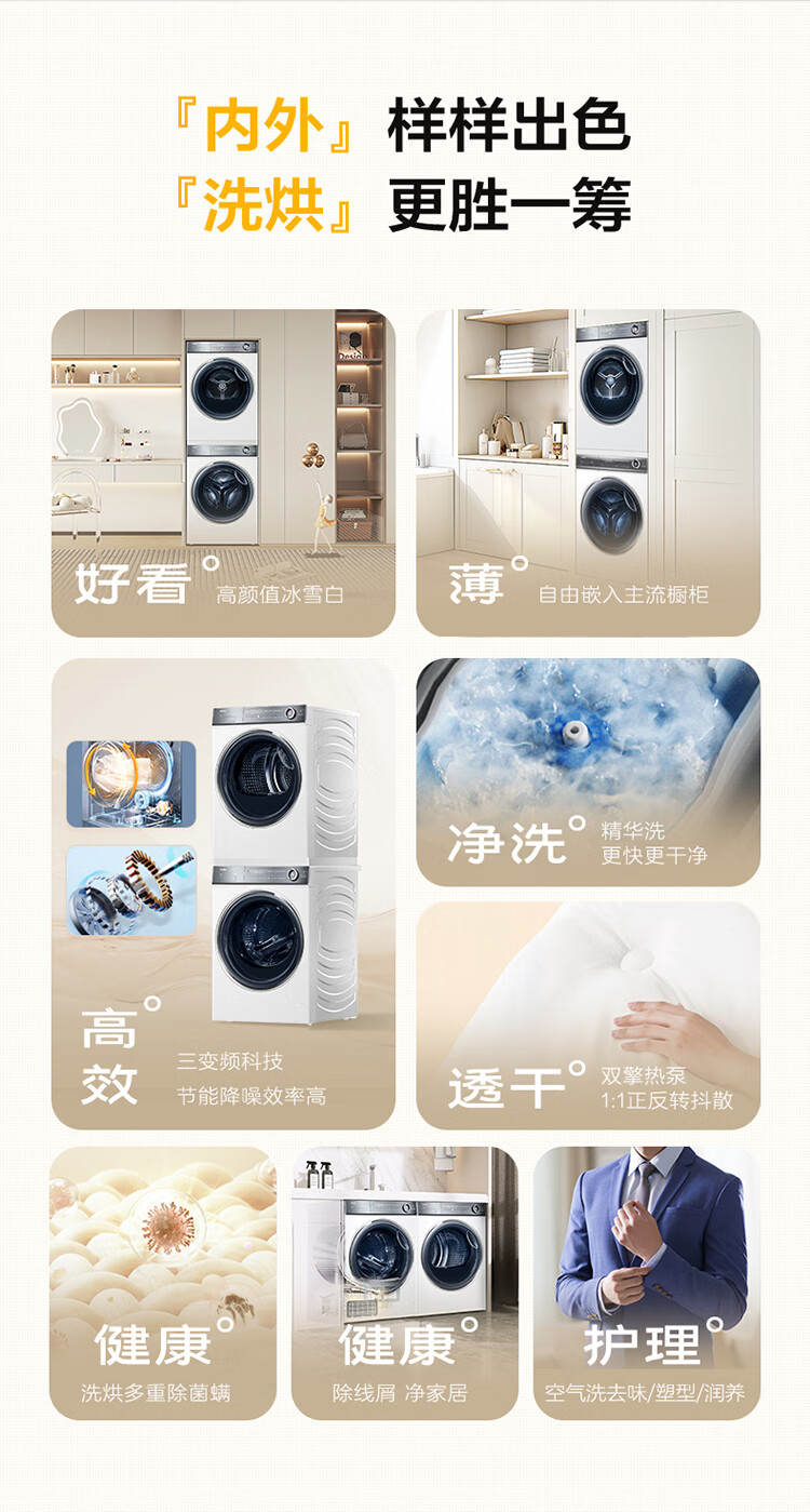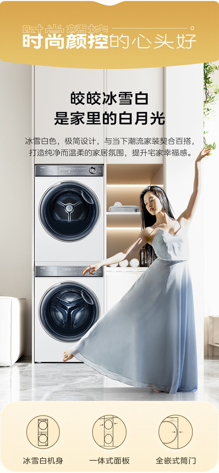 海尔(Haier)超薄平嵌纤美376W白洗烘套装 10Kg精华洗滚筒洗衣机+双擎热泵烘干机 羊毛蓝标 BD14376LWU1+376W