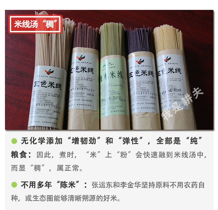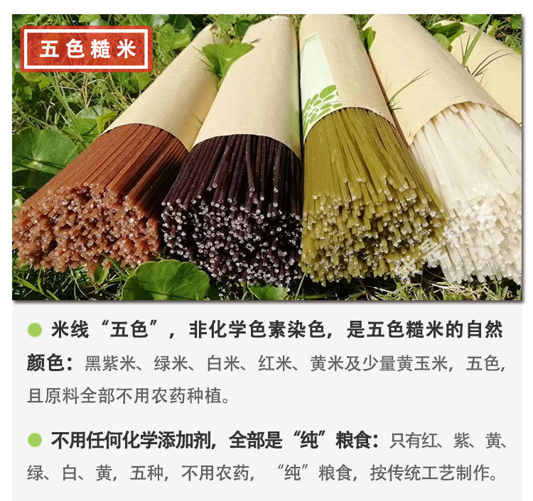 五色米线:生态黑紫米、绿米、白米、红米、黄米及少量黄玉米五色