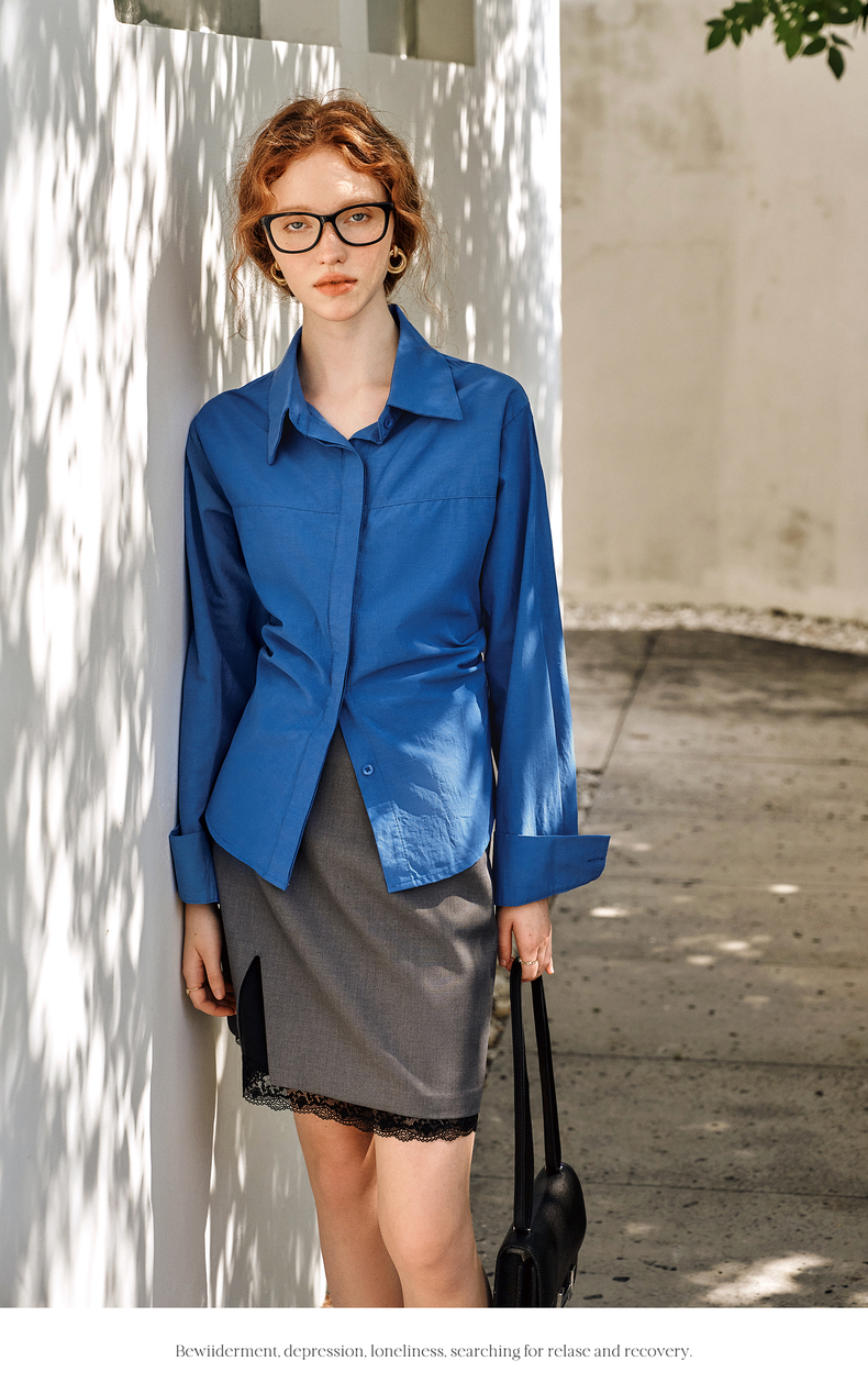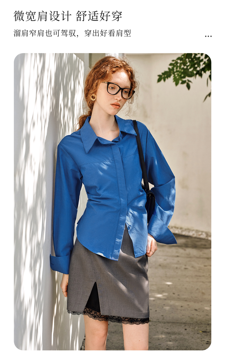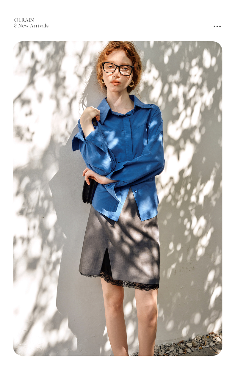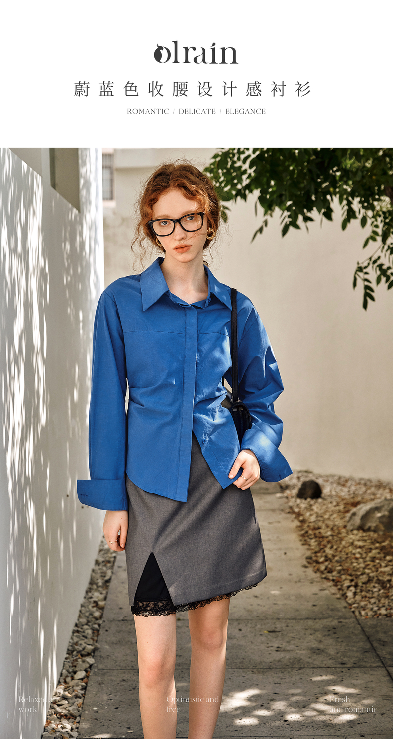OLrain欧芮儿蓝色长袖衬衫女春季2025年新款通勤收腰设计感衬衣