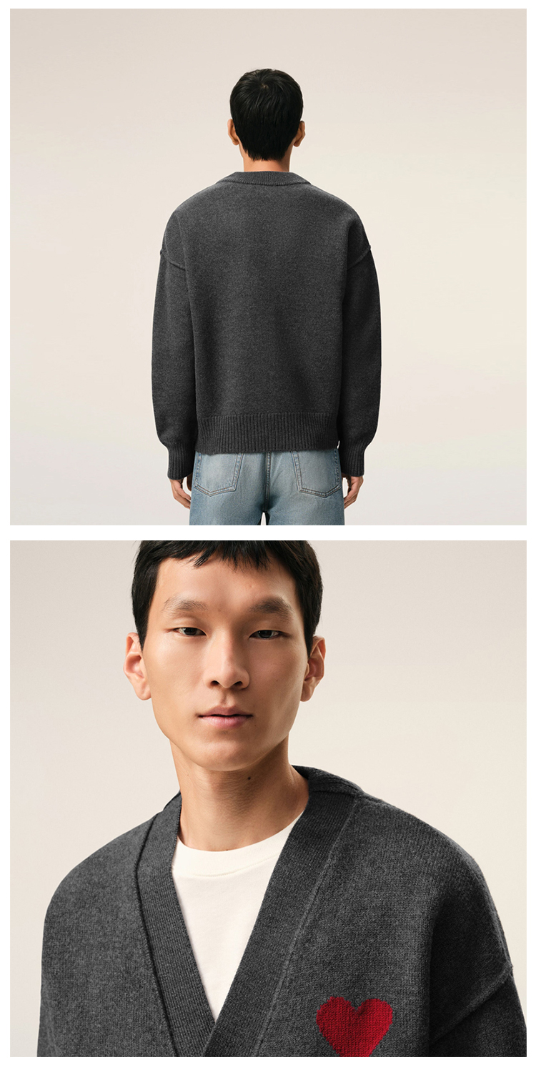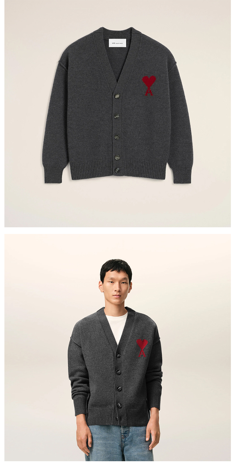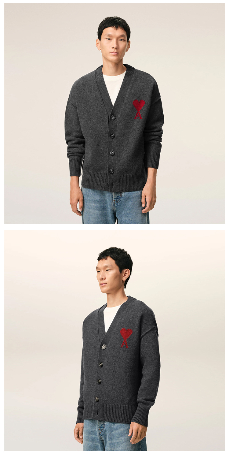 AMI 男女同款心形徽标刺绣嵌花羊毛针织开衫 深灰色 UKC367 U018 084