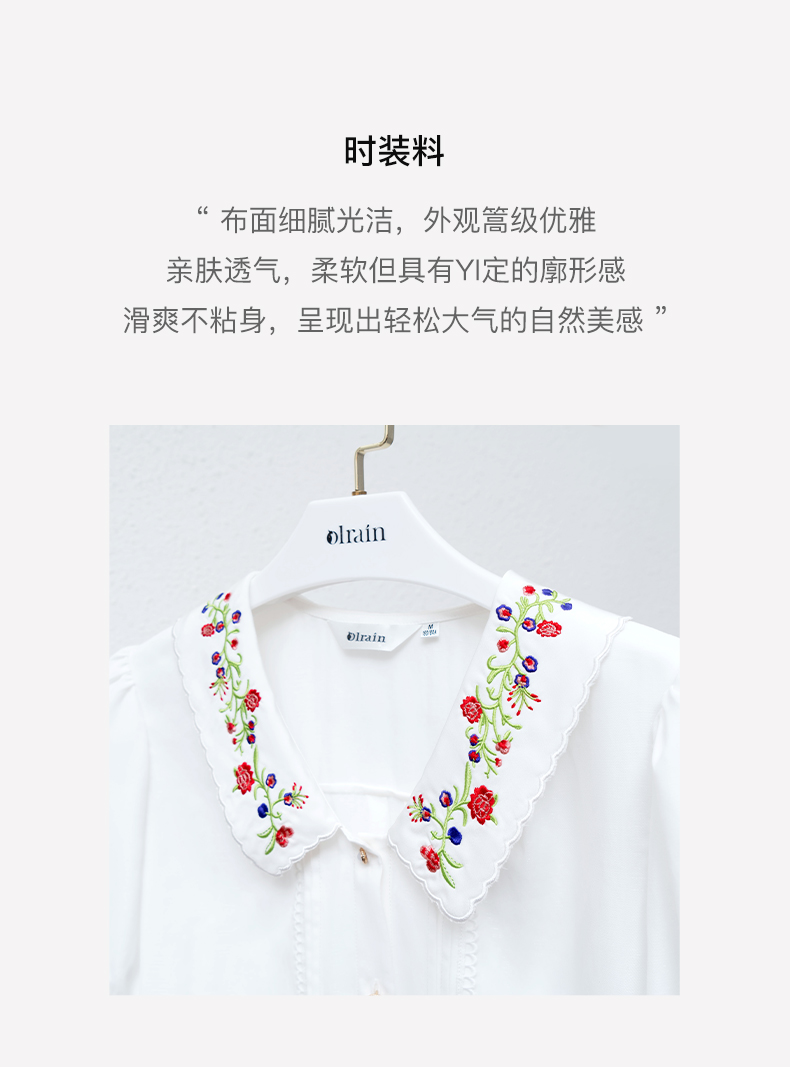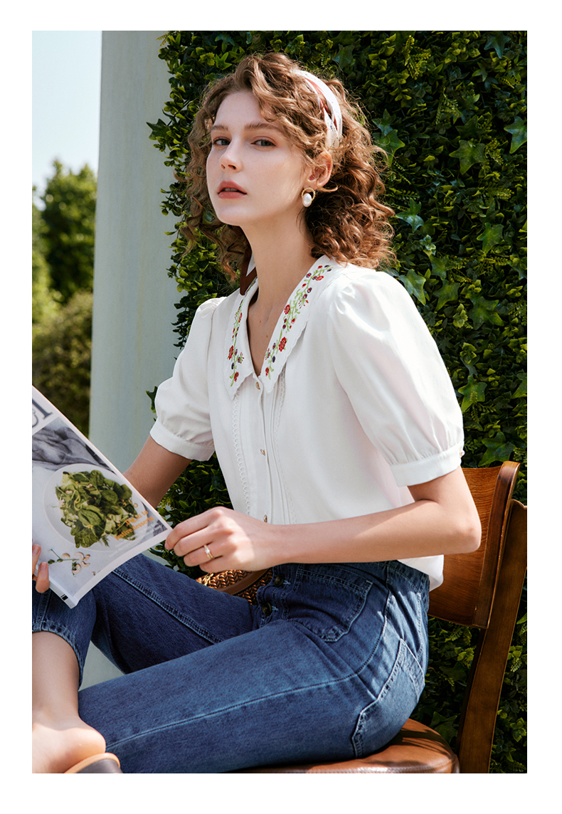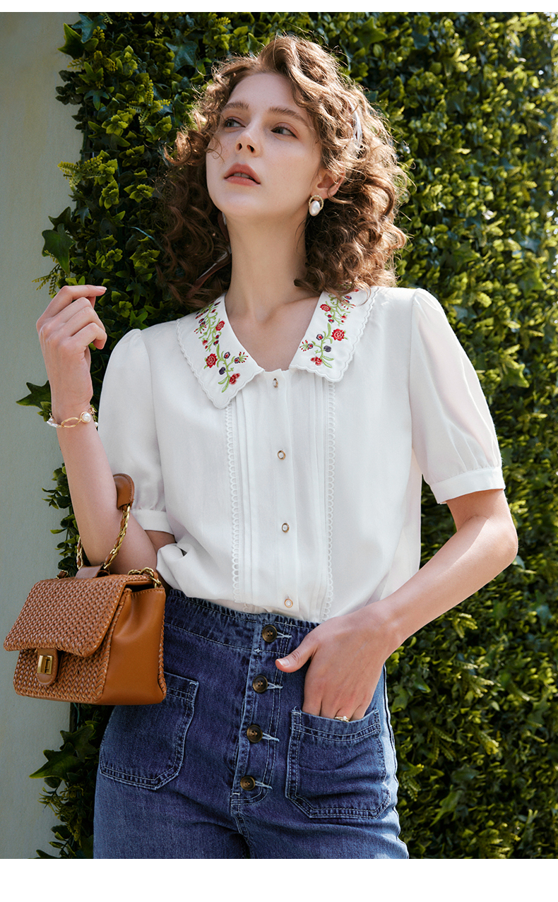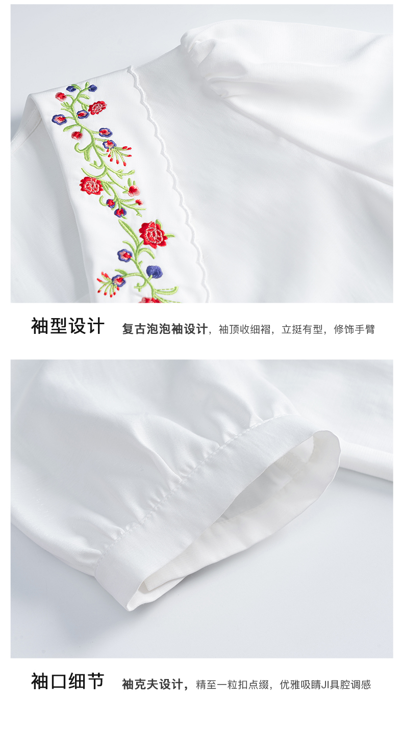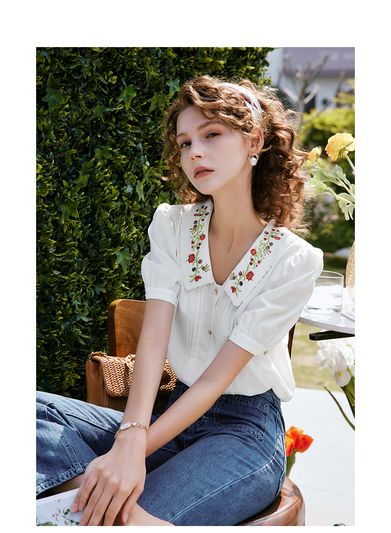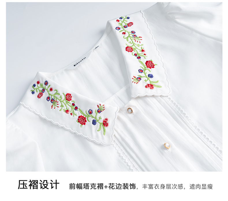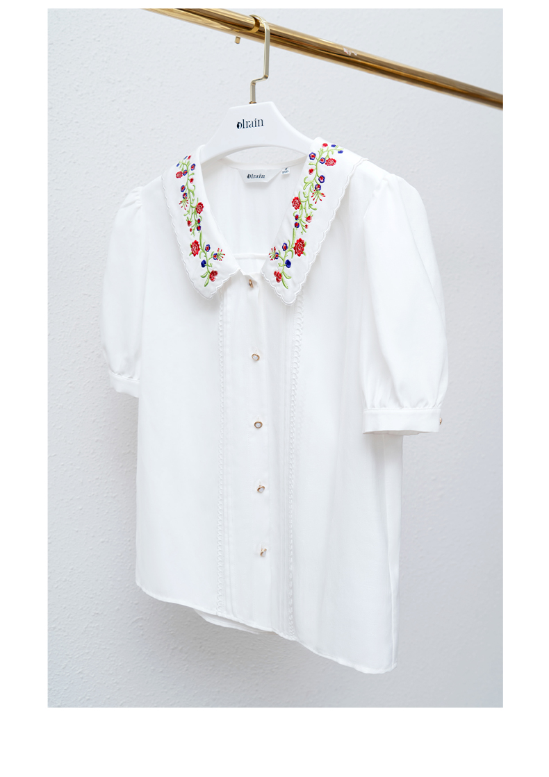 OLrain法式高级穿搭白色娃娃领衬衫女夏季2022新款刺绣泡泡袖衬衣