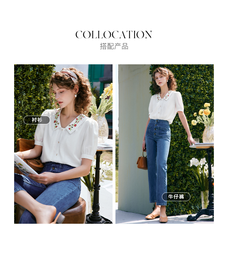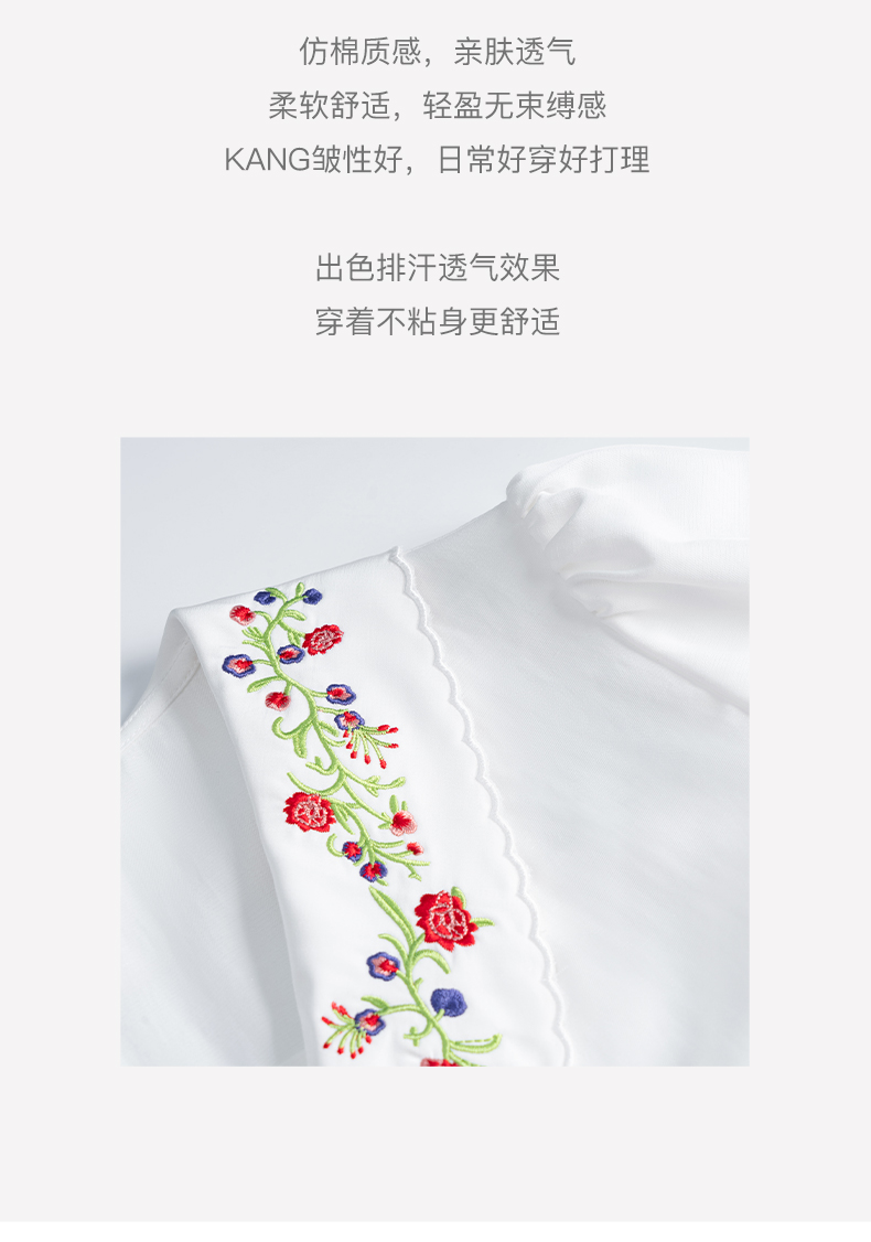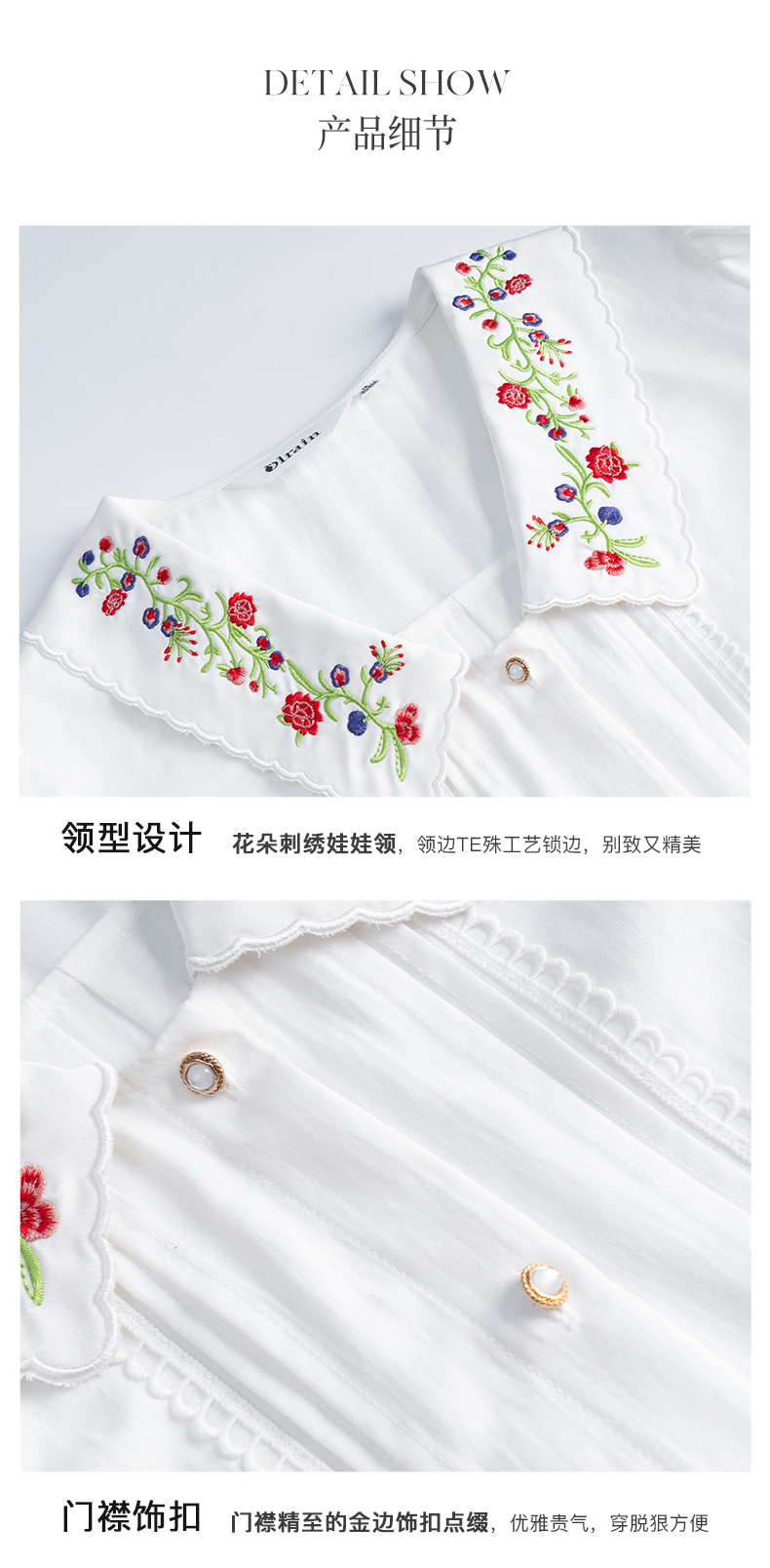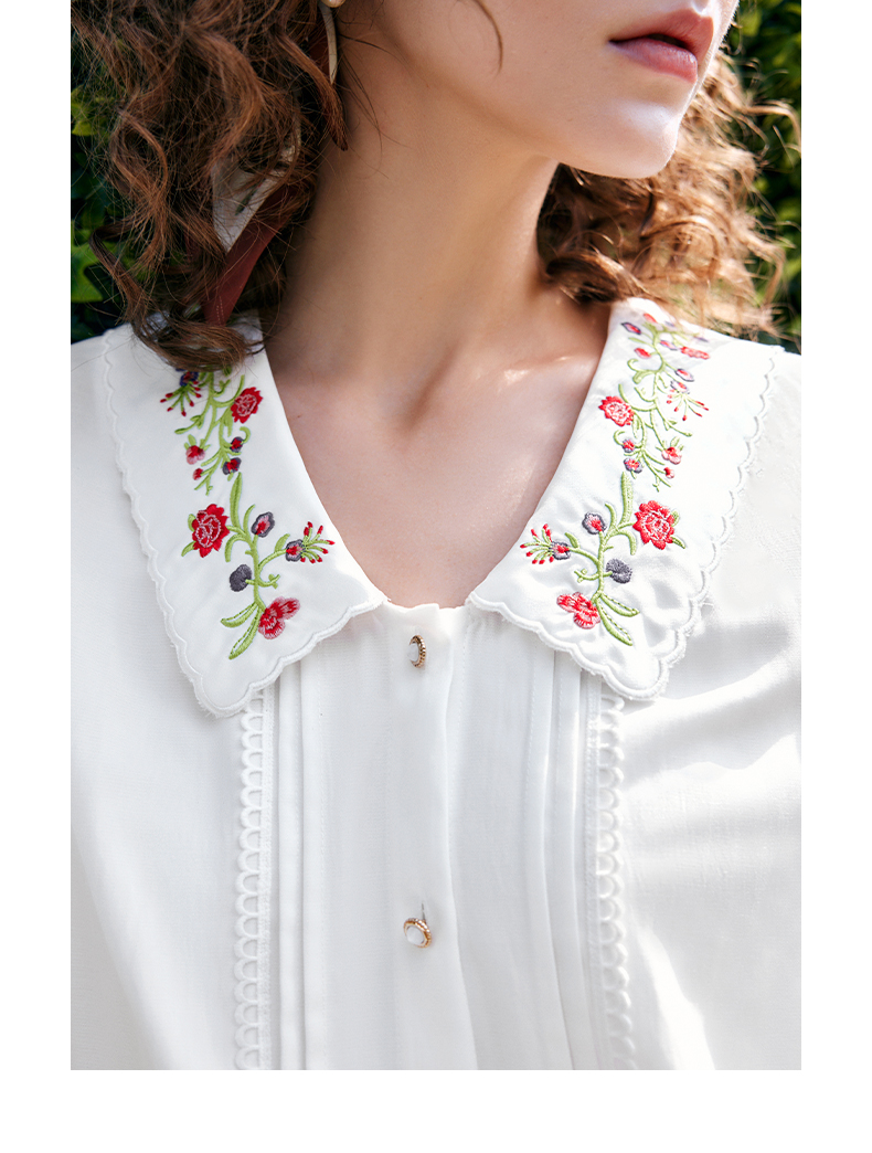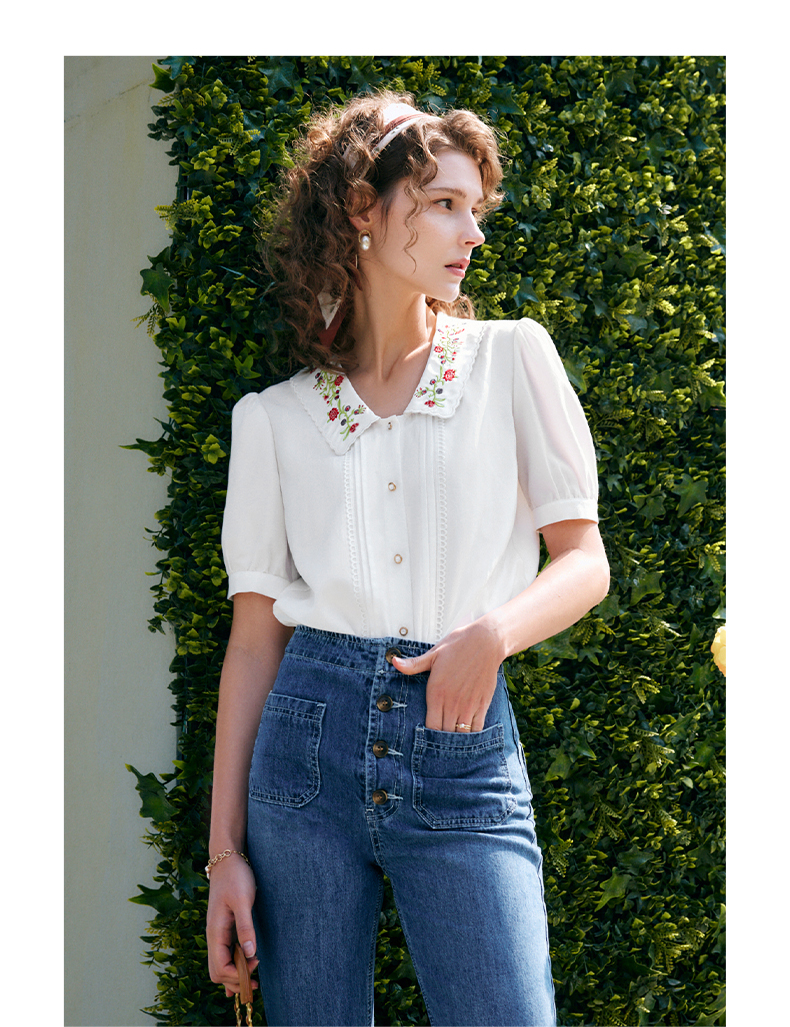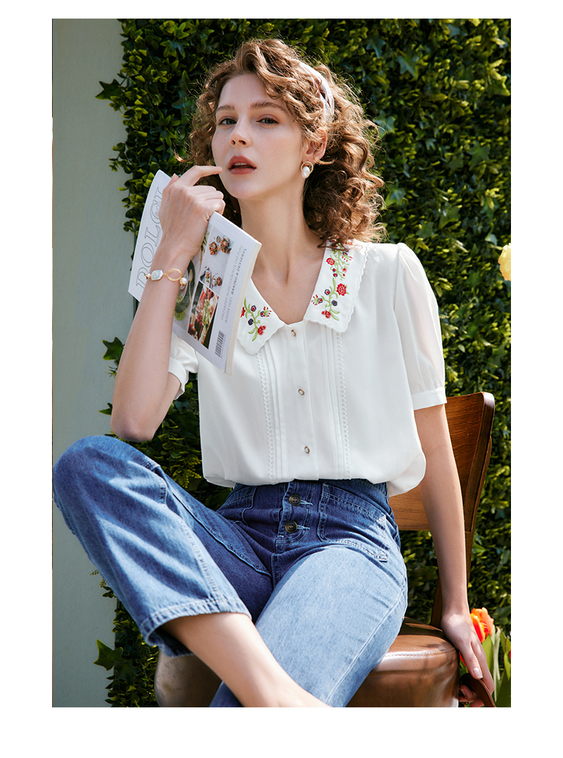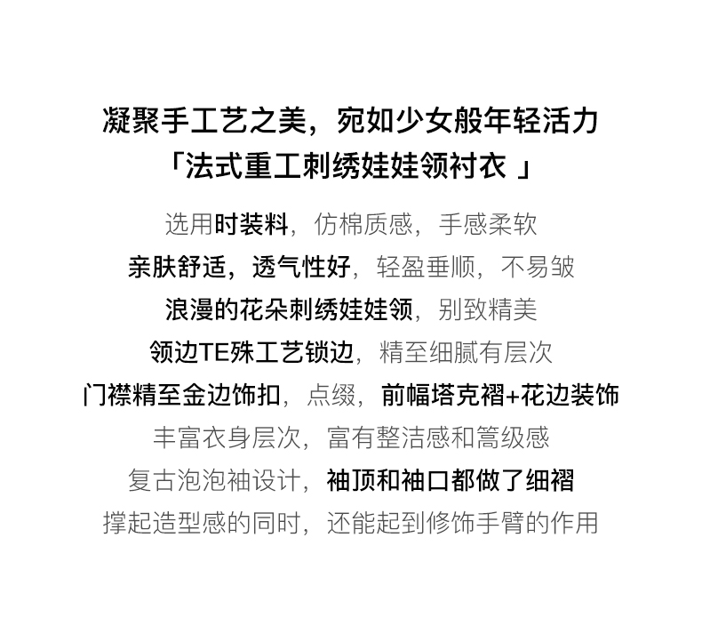 OLrain法式高级穿搭白色娃娃领衬衫女夏季2022新款刺绣泡泡袖衬衣