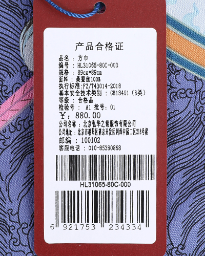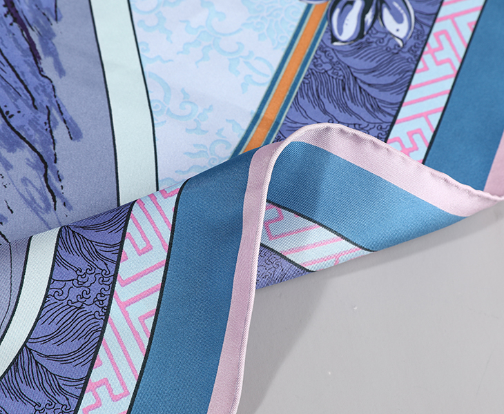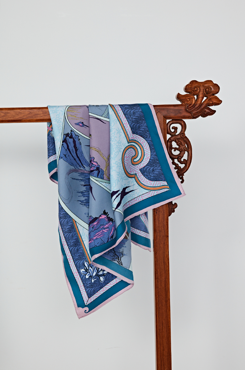 这幅地图的出现以实物证明了在西方地图传入中国之前中国对世界地理,特别是对于丝绸之路沿线已经有清晰的认识。蜿蜒两万公里的丝绸之路,是古人经济文化交流的重要纽带,延绵数千年的丝路历史,是世界文明的辉煌诗篇。此款丝巾选取了丝绸之路以嘉峪关为重点的几个重要的关口进行重新整合描绘;不同色度的几何方块与此图独具特色的海水纹结合,继承传统纹样的同时,不失现代主义风格;颜色撞色明亮、清新淡雅;是提亮整体造型的必备单品。