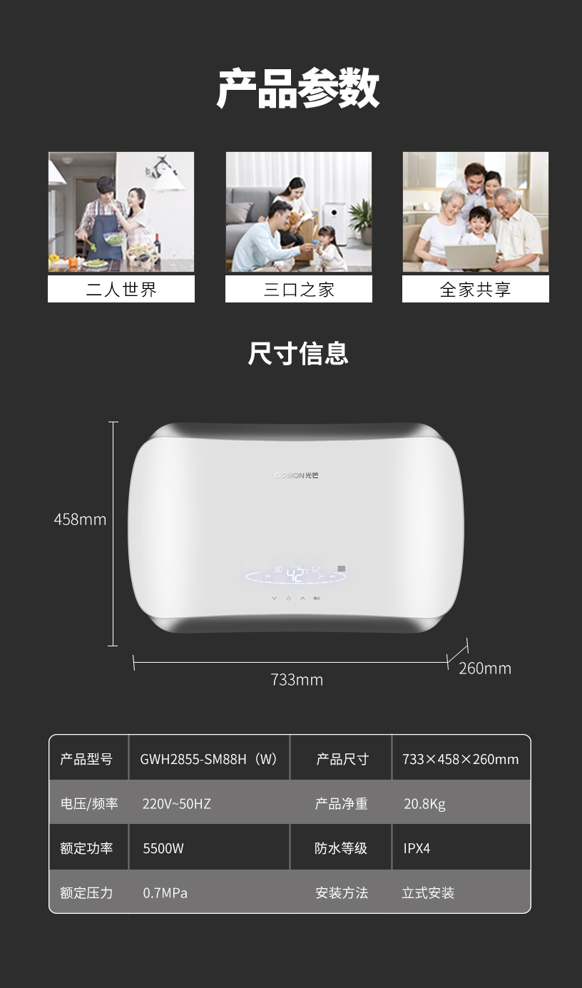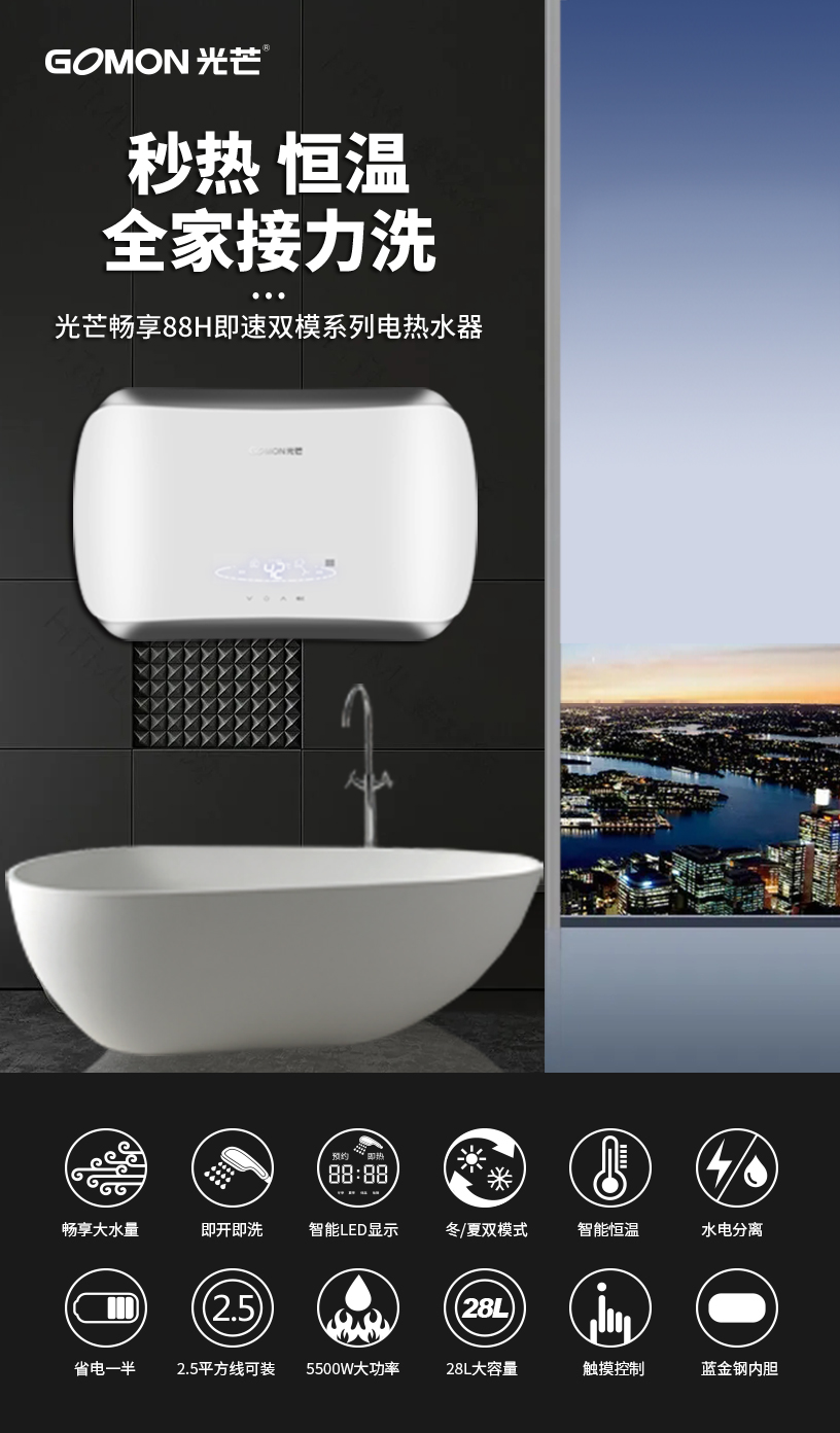 光芒 GOMON 即速双模系列电热水器 秒热智能恒温 2.5平方线可装 节能省电 水电分离 88H