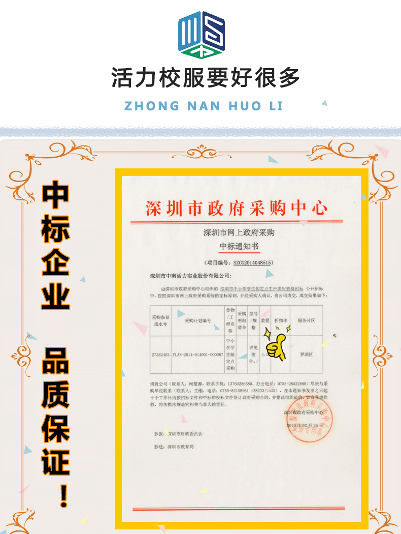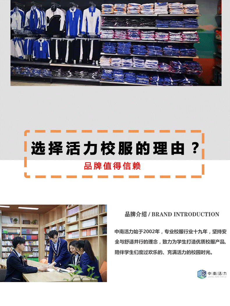 活力校服由深圳市中南活力实业股份有限公司创建的品牌,深圳二十一年老品牌,教育局中标企业;主营深圳校服、广州校服、东莞校服、佛山校服、肇庆校服、江苏校服、鞋袜、学生床上用品等学生课桌椅一站式教育领域产品