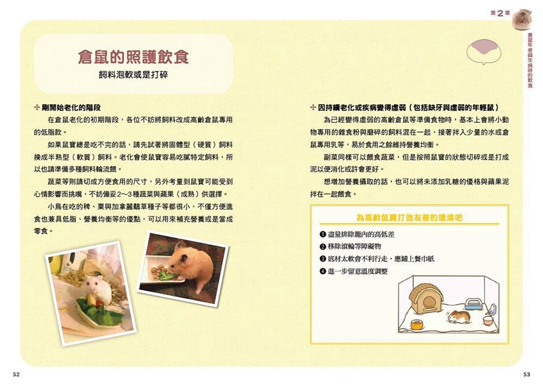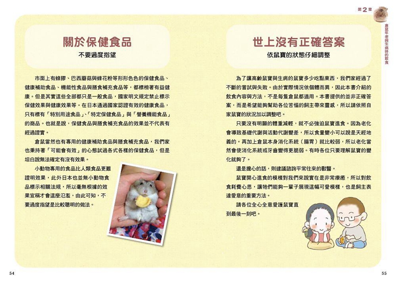 本書從七大營養素的功能、存在於哪些食材開始詳述,再從倉鼠的角度切入,提示各營養素的理想攝取量,以及飼料、蔬菜與零食要採5:4:1的黃金比例。