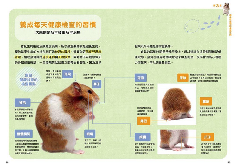從平時的環境清潔、溫溼度管理,到維持適度的運動量與正確的飲食,再加上每日的身體檢查,本書將分類詳細指導如何為倉鼠建立鞏固健康的三道牆。