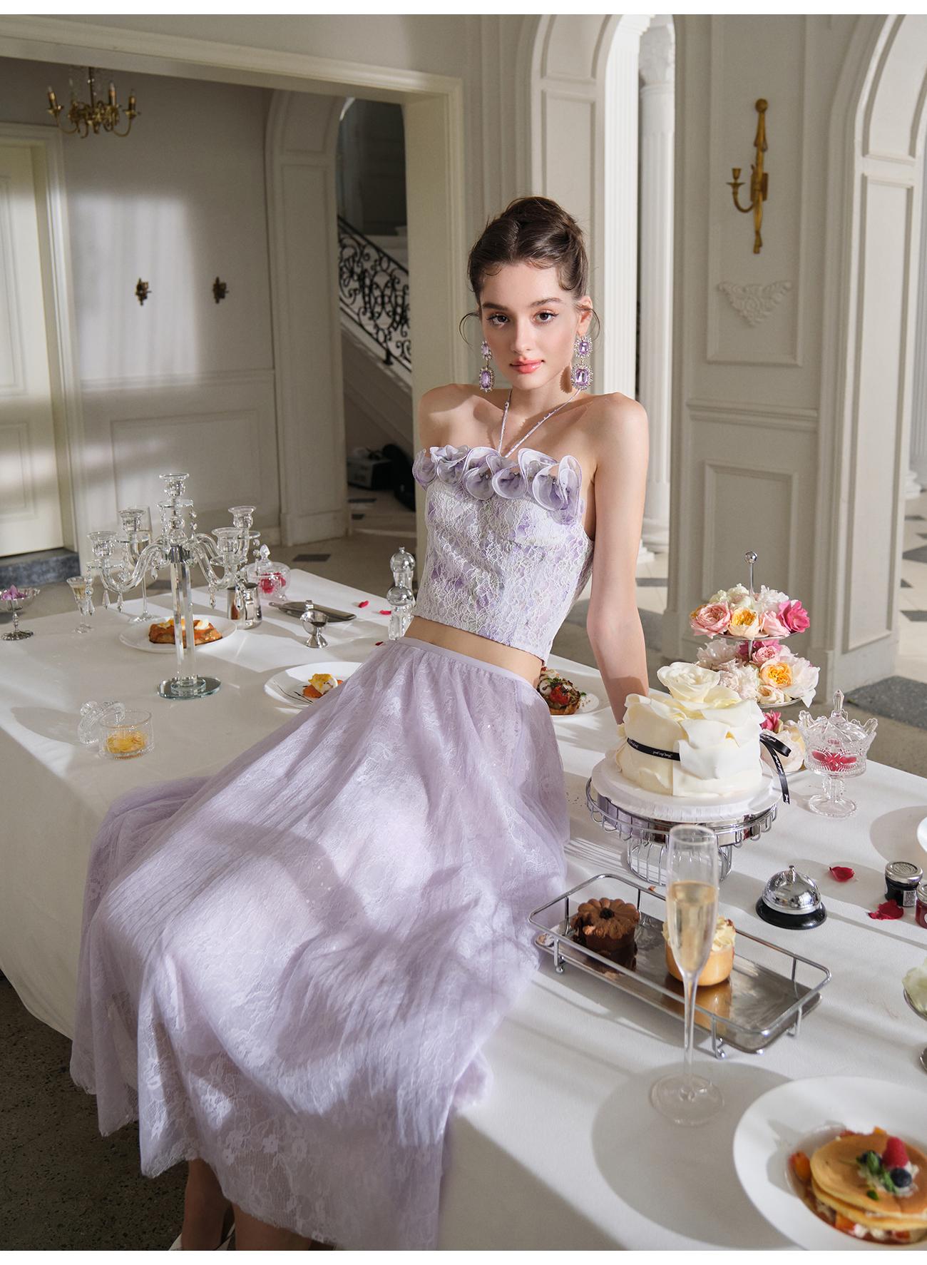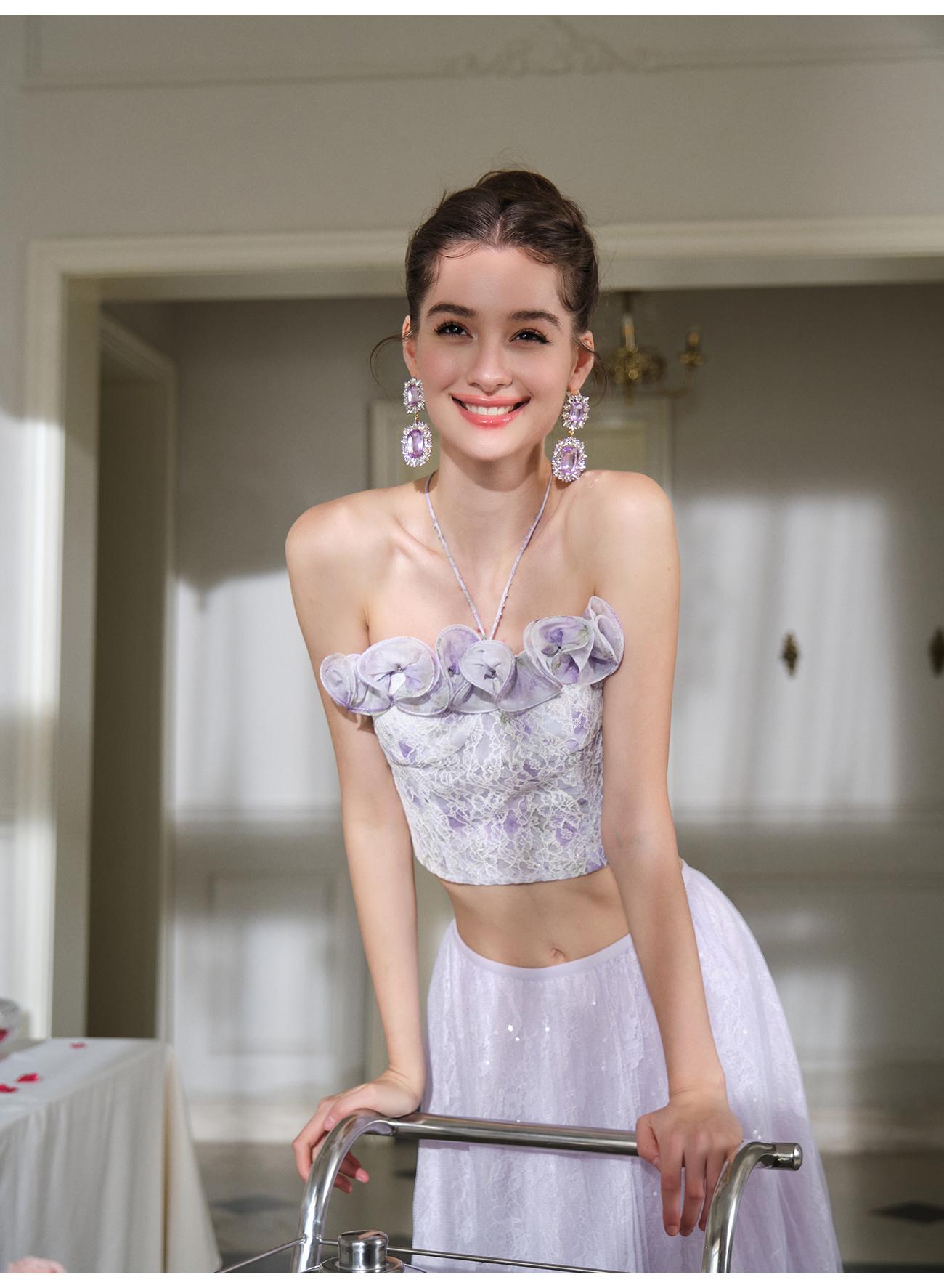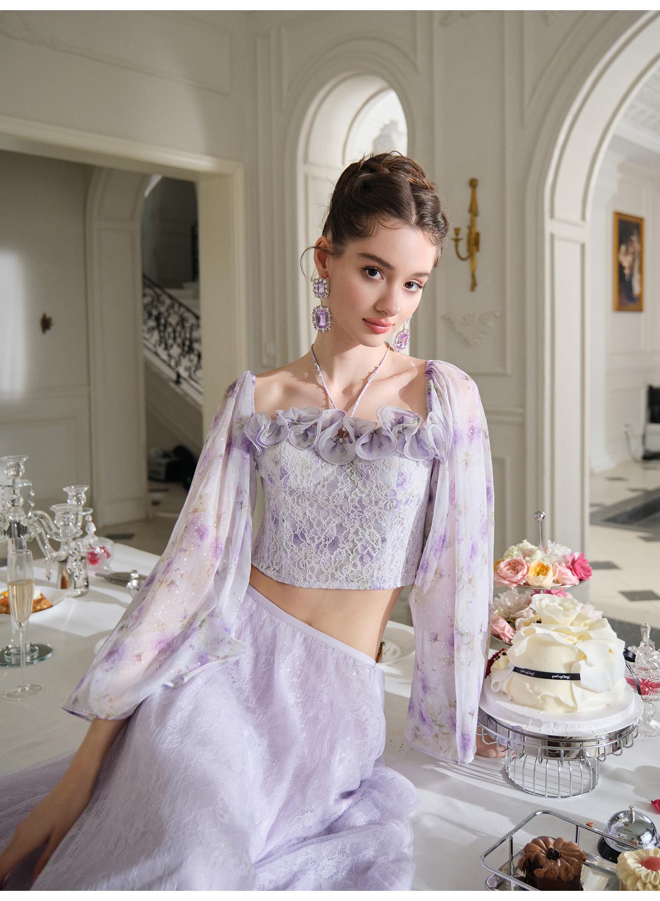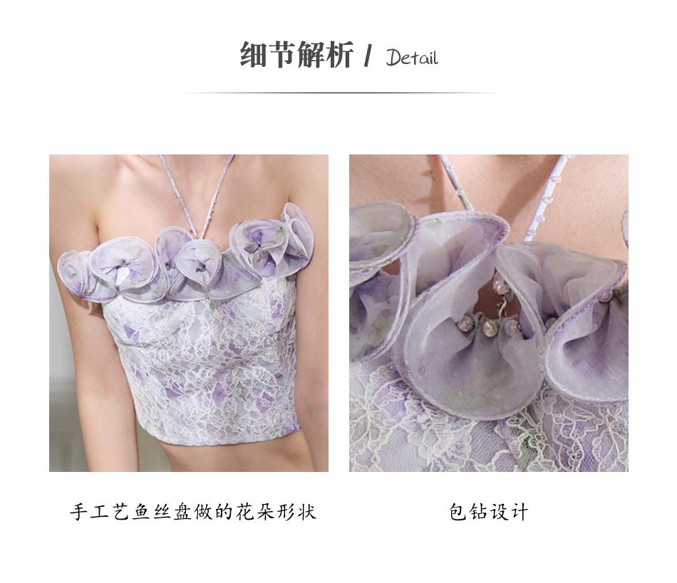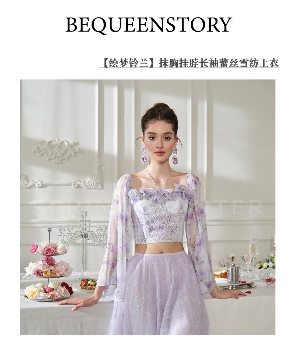 余潇潇【绘梦铃兰】设计感抹胸挂脖长袖立体花朵装饰蕾丝雪纺上衣