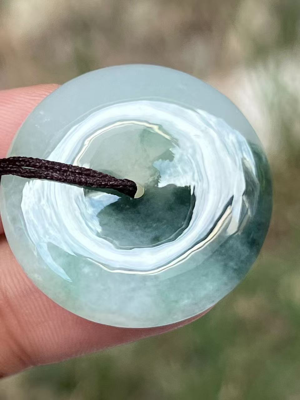 天然A货翡翠,冰润底子澄澈如水,幽幽兰花翩然绽放,似墨韵染宣,清雅自成。手工精雕平安扣,形如满月,佩之温润生香。每一缕飘花都是时光的笔触,戴一份文人风骨,藏一世平安喜乐。