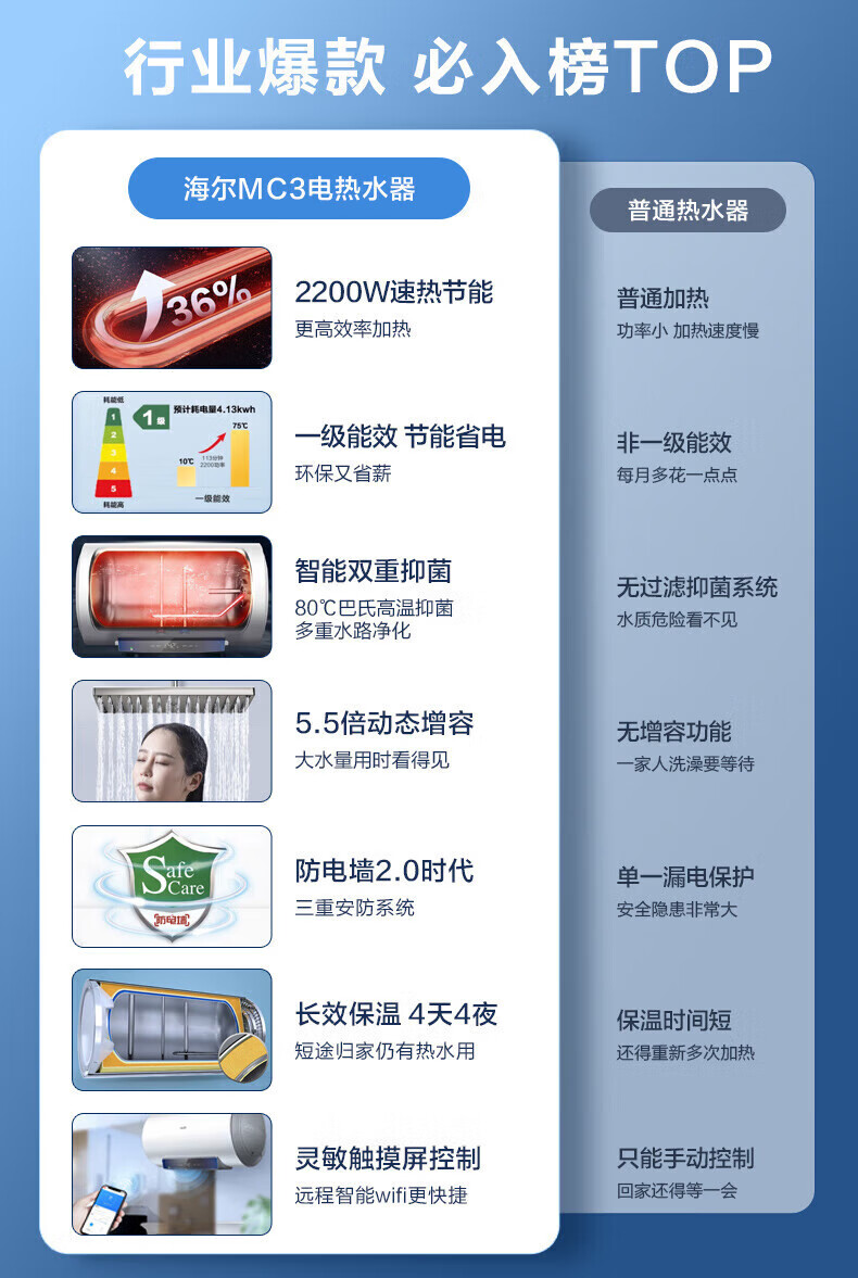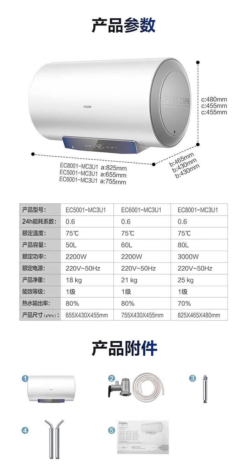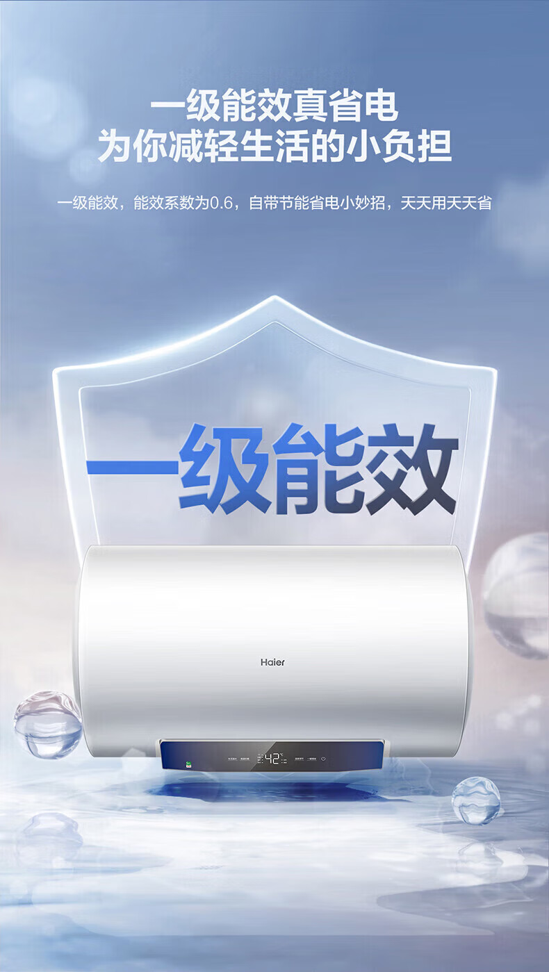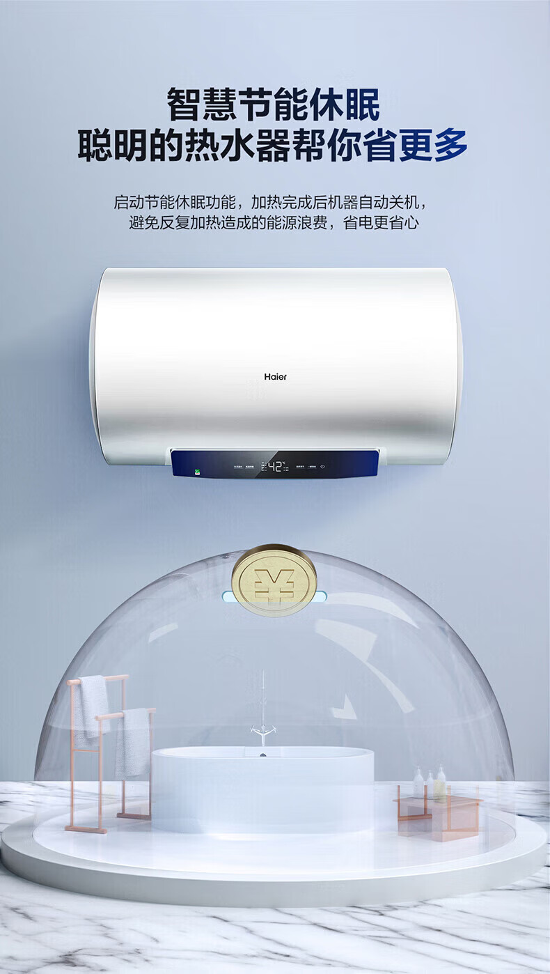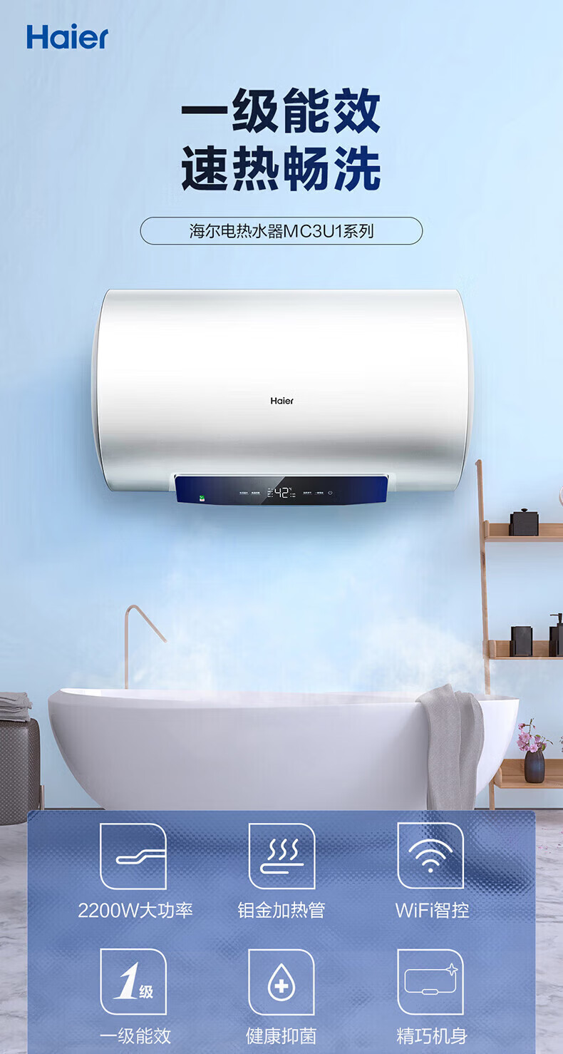 海尔家用50L电热水智能WIFI储水式卫生间洗澡一级能效变频 50L 2200W EC5001-MC3U1防电墙