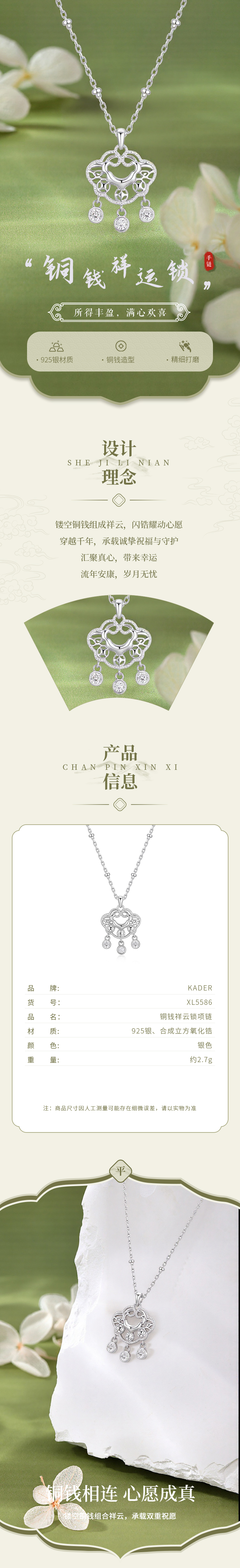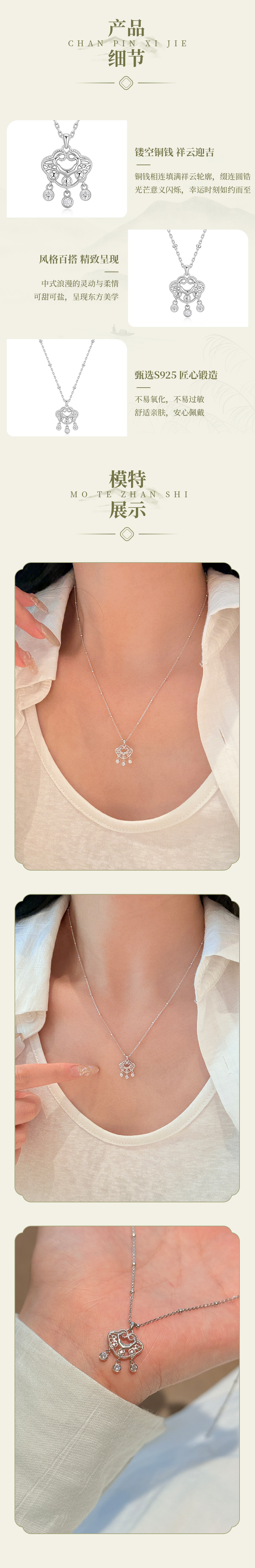 卡蒂罗KADER 铜钱祥云锁项链 新中式国潮925银镂空铜钱古典设计锁骨链 灵动好运简约百搭