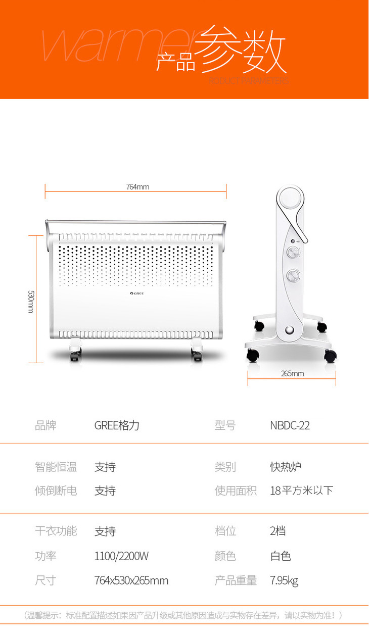 格力(508963)(GREE)电暖器NBDC-22 居浴两用 IPX4级防水 一体干衣取暖 过热保护 防水欧式快热炉省电速热家用取暖器