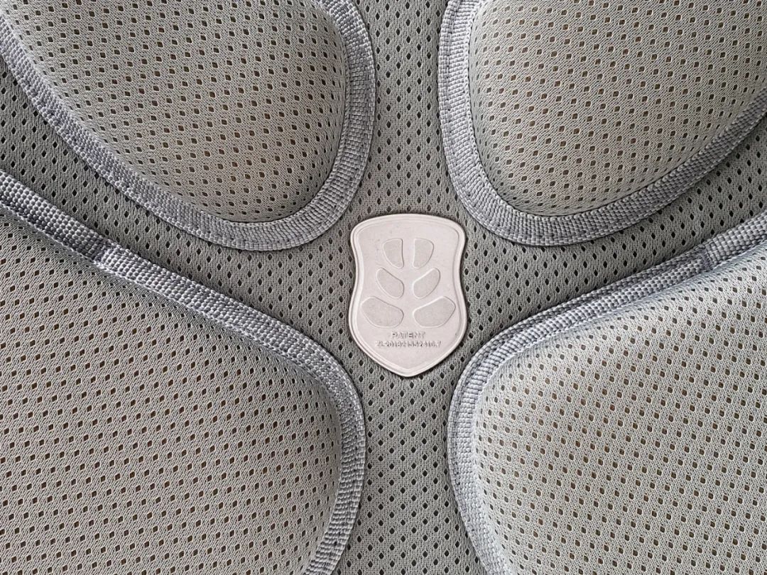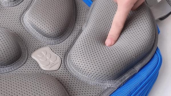 最上面两块凸起承托孩子的肩胛骨,中间两块承托腰背,下面两块承托腰部。再配合胸扣和腰扣,把原来集中在肩部 2 个受力点的重量合理分散到 9 个受力点上,肩上的压力小了。孩子就算蹦蹦跳跳背着自然轻快。