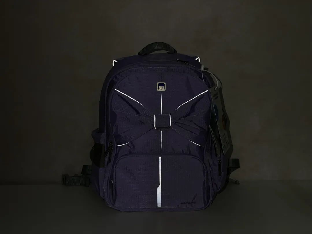 贴心的设计是真的很多,首先就是夜间反光条。书包的正反面都配备了夜间反光条,并且是延伸到侧面也能看到的那种。在天气不明朗、光线昏暗的时候,能够提醒往来车辆注意减缓车速,让孩子在夜里行走容易被发现,更安全。