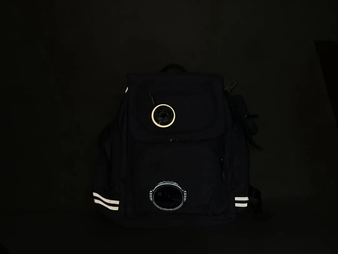 2、反光条多,夜晚走路更安全。正面6条反光条,侧面和背面的反光条主要是在肩带上面。与其他款式不同的点就在于,它的反光条保留了航天的形象。