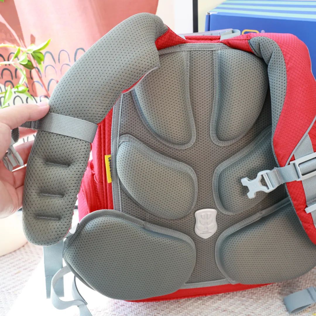 和变形金刚一样都是6D"自塑形"3.0系统,它的背部(包括肩带)是由6块对称的高弹海绵垫组成,不仅吸力减压,保护孩子脊椎;凹处像树干一样的导气槽设计,也能让孩子背部更清爽透气,不容易闷热闷汗。