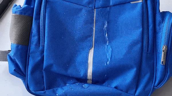 防尘防泼水设计,并且是速干的材料。模拟下雨天,往书包上倒水,水全是浮在表面的,没有渗透进去,就不用担心下雨天弄湿书本了。