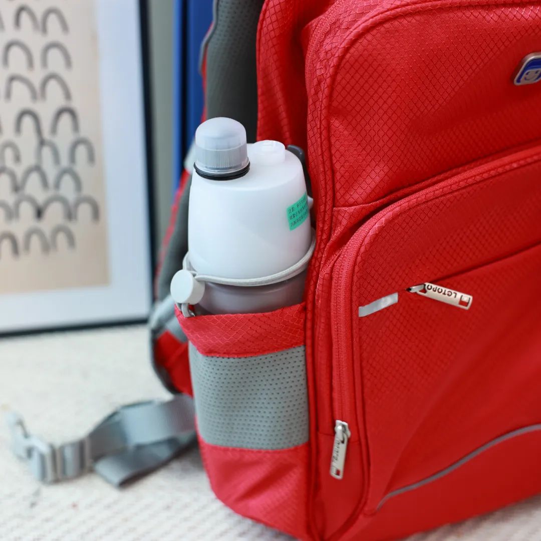 书包的两侧有收纳袋,一侧是专门给水杯的置放区,有双重搭扣可固定,防止水杯掉落;另一侧则是带有拉链的小格子,方便孩子随手拿出。